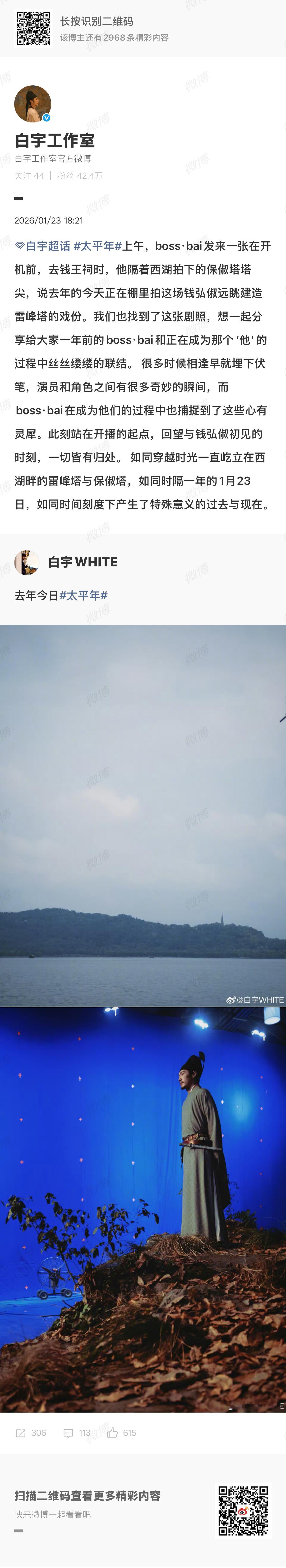 白宇一年前看这个塔一年后看那个塔 从保俶塔到雷峰塔,直线距离不过三公里,白宇却走了一年。这一年,是钱弘俶从历史走进镜头的旅程,也是演员从角色中走回现实的交错。开机前的一次驻足,开播日的一场呼应——仿佛塔与塔之间,有一条只属于他的时空隧道。戏如人生,人生亦如戏,每一步都算数。