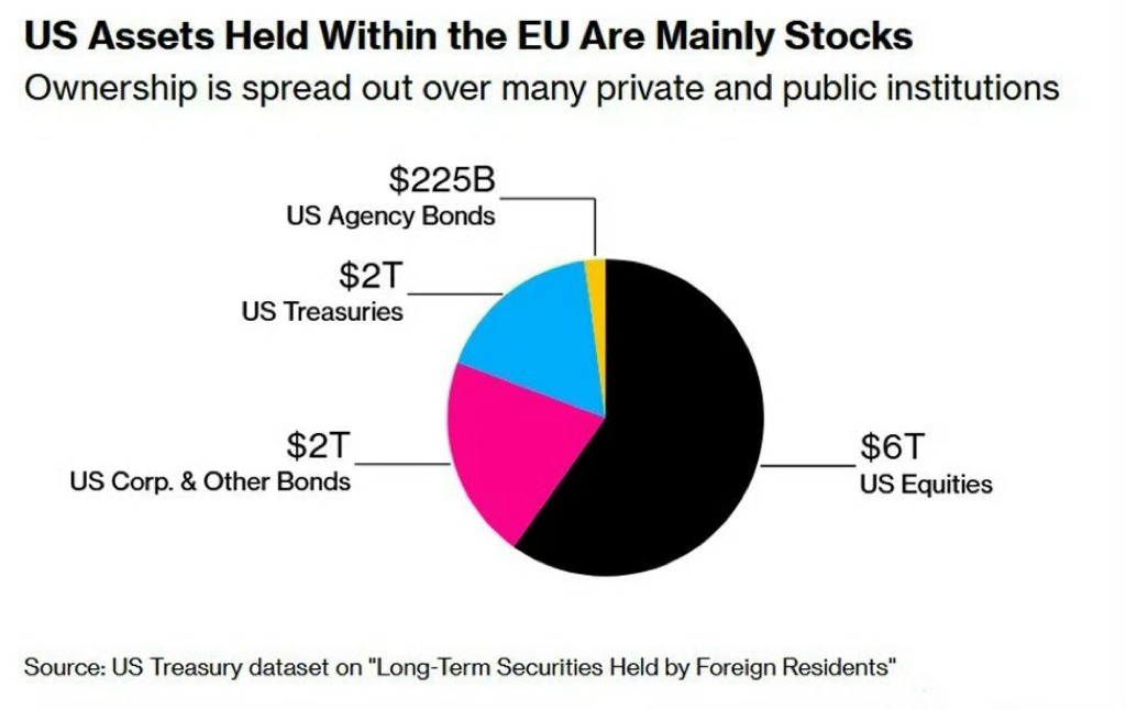 欧盟持有的美国资产规模庞大:根据美国财政部的数据,欧盟投资者目前持有价值 10 万亿美元的美国资产,创历史新高。美国股票占比最大,达 6 万亿美元,约占欧盟总持仓的 58%。与此同时,欧盟持有的美国国债约为 2 万亿美元,约占总额的 19%。如果将范围扩大到欧盟以外,包括英国、挪威和瑞士在内的所有欧洲国家,约占所有外国国债持有量的 40%。欧盟投资者还持有价值 2 万亿美元的美国公司债券和其他债券,以及价值 2250 亿美元的机构债券。欧洲对美国的金融敞口从未如此之大。