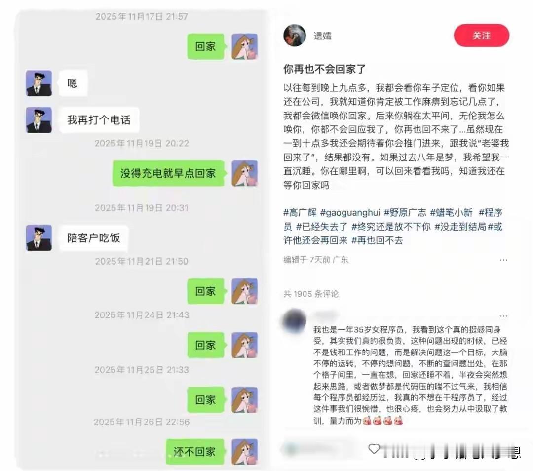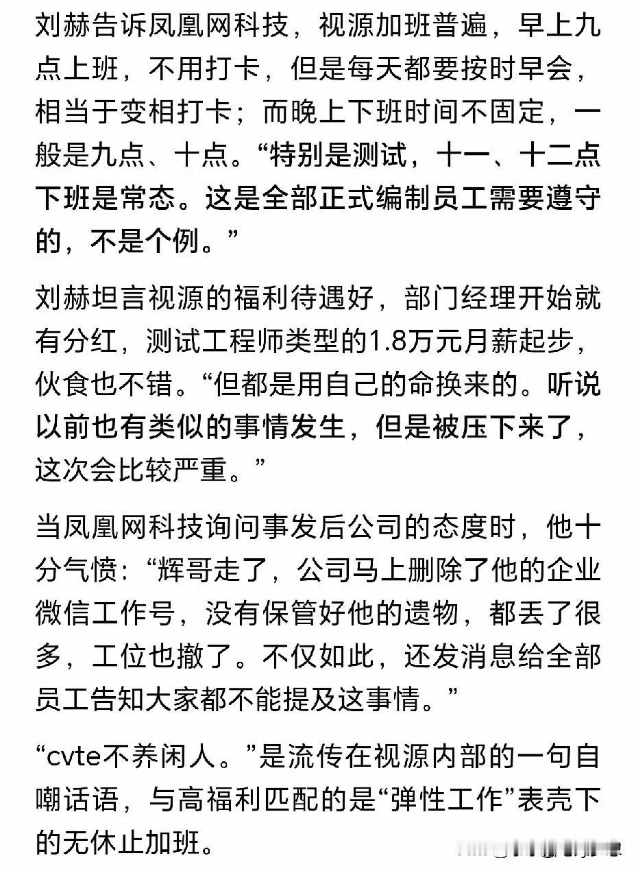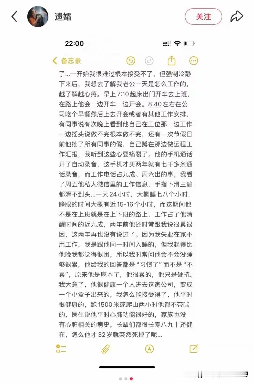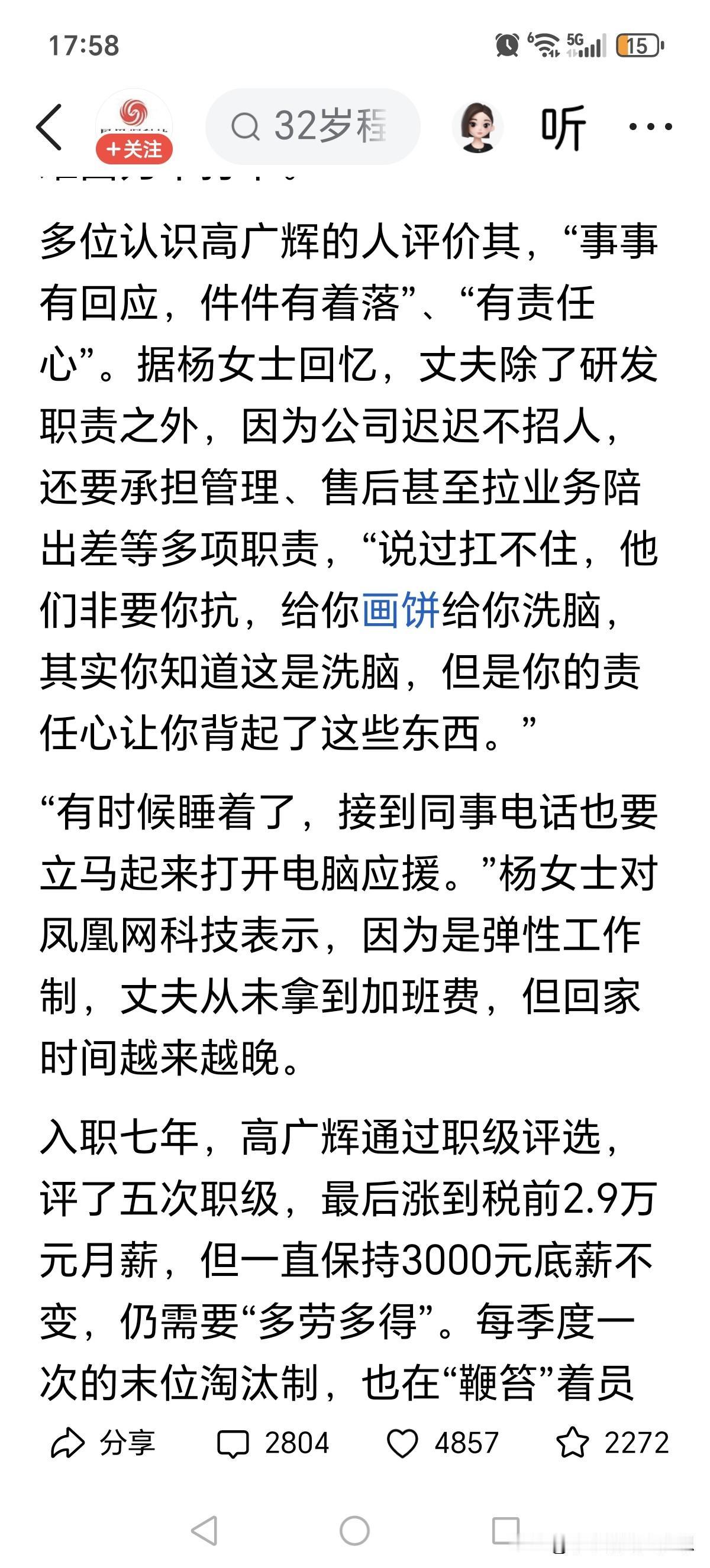 视源股份32岁猝死的高广辉的妻子找到了官方的凤凰科技媒体爆料,这家公司太会算计了,直接警告她如果对她的行为对公司造成了负面的影响,还要她赔付违约金50万。 事实上,公司只给了39万做人道主义赔偿,高广辉的妻子说,其实这个就是老公死后公司给她老公办理离职n+1的赔偿,说的好听一点,是人道主义,但实际上就是封口费。 其实这个事情最离谱的是公司不配合认定工伤,而她的公公还想提前分财产,她告知媒体这39万到她手的话,可能只有4到6万块钱。 高广辉的妻子也曾经提过她的老公加班是没有加班工资的,但是加班是常规,经常一大早就去上班了,到了晚上9点多钟10点钟才回家,因为他的底薪面只有3000元,但工资每个月能得到差不多30000块钱,实际上,得到这个钱一点都不容易,因为这月薪直接挂钩绩效和提成。公司每个月都会举行一次末尾淘汰赛,所以这是等同于从后面撵着你跑,你跑不了,那你得下来,而她的老公责任心强而且因为两人还在还房贷,那就得玩命的向前冲。 本来高广辉的妻子想通过工伤来索取赔偿,正常的情况下如果工伤认定成功的话,赔偿都会上百万,所以她想要通过打官司的方式争取多一点的赔偿,但是律师直接告知,这事情没那么简单,如果要认定工伤的话,要公司配合才行,而这个公司,它上下班是不用打卡的,实际上这所谓的弹性工作制,就是无偿加班的遮羞布。 而一般的公司,它不会很主动的配合工伤认定的,主要是如果配合工伤,那无疑是曝光了公司“强制”性加班违规的问题,也怕一旦承认了,所有员工都会因为这个事情集体维权,也怕影响公司的股票。 而他的妻子在衡量利弊的过程中,应该也考虑到,他这种认定工伤确实比较难,毕竟他当时确实没在没在工作岗位上,而工伤认定法规的10条(7个认定,3个视同)要提供证据,也要公司配合,但问题是她老公死了之后,他的东西公司基本都没给保存,而这个事情又属于民事纠纷,如果打起官司来,还要衡量时间成本,她咨询过相关律师,知道律师都不想接,她才选择签下了协议。 这个事情只能是一声唏嘘啊,32岁的生命代价,足以让我们警醒:职场健康和权益保障刻不容缓!在工作和健康之间要做出选择,你要永远记着“你是家里一片天,在单位仅仅是一块砖”!
