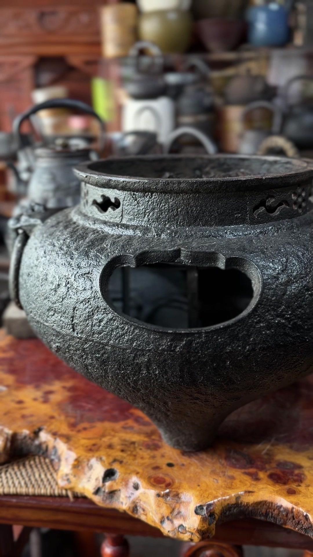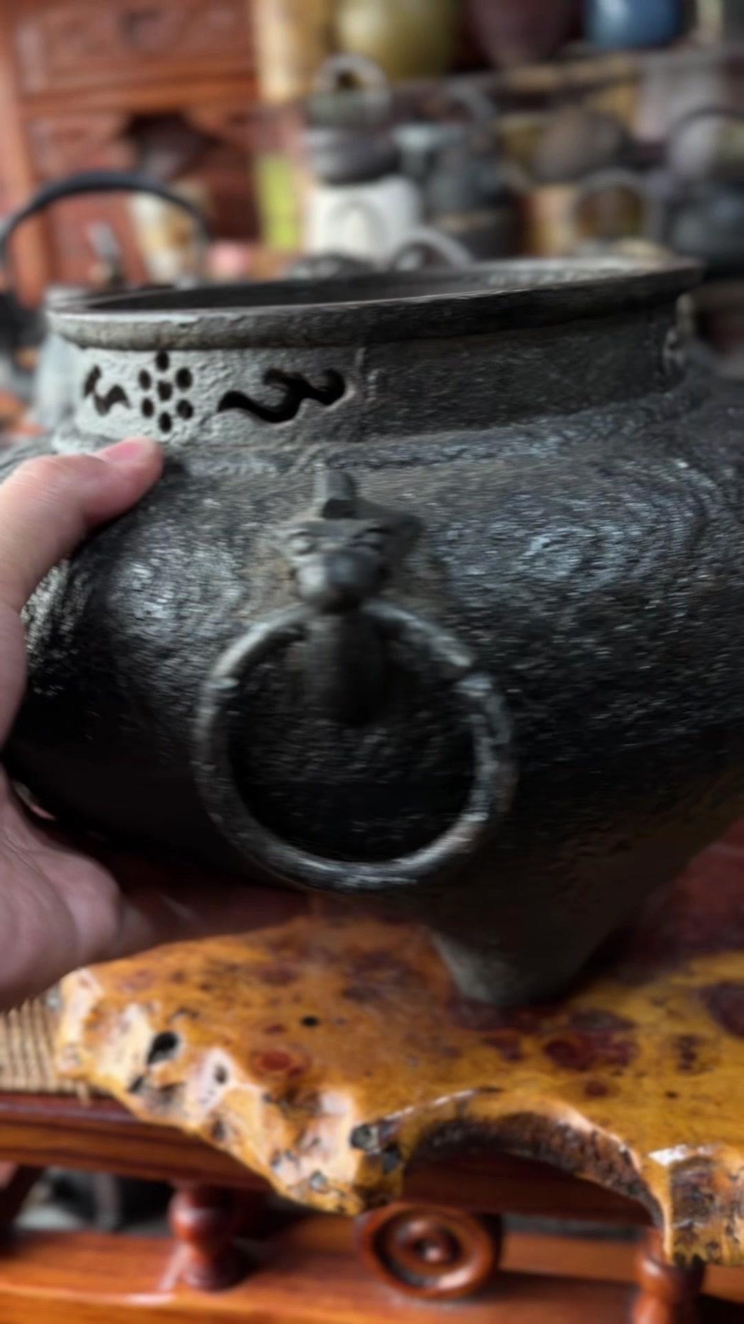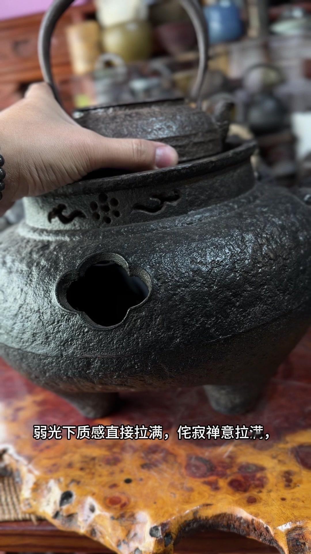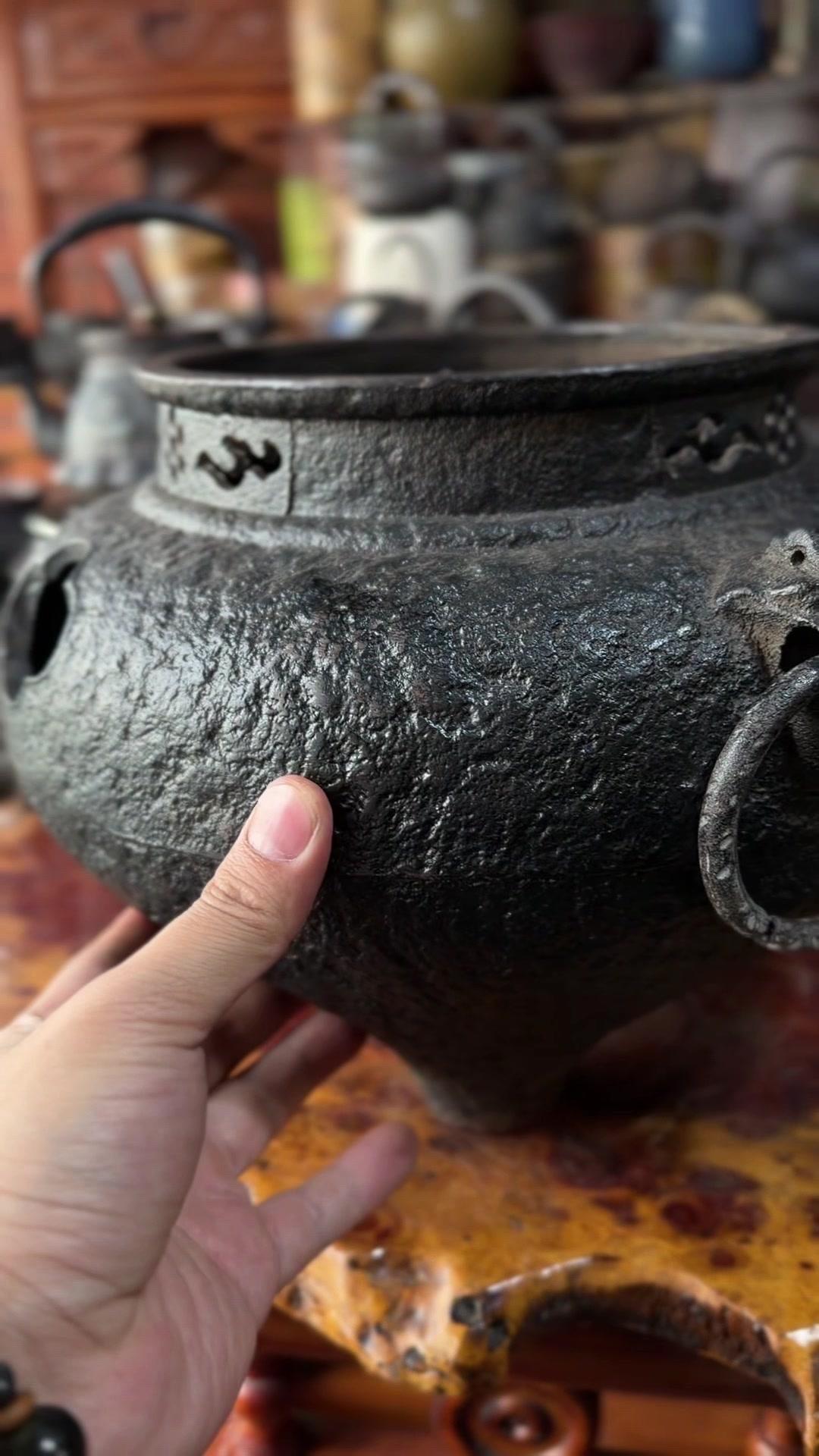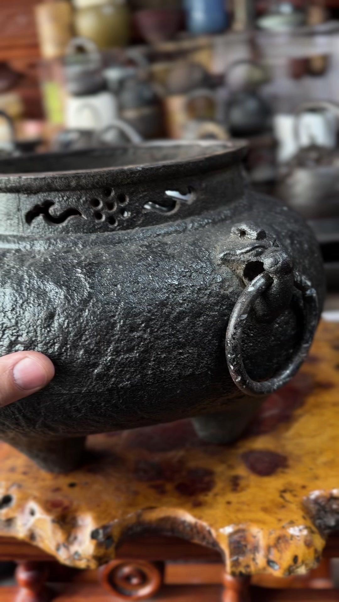 🖤昭和初期古铁鬼面风炉,真的一眼惊艳。口径20厘米,肚径26厘米,高21厘米,整器重5公斤左右,纯纯十斤沉。古铁材质铁性超棒,上手全是厚重质感,岩肌肌理摸着手感绝了,古朴又端庄。 🖤第一眼瞅着就像新石器时代的老陶罐,满是岁月的味道。一体成型的双耳孔洞超大气,鬼面刻画灵动又细腻,看着带点拙趣,越品越有味道。 🖤弱光下质感直接拉满,佗寂禅意拉满。高端茶室摆上瞬间提气场,适配野野田电炉用超合适,煮水煮茶氛围感直接拉满。百年老炉的底蕴,摆着用着都是排面。 懂茶懂器的朋友闭眼冲,这样的老物件真的很有收藏价值。