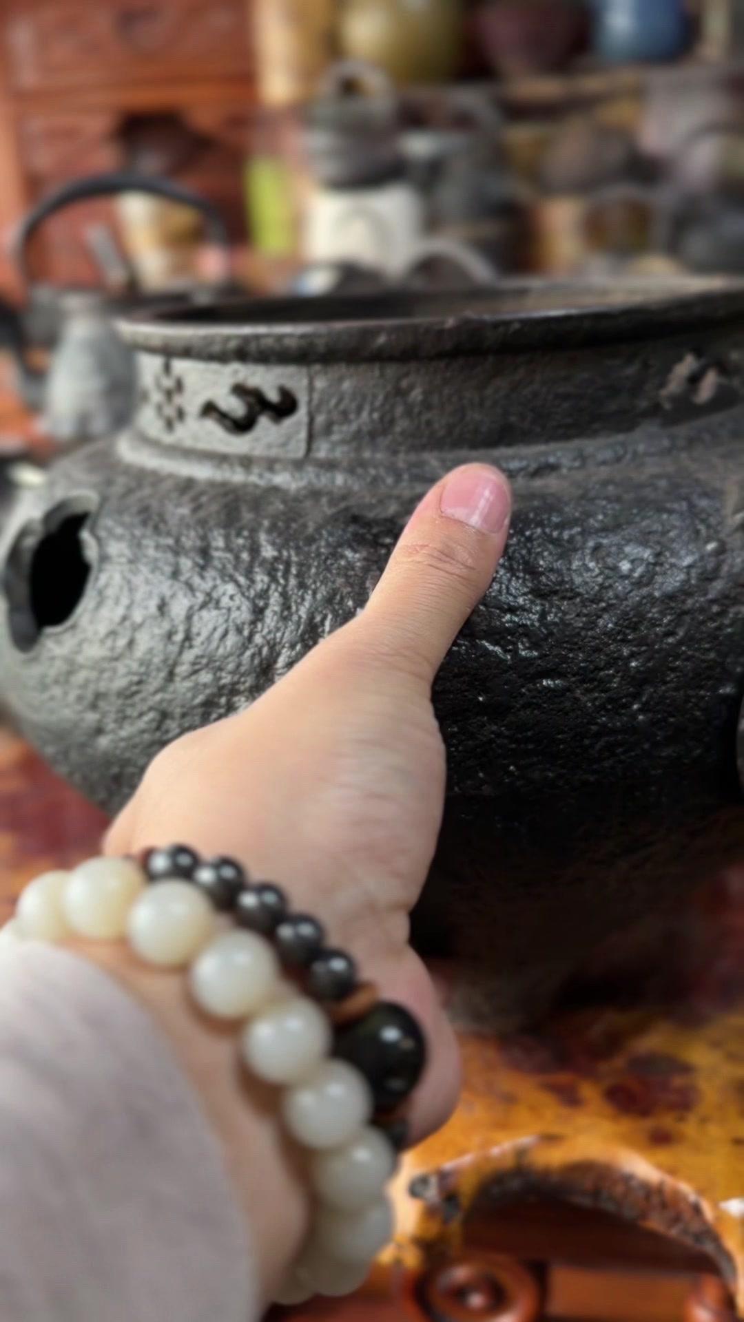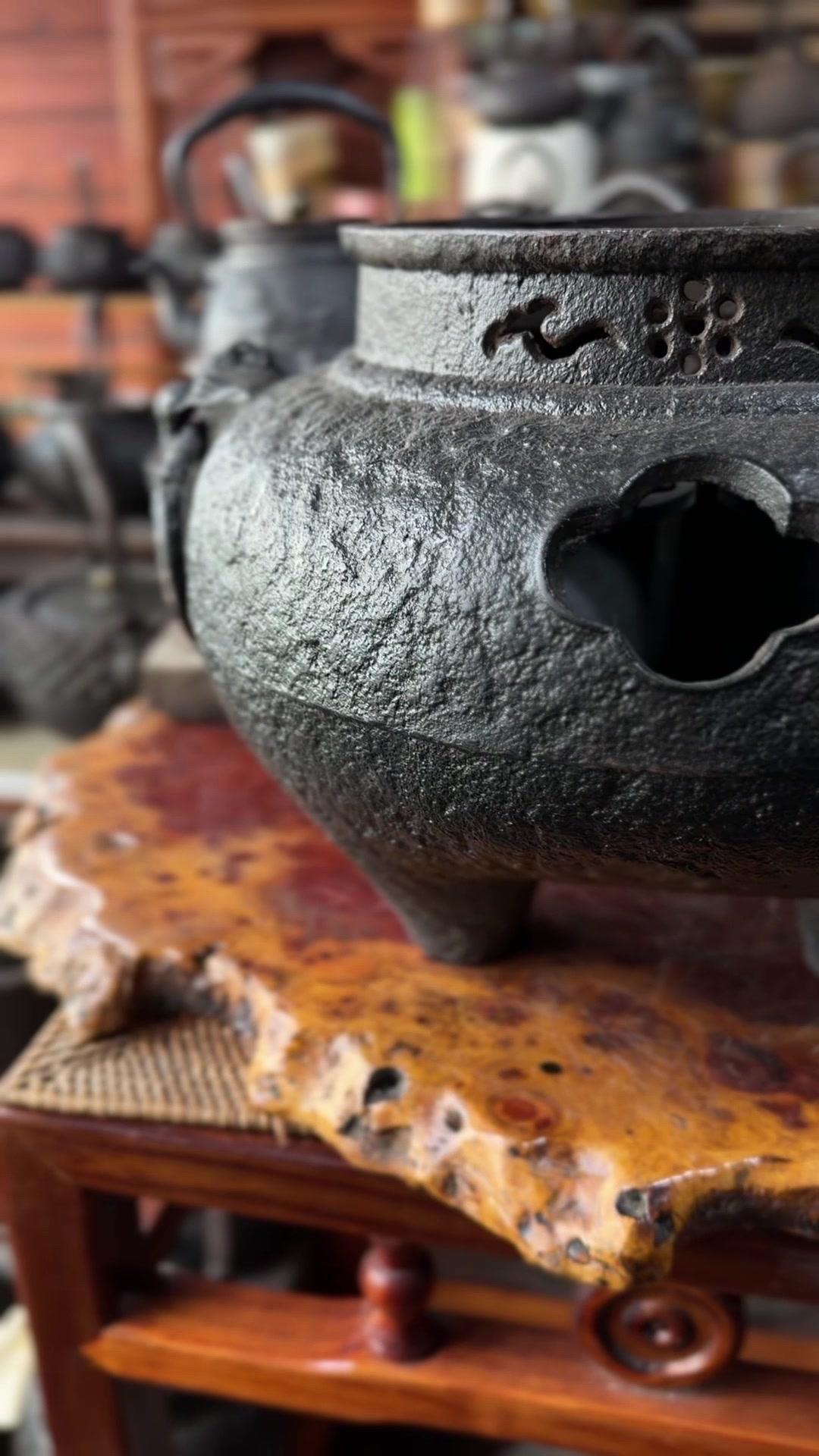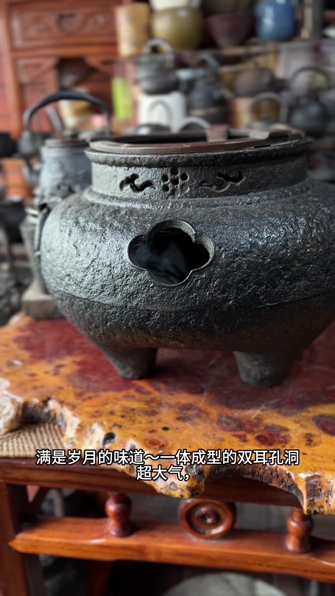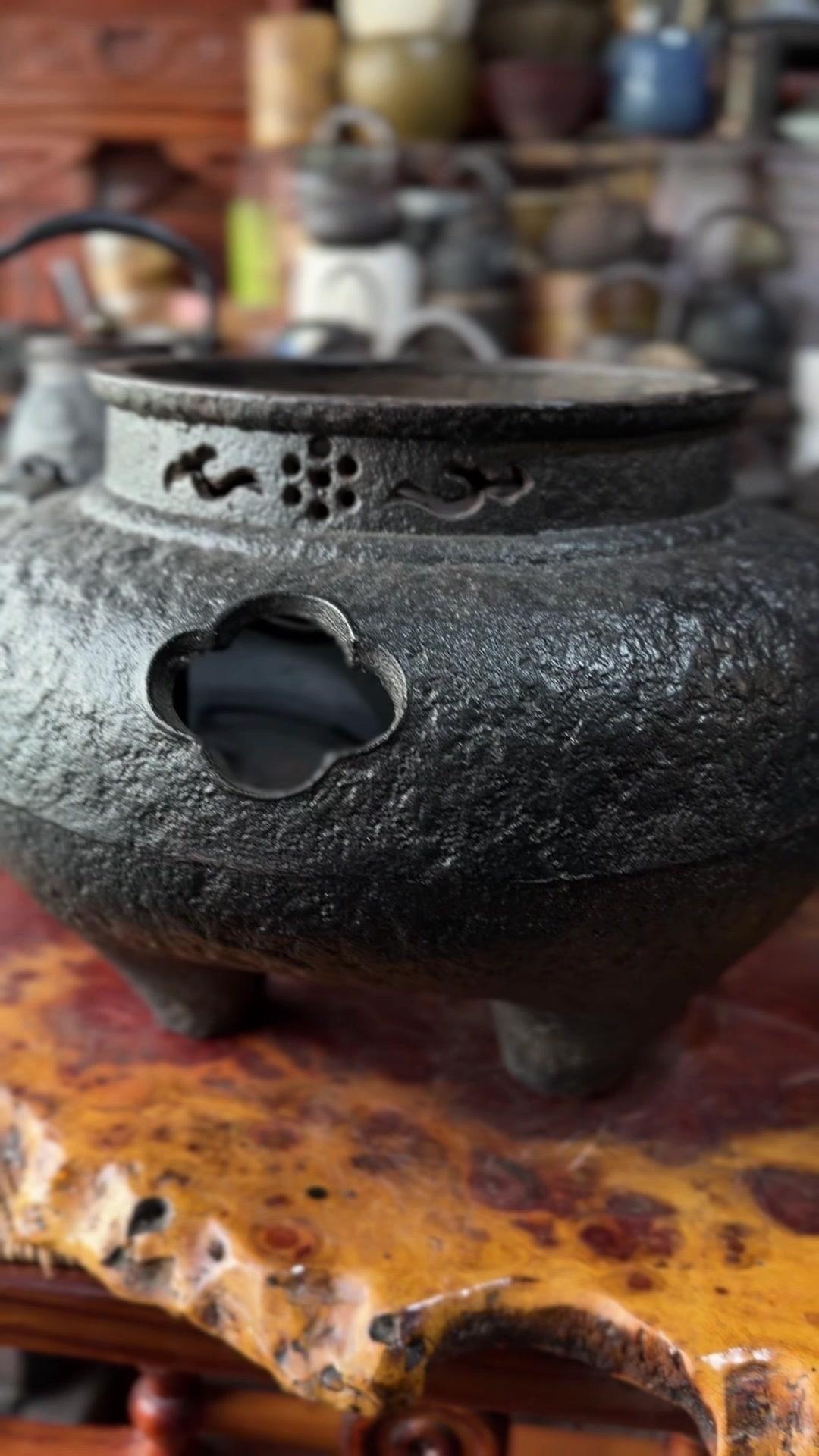 🖤昭和初期古铁鬼面风炉,真的一眼惊艳。口径20厘米,肚径26厘米,高21厘米,整器重5公斤左右,纯纯十斤沉。古铁材质铁性超棒,上手全是厚重质感,岩肌肌理摸着手感绝了,古朴又端庄。 🖤第一眼瞅着就像新石器时代的老陶罐,满是岁月的味道。一体成型的双耳孔洞超大气,鬼面刻画灵动又细腻,看着带点拙趣,越品越有味道。 🖤弱光下质感直接拉满,佗寂禅意拉满。高端茶室摆上瞬间提气场,适配野野田电炉用超合适,煮水煮茶氛围感直接拉满。百年老炉的底蕴,摆着用着都是排面。 懂茶懂器的朋友闭眼冲,这样的老物件真的很有收藏价值。