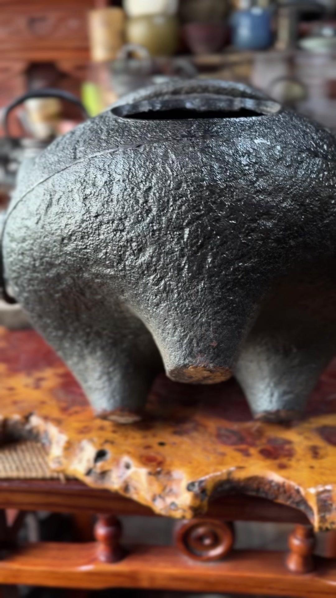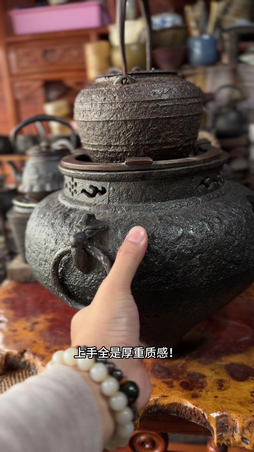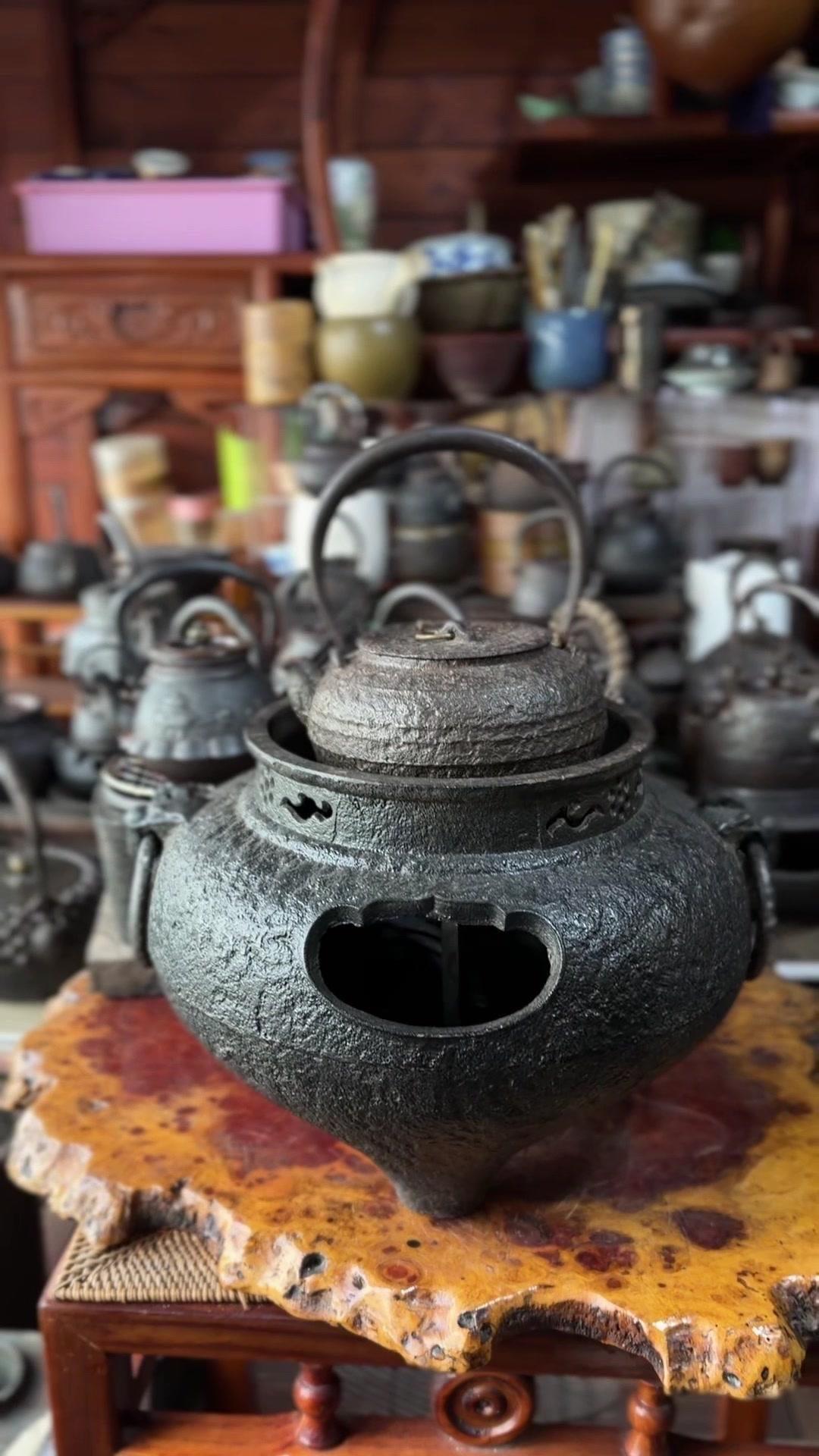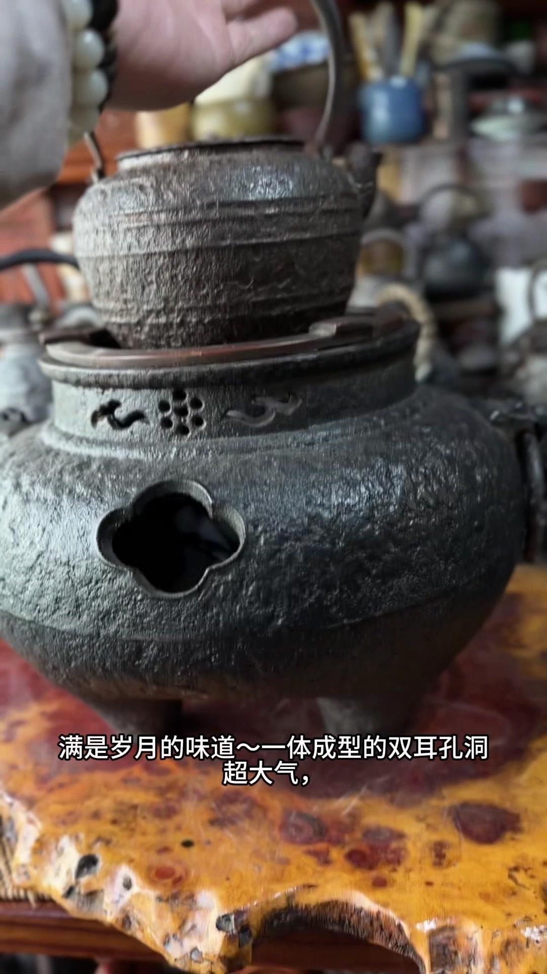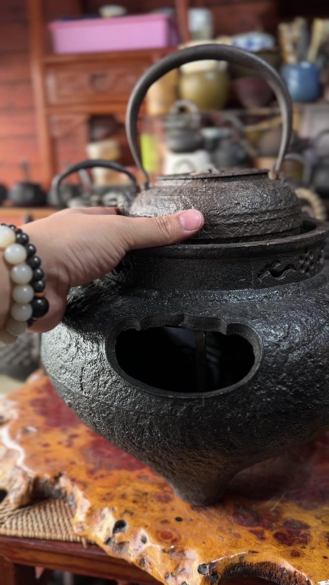 🖤昭和初期古铁鬼面风炉,真的一眼惊艳。口径20厘米,肚径26厘米,高21厘米,整器重5公斤左右,纯纯十斤沉。古铁材质铁性超棒,上手全是厚重质感,岩肌肌理摸着手感绝了,古朴又端庄。 🖤第一眼瞅着就像新石器时代的老陶罐,满是岁月的味道。一体成型的双耳孔洞超大气,鬼面刻画灵动又细腻,看着带点拙趣,越品越有味道。 🖤弱光下质感直接拉满,佗寂禅意拉满。高端茶室摆上瞬间提气场,适配野野田电炉用超合适,煮水煮茶氛围感直接拉满。百年老炉的底蕴,摆着用着都是排面。 懂茶懂器的朋友闭眼冲,这样的老物件真的很有收藏价值。