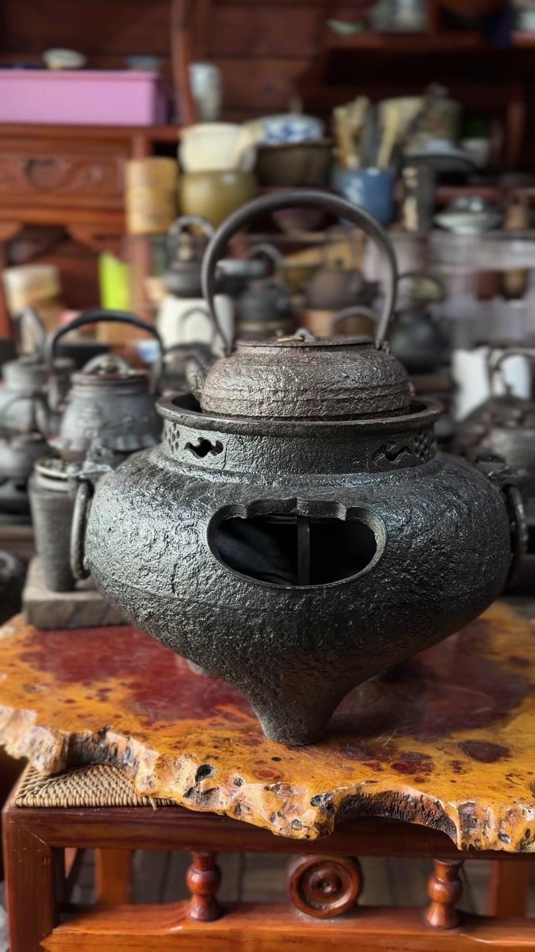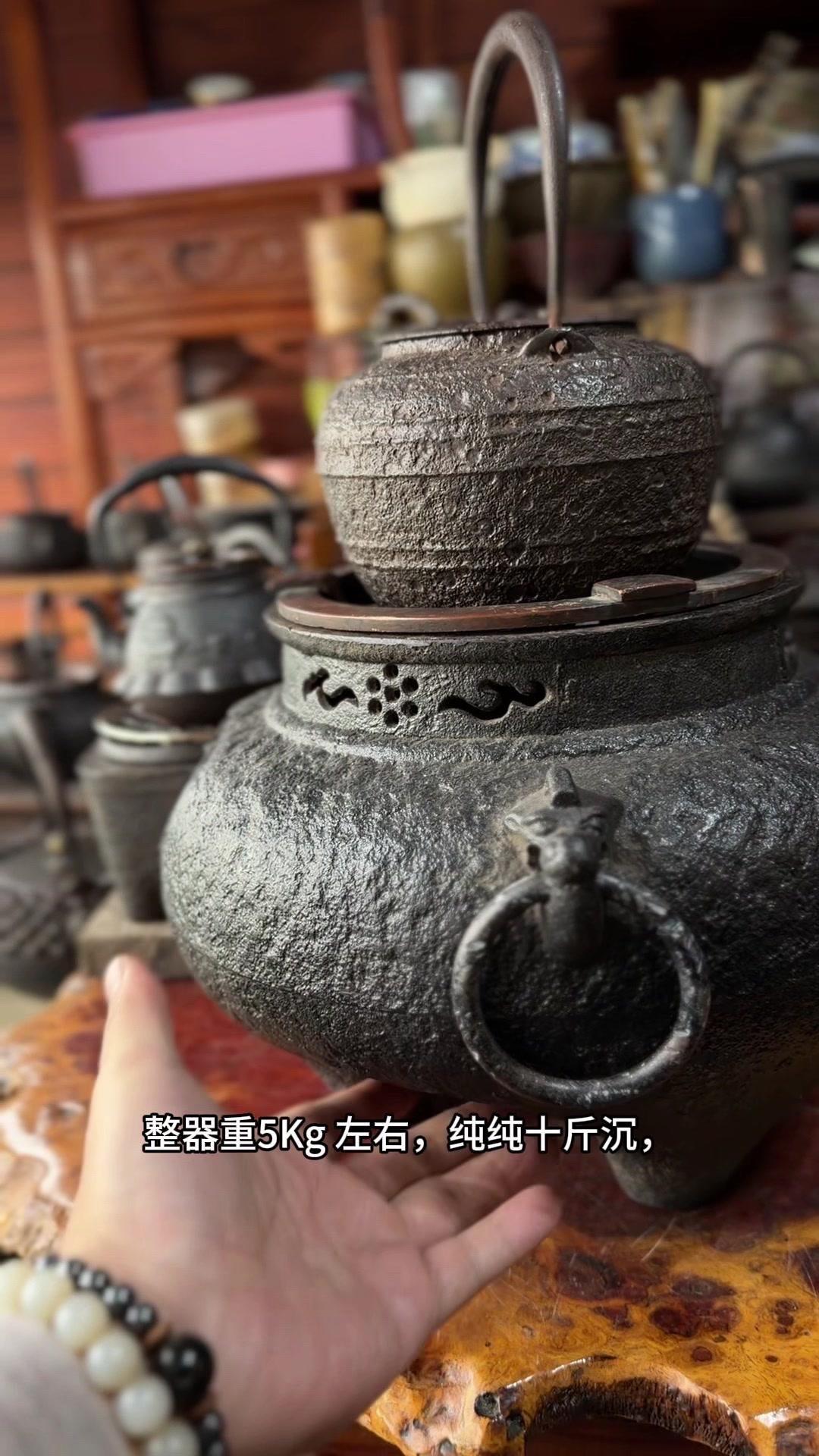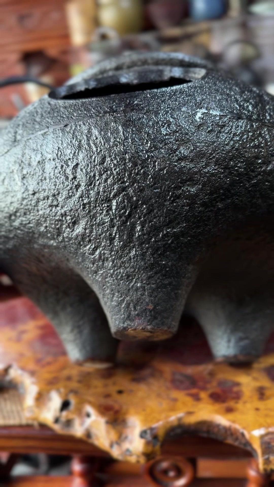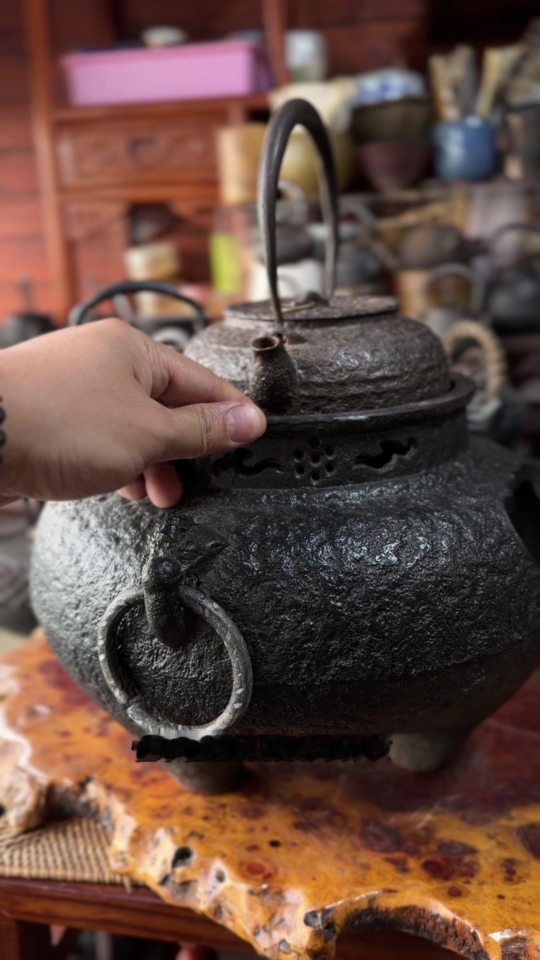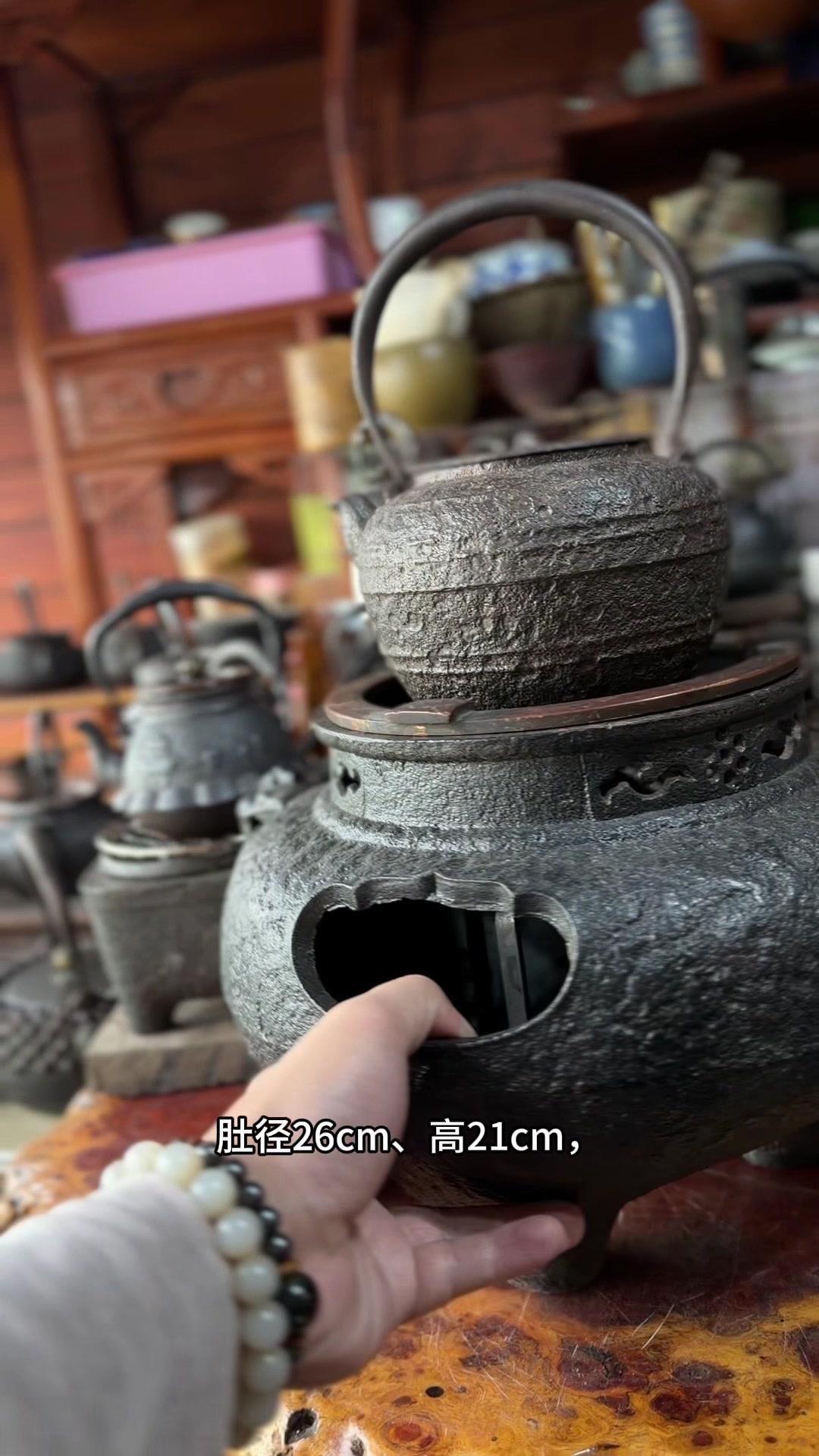 🖤昭和初期古铁鬼面风炉,真的一眼惊艳。口径20厘米,肚径26厘米,高21厘米,整器重5公斤左右,纯纯十斤沉。古铁材质铁性超棒,上手全是厚重质感,岩肌肌理摸着手感绝了,古朴又端庄。 🖤第一眼瞅着就像新石器时代的老陶罐,满是岁月的味道。一体成型的双耳孔洞超大气,鬼面刻画灵动又细腻,看着带点拙趣,越品越有味道。 🖤弱光下质感直接拉满,佗寂禅意拉满。高端茶室摆上瞬间提气场,适配野野田电炉用超合适,煮水煮茶氛围感直接拉满。百年老炉的底蕴,摆着用着都是排面。 懂茶懂器的朋友闭眼冲,这样的老物件真的很有收藏价值。