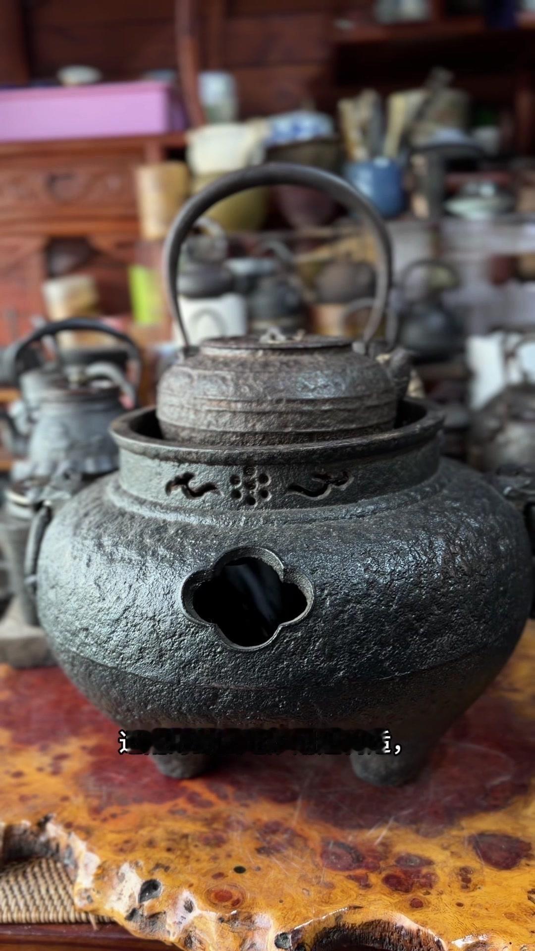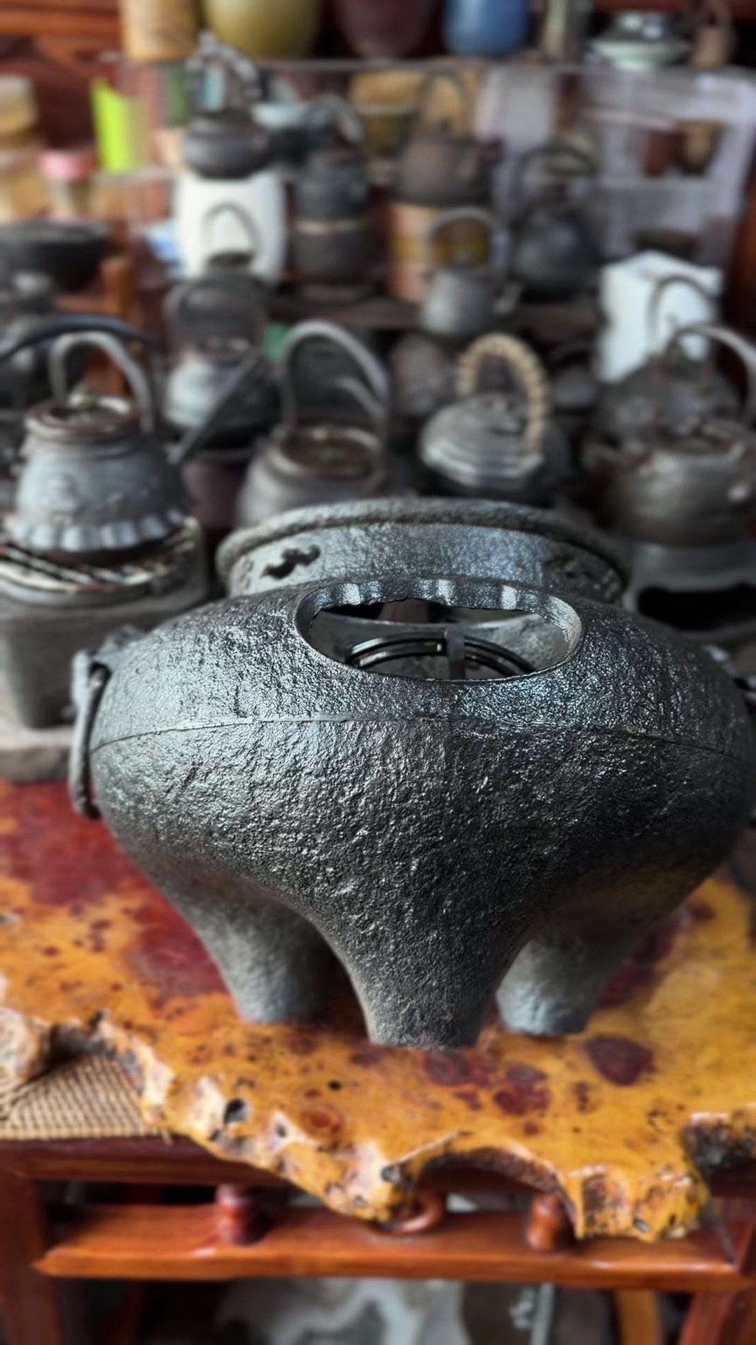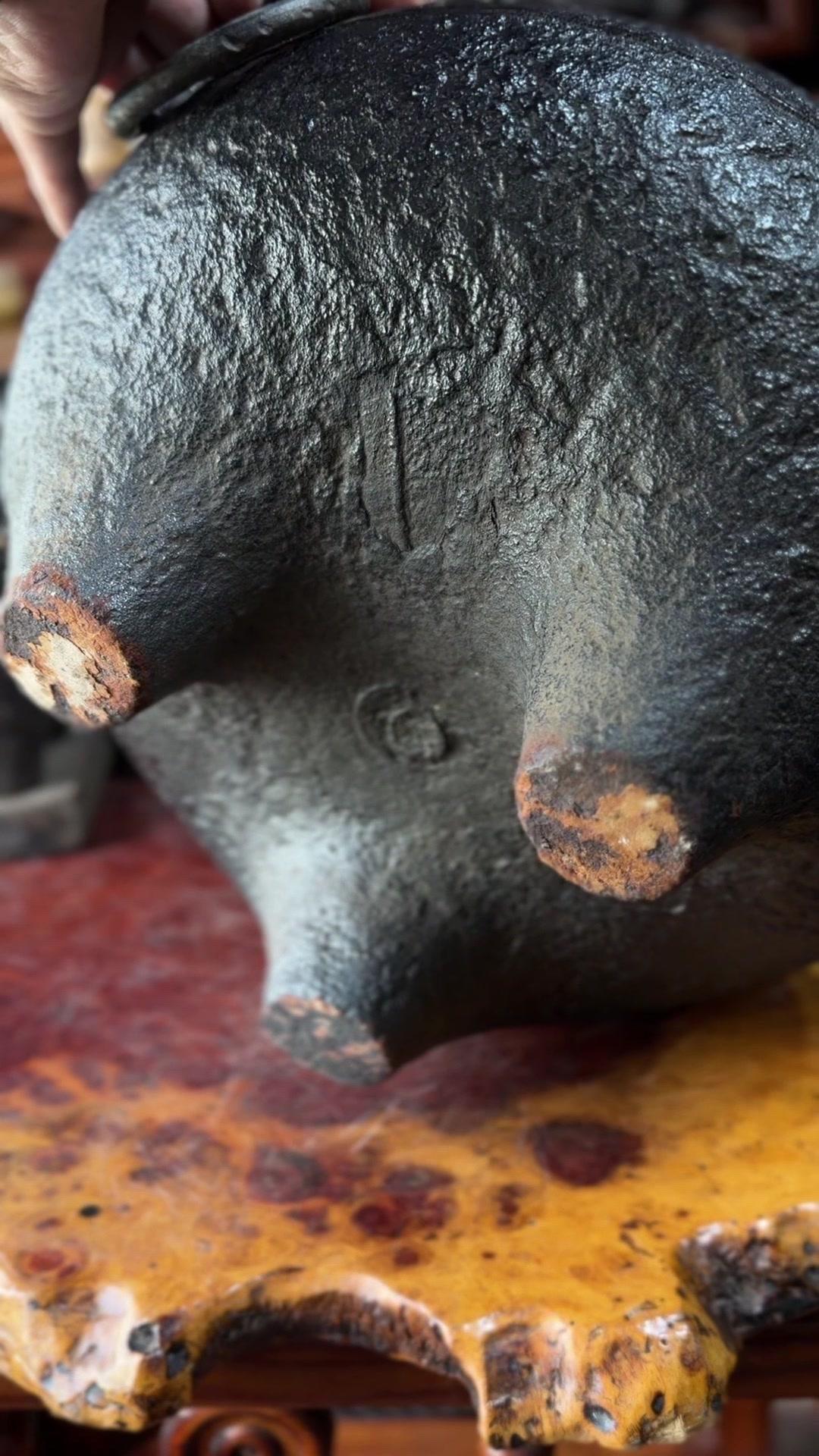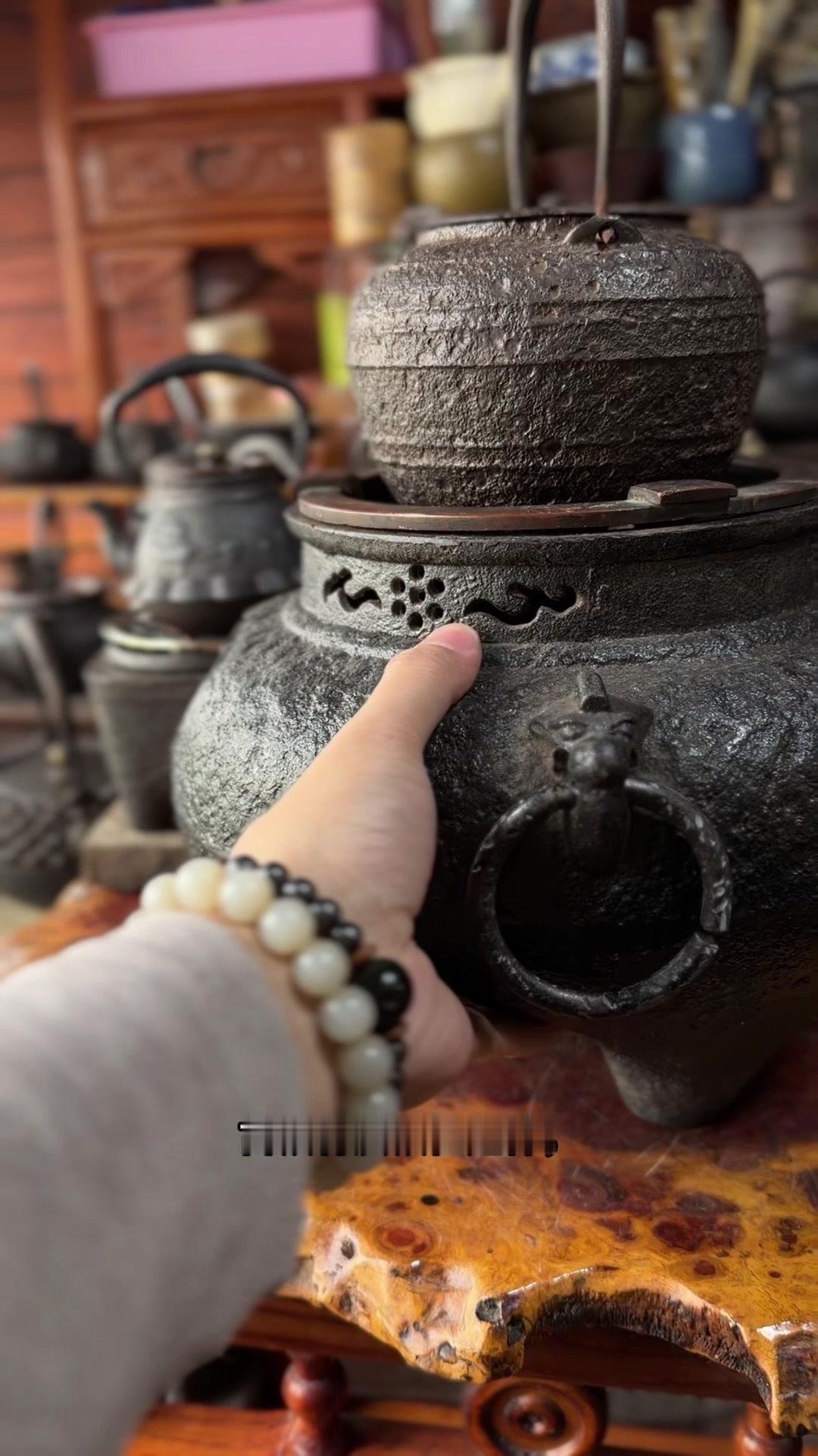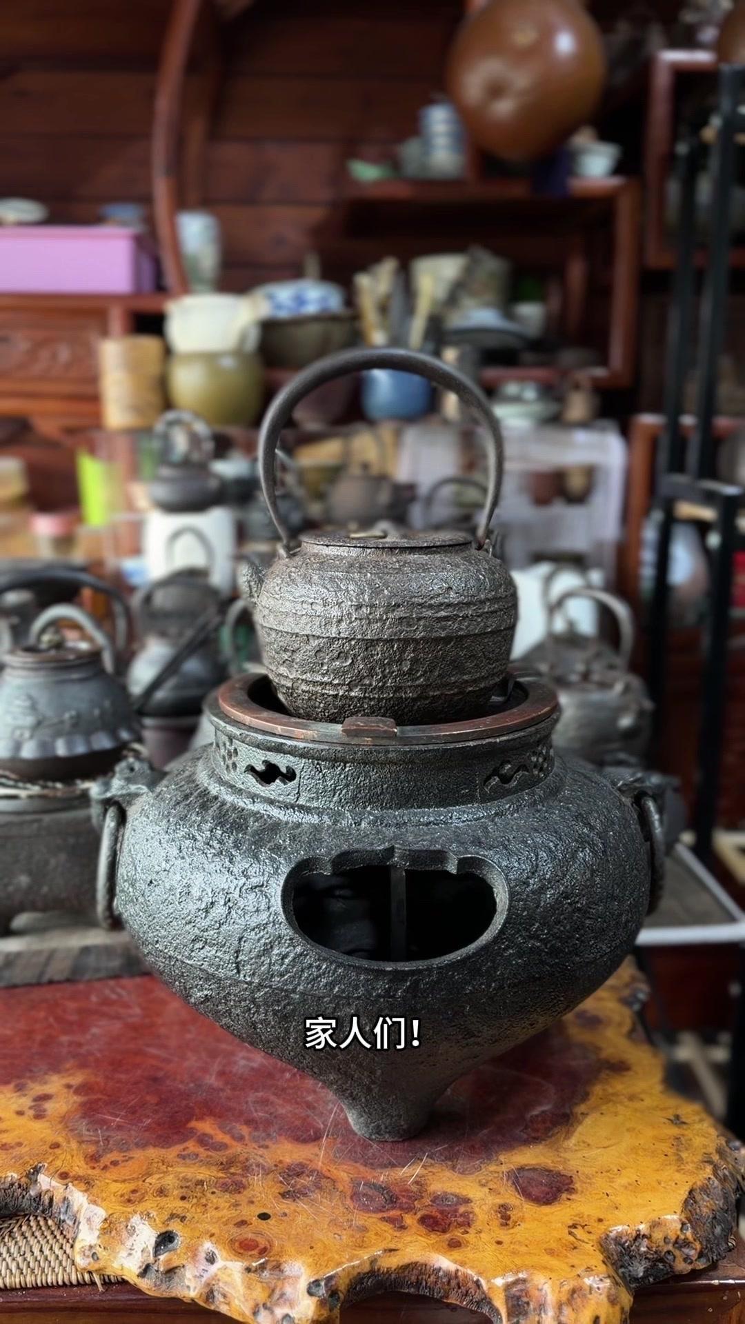 🖤昭和初期古铁鬼面风炉,真的一眼惊艳。口径20厘米,肚径26厘米,高21厘米,整器重5公斤左右,纯纯十斤沉。古铁材质铁性超棒,上手全是厚重质感,岩肌肌理摸着手感绝了,古朴又端庄。 🖤第一眼瞅着就像新石器时代的老陶罐,满是岁月的味道。一体成型的双耳孔洞超大气,鬼面刻画灵动又细腻,看着带点拙趣,越品越有味道。 🖤弱光下质感直接拉满,佗寂禅意拉满。高端茶室摆上瞬间提气场,适配野野田电炉用超合适,煮水煮茶氛围感直接拉满。百年老炉的底蕴,摆着用着都是排面。 懂茶懂器的朋友闭眼冲,这样的老物件真的很有收藏价值。