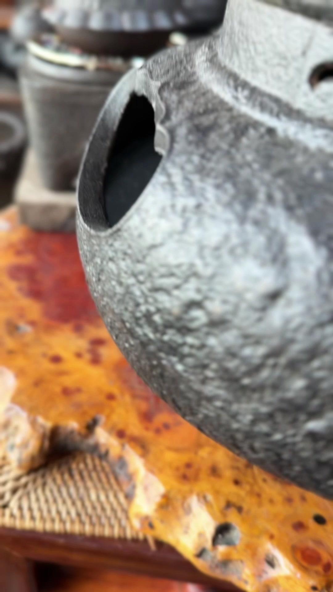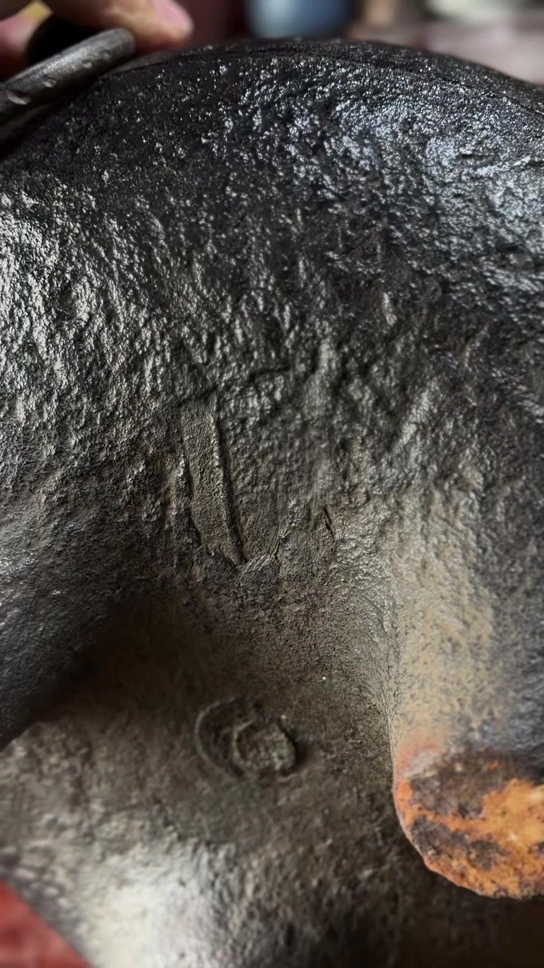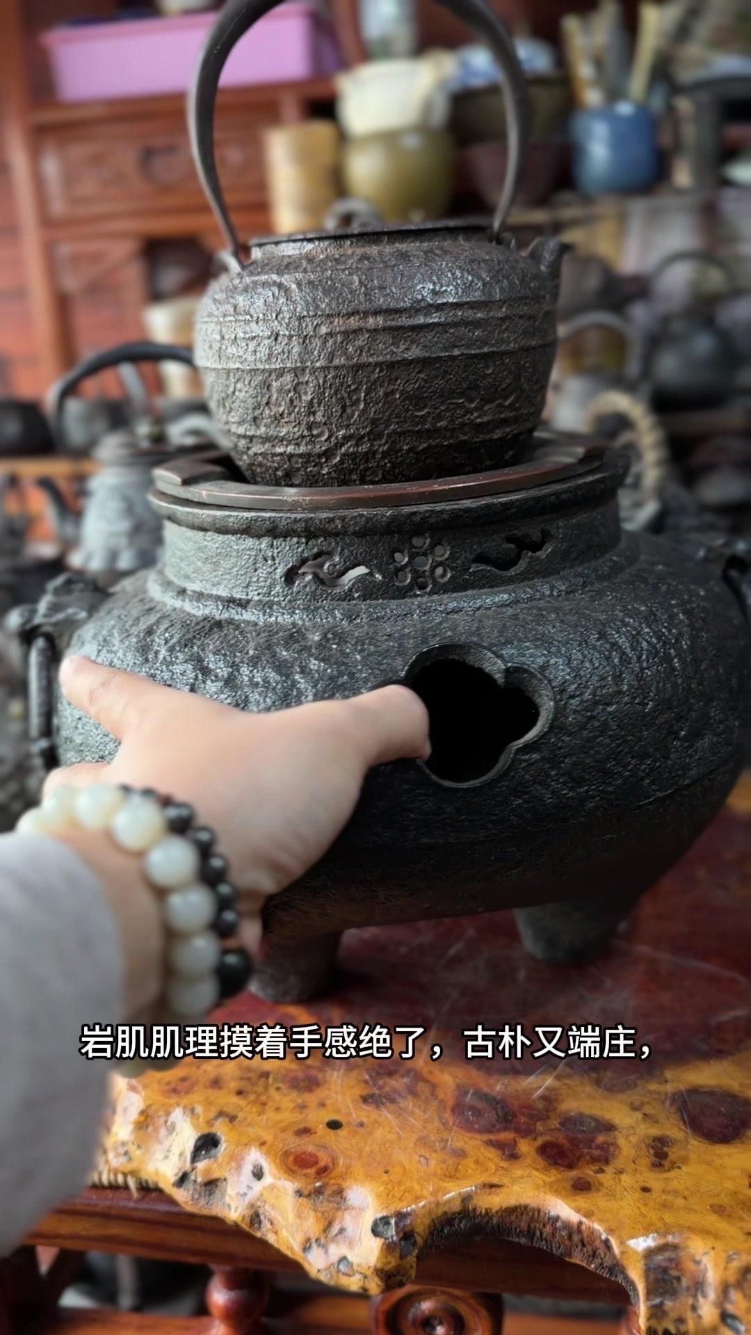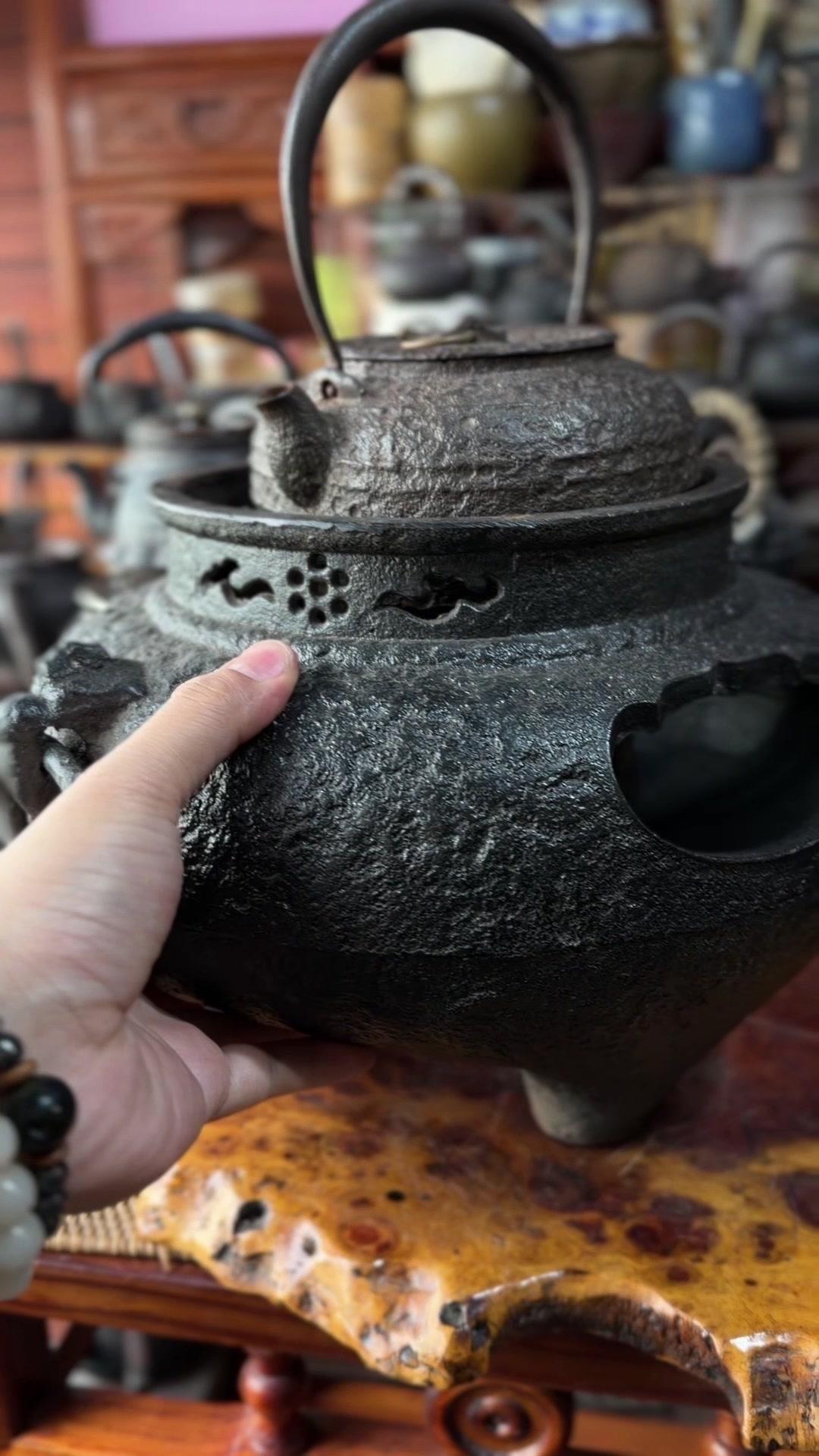 🖤昭和初期古铁鬼面风炉,真的一眼惊艳。口径20厘米,肚径26厘米,高21厘米,整器重5公斤左右,纯纯十斤沉。古铁材质铁性超棒,上手全是厚重质感,岩肌肌理摸着手感绝了,古朴又端庄。 🖤第一眼瞅着就像新石器时代的老陶罐,满是岁月的味道。一体成型的双耳孔洞超大气,鬼面刻画灵动又细腻,看着带点拙趣,越品越有味道。 🖤弱光下质感直接拉满,佗寂禅意拉满。高端茶室摆上瞬间提气场,适配野野田电炉用超合适,煮水煮茶氛围感直接拉满。百年老炉的底蕴,摆着用着都是排面。 懂茶懂器的朋友闭眼冲,这样的老物件真的很有收藏价值。
