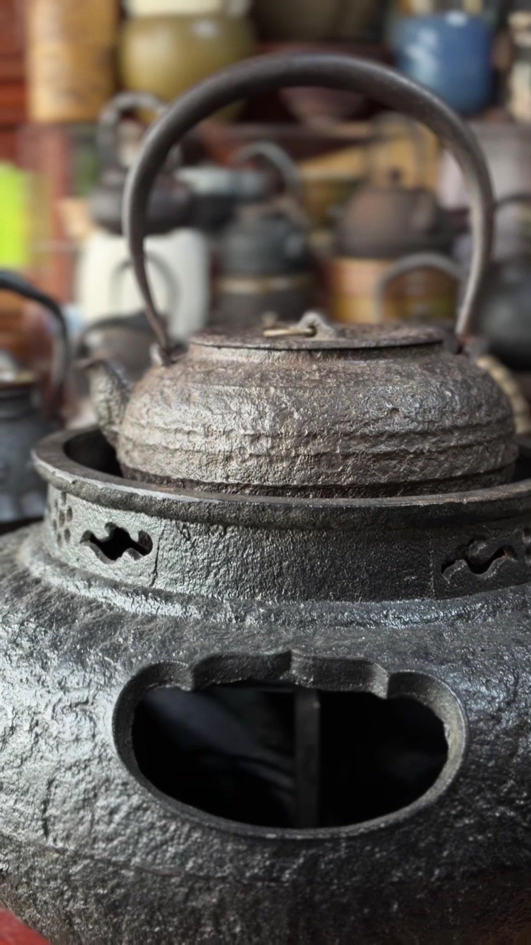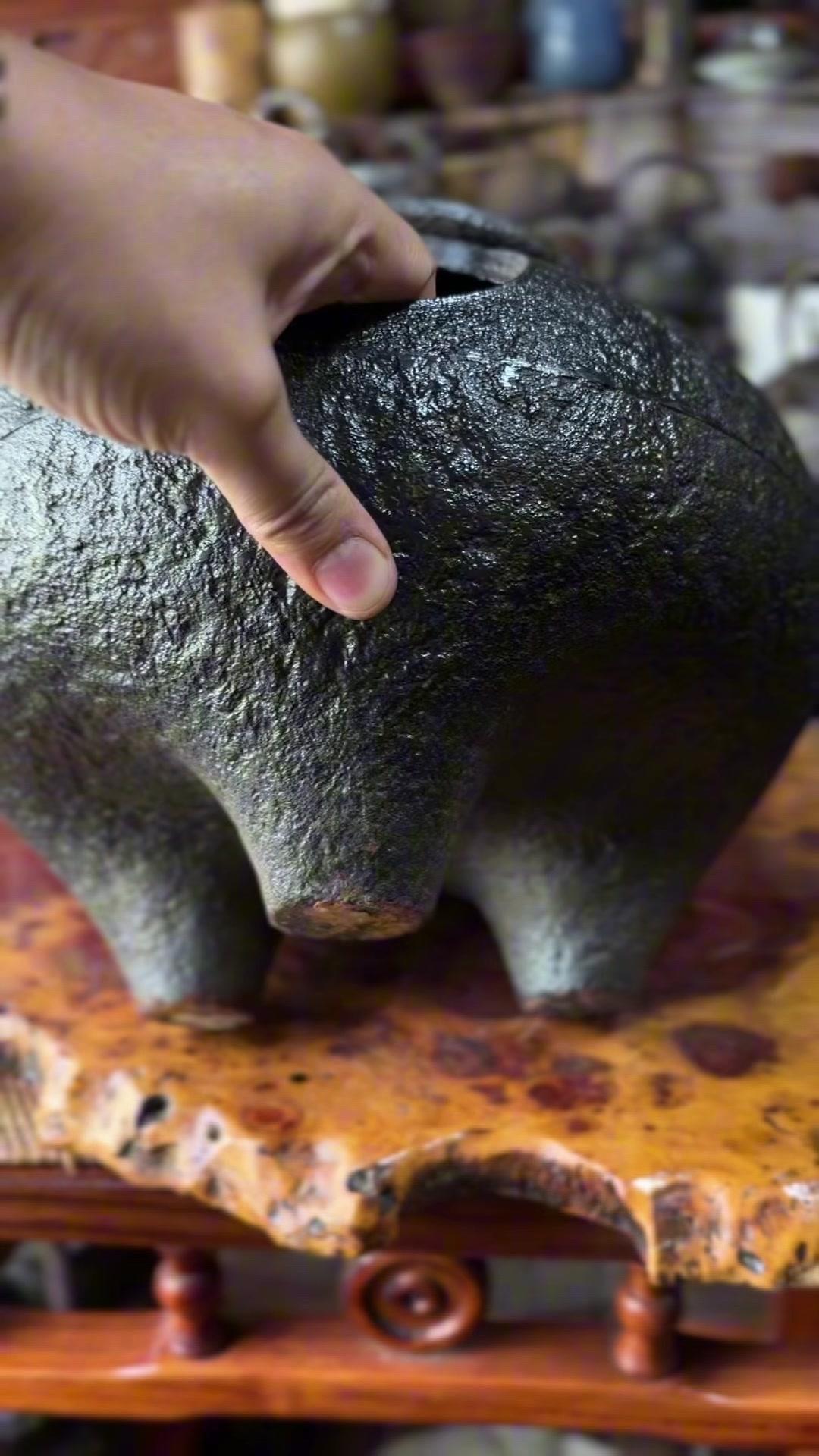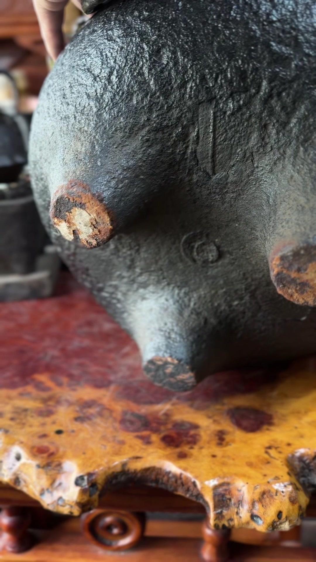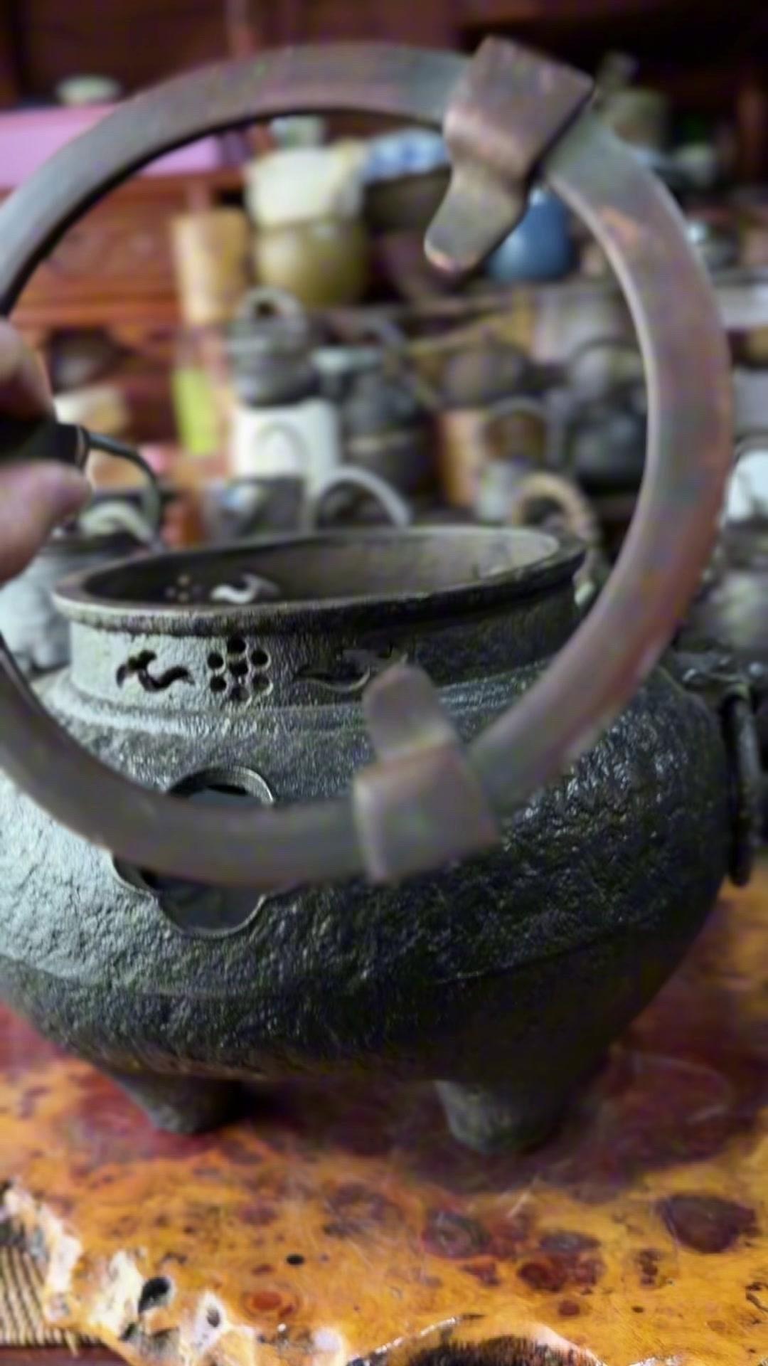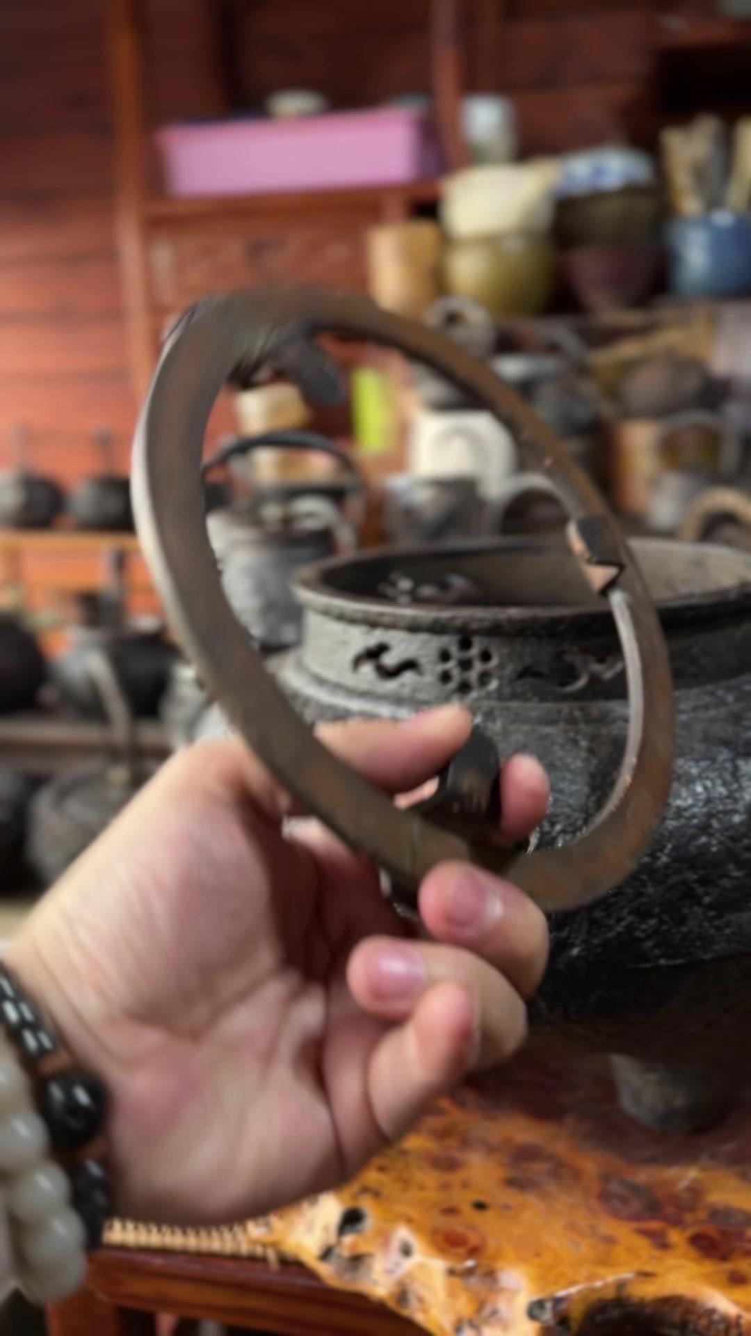 🖤昭和初期古铁鬼面风炉,真的一眼惊艳。口径20厘米,肚径26厘米,高21厘米,整器重5公斤左右,纯纯十斤沉。古铁材质铁性超棒,上手全是厚重质感,岩肌肌理摸着手感绝了,古朴又端庄。 🖤第一眼瞅着就像新石器时代的老陶罐,满是岁月的味道。一体成型的双耳孔洞超大气,鬼面刻画灵动又细腻,看着带点拙趣,越品越有味道。 🖤弱光下质感直接拉满,佗寂禅意拉满。高端茶室摆上瞬间提气场,适配野野田电炉用超合适,煮水煮茶氛围感直接拉满。百年老炉的底蕴,摆着用着都是排面。 懂茶懂器的朋友闭眼冲,这样的老物件真的很有收藏价值。