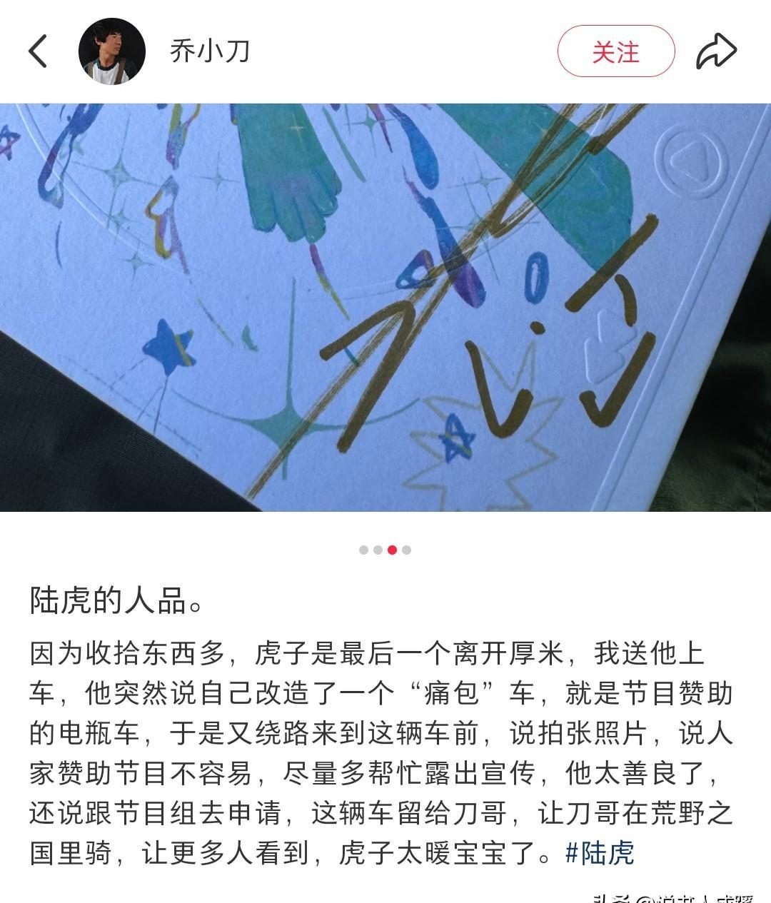 所有人都骂那个丑东西上热搜的时候,陆虎正蹲在那辆赞助商的小电驴旁边拍照。 磨了编导半天。 “哥,这车录完别拉走,留给刀哥成吗? 他通勤用得上。 ” 拍完照,编辑微博。 文案删了又打。 不是敷衍的“感谢金主”,得把品牌型号露出来,还得带节目话题。 他清楚,这台几千块的电动车,是下次合作的敲门砖。 节目组也学乖了。 观众说“厚米”戏太多,第二期直接剪成背景板。 吐槽抽卡环节无聊,下集流程立刻重做。 这帮老油条和制作团队,脸上插科打诨,心里都跟明镜似的。 再就业男团凭什么从破仓库唱到跨年舞台? 陆虎又凭什么被叫“综艺之子”? 真以为是运气? 那是把每次曝光,都当成最后一次机会在经营。 合影、提车、认真写微博——这些观众压根不会注意的边角料,才是他们真正的简历。 在这个人设比墙皮掉得还快的时代,**珍惜羽毛**,成了最反直觉的顶级打法。 你以为他在客气,其实他在结算。 真诚,是流量算法里,他们自己写的后门。