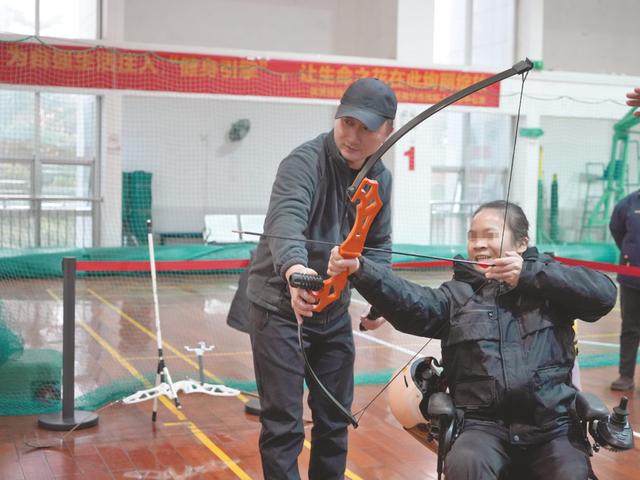 残疾人朋友在专业志愿者的指导下体验射箭。