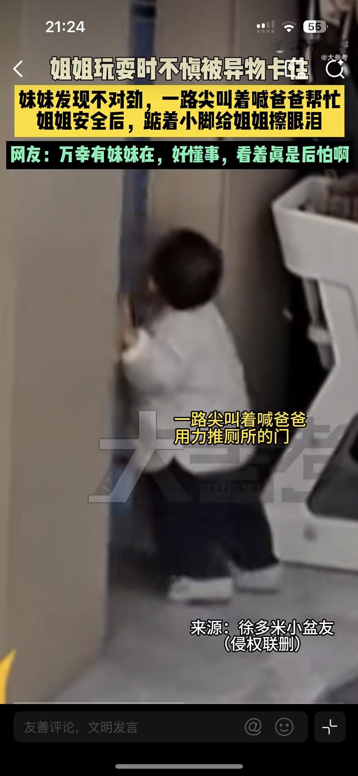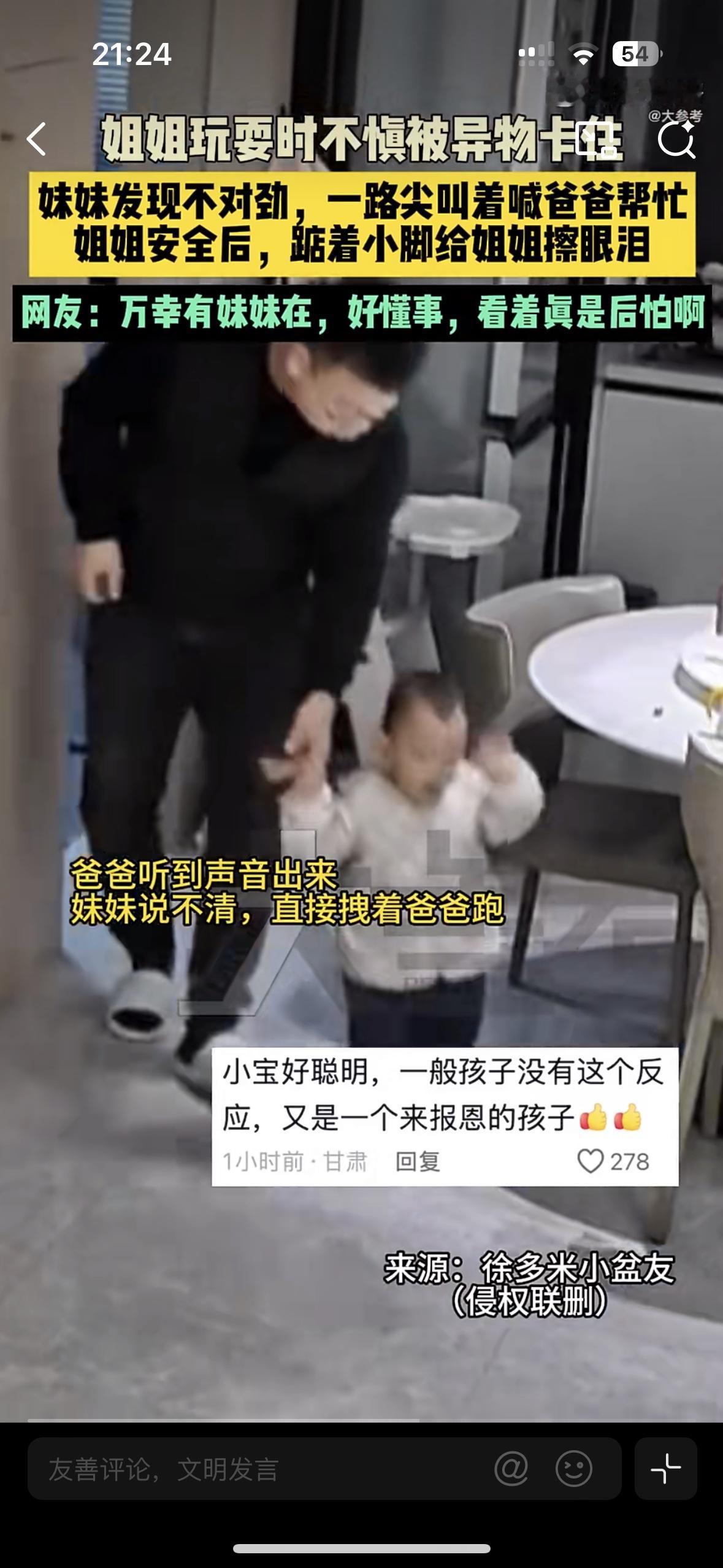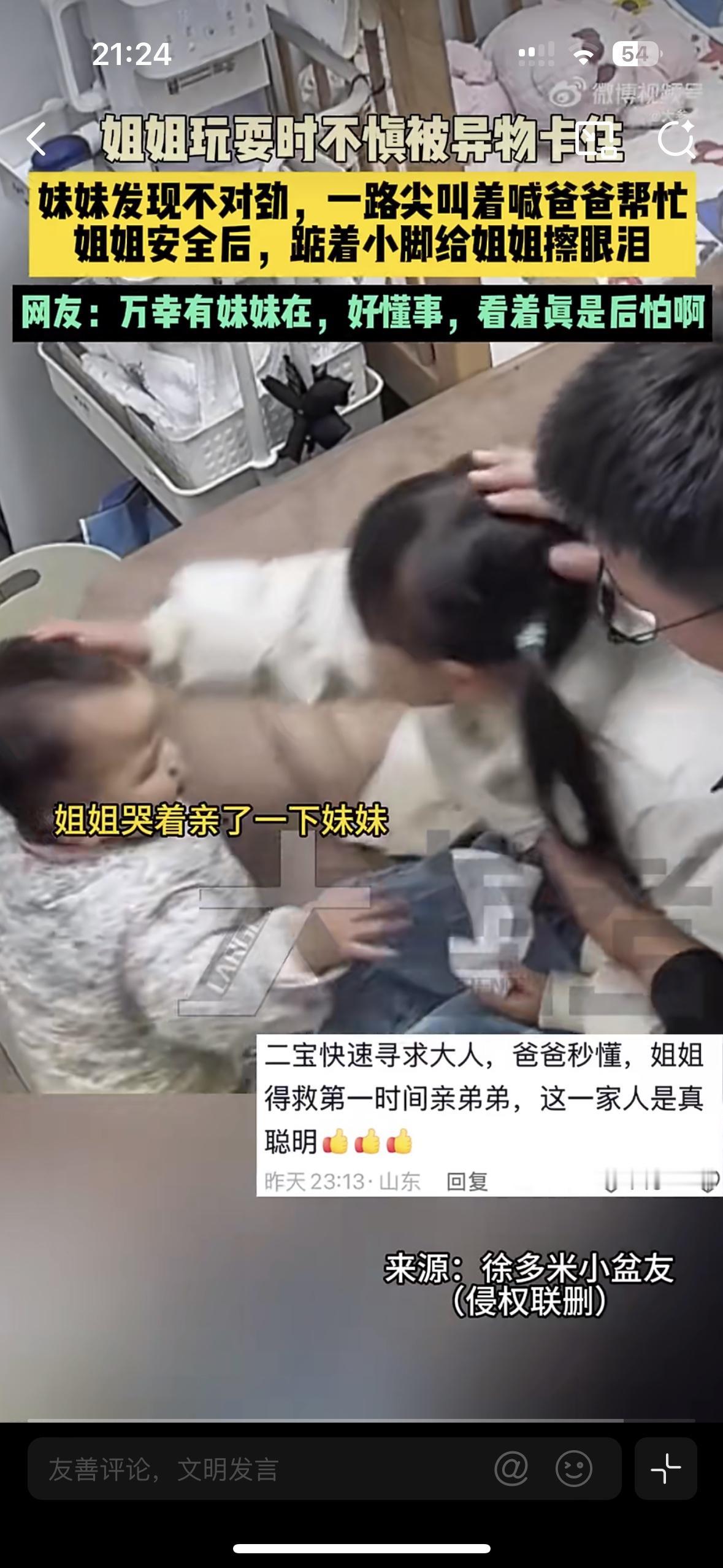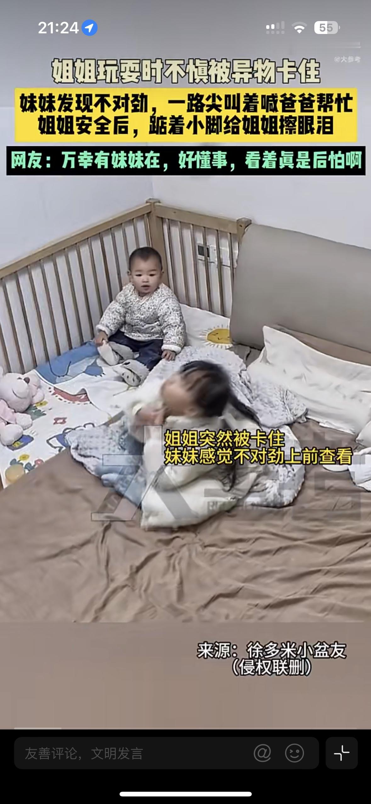 你敢信吗?连路都走不稳的一周多妹妹,在危急时刻救下了姐姐 浙江一户人家的监控视频曝光,看得网友的心提到了嗓子眼。姐妹俩在床上蹦着玩的时候,姐姐吃零食突然被异物卡住喉咙,瞬间憋得满脸通红,连哭喊的力气都没有 就在这生死关头,旁边的2岁妹妹突然反应过来,她没有慌神也没有哭闹失措,而是跌跌撞撞冲下床,用肉嘟嘟的小手砸门,嘴里不停的喊:“爸爸,姐姐” 爸爸闻声出来,立马给姐姐急救,这才化险为夷!缓过来的姐姐哭着亲了妹妹一下,这是什么小天使,有这样的妹妹,真是一辈子的福气!