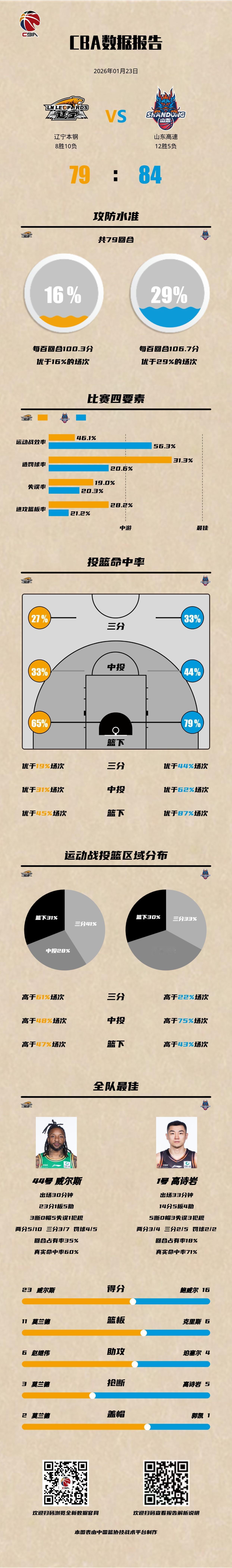 辽宁本钢 79-84 山东高速辽宁男篮vs山东男篮 辽宁本钢:威尔斯23分5助攻3抢断,赵继伟12分7篮板6助攻,莫兰德11分11篮板3助攻3抢断2盖帽; 山东高速:克里斯16分6篮板4助攻,鲍威尔16分,高诗岩14分5篮板4助攻5抢断。CBA数据库