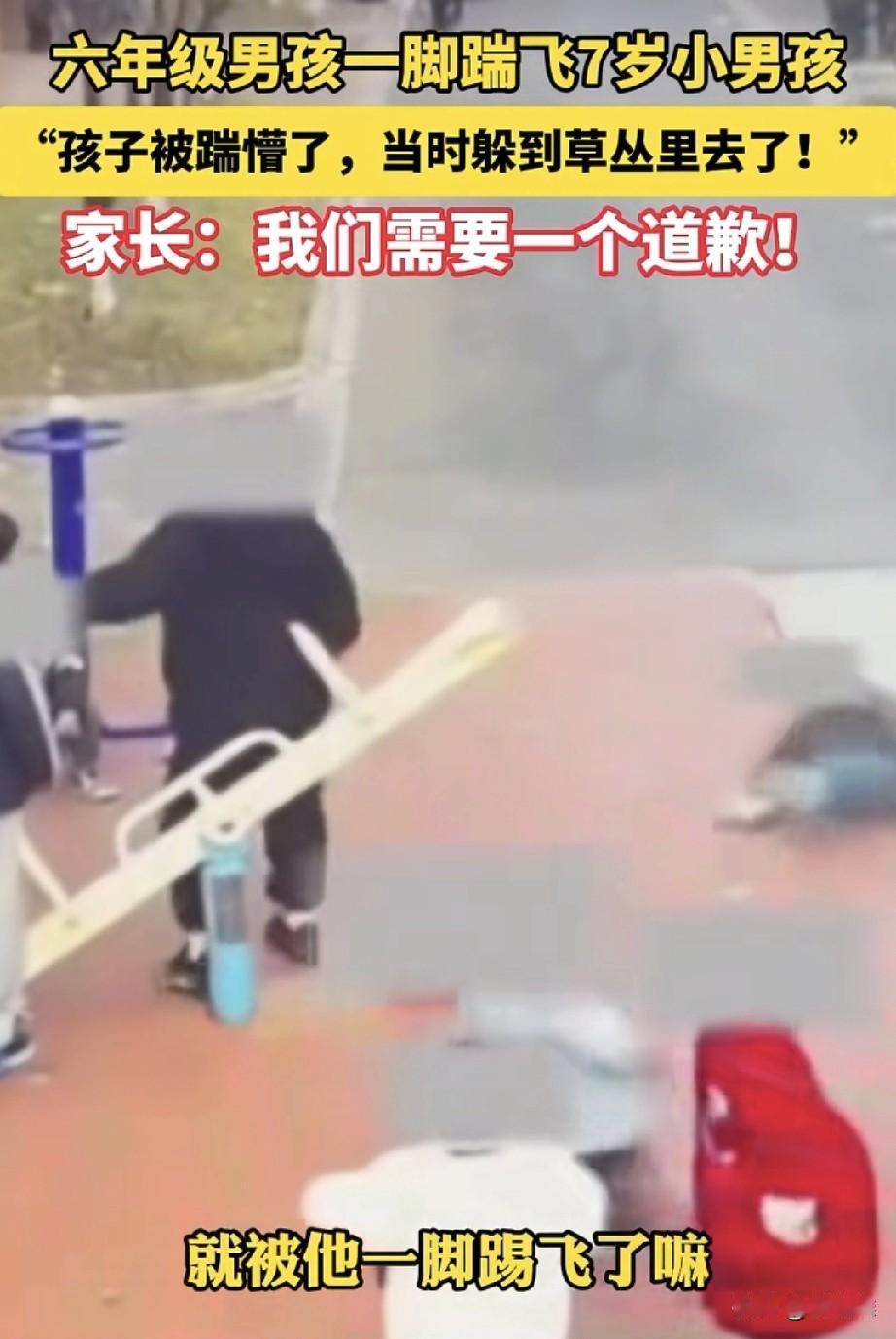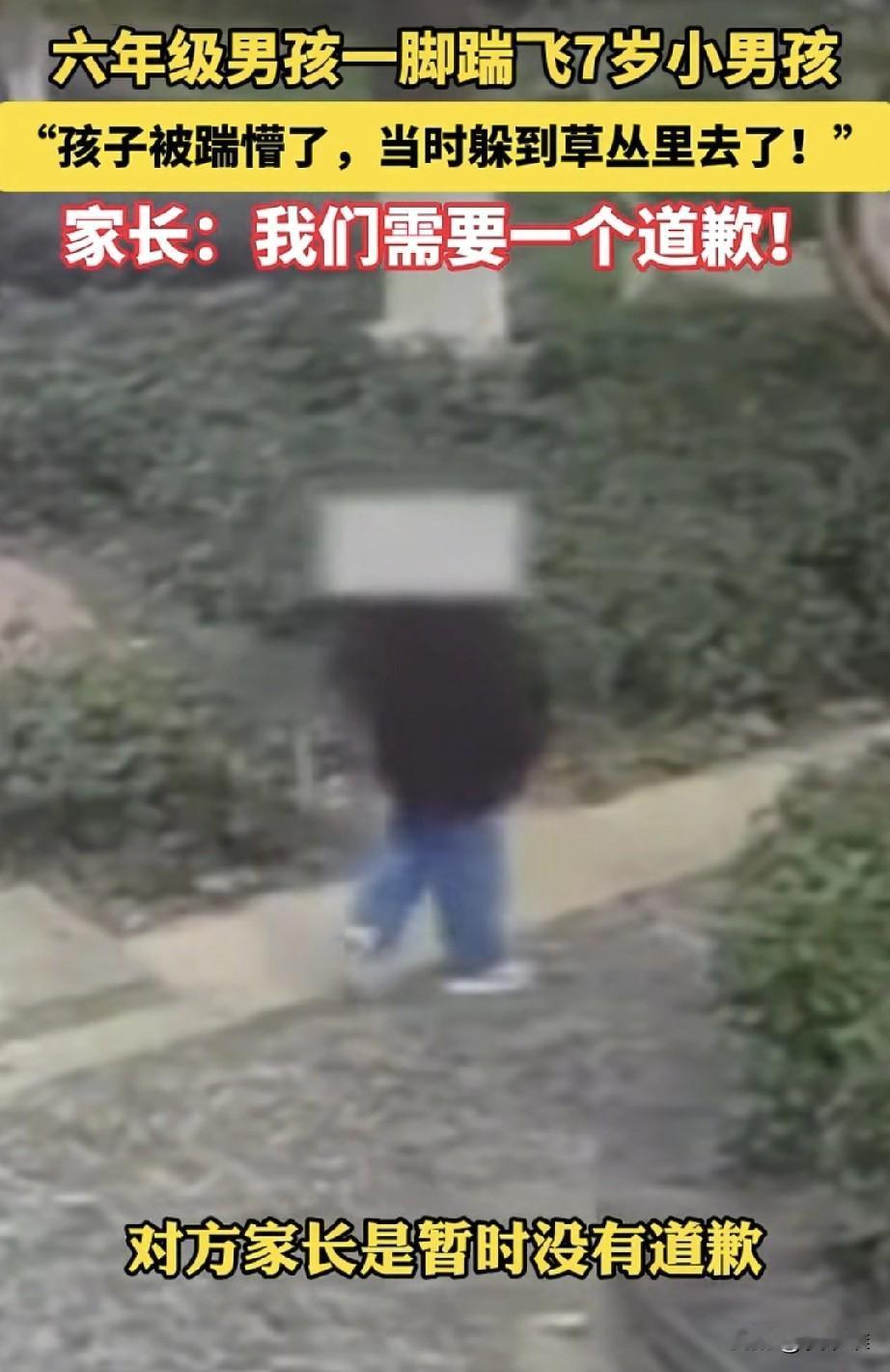 “天生的坏!”7岁男孩在小区内玩耍,无缘无故被同小区的一个上六年级的男孩猛揣一脚,摔倒在地,男孩父亲看到监控后气的浑身发抖,他要求踹人男孩的家长必须出来道歉,可是令人气愤的是男孩家长始终没有露面!网友感叹:“有什么样的家长就有什么样的孩子,孩子恶毒,家长不敢承担责任,这孩子走向社会肯定会被教育!”