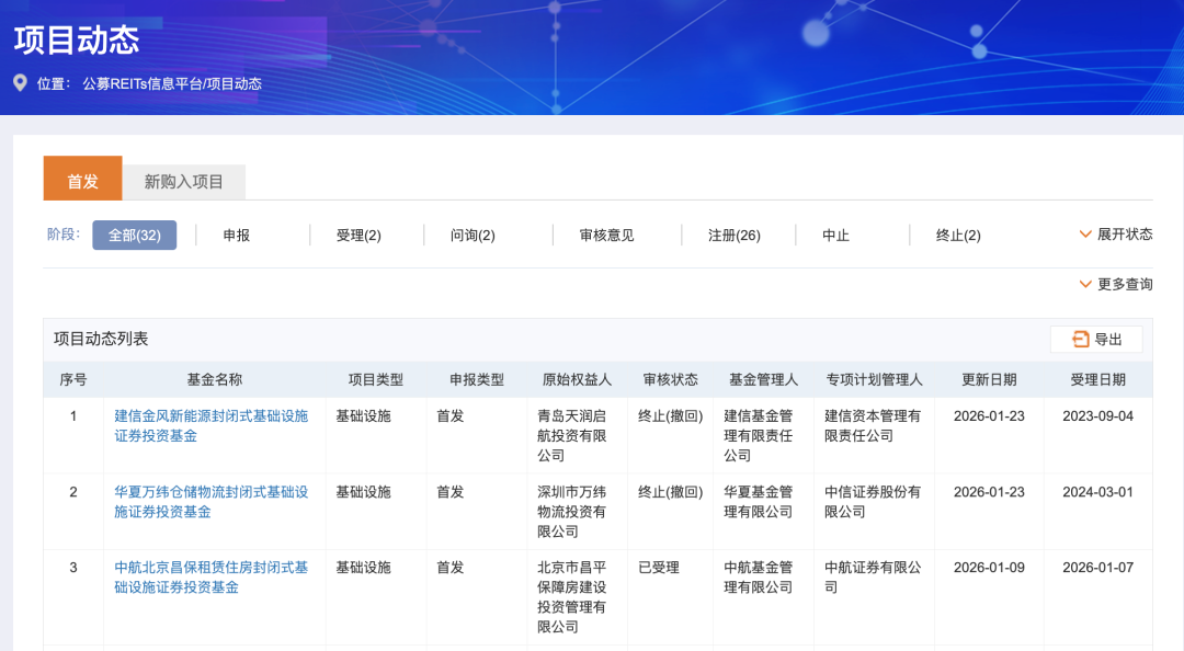 据沪深交易所官网消息,富国首创水务封闭式基础设施证券投资基金扩募发行、建信建融家园租赁住房封闭式基础设施证券投资基金、创金合信电子城产业园封闭式基础设施证券投资基金以及建信金风新能源封闭式基础设施证券投资基金、华夏万纬仓储物流封闭式基础设施证券投资基金终止或撤回发行。