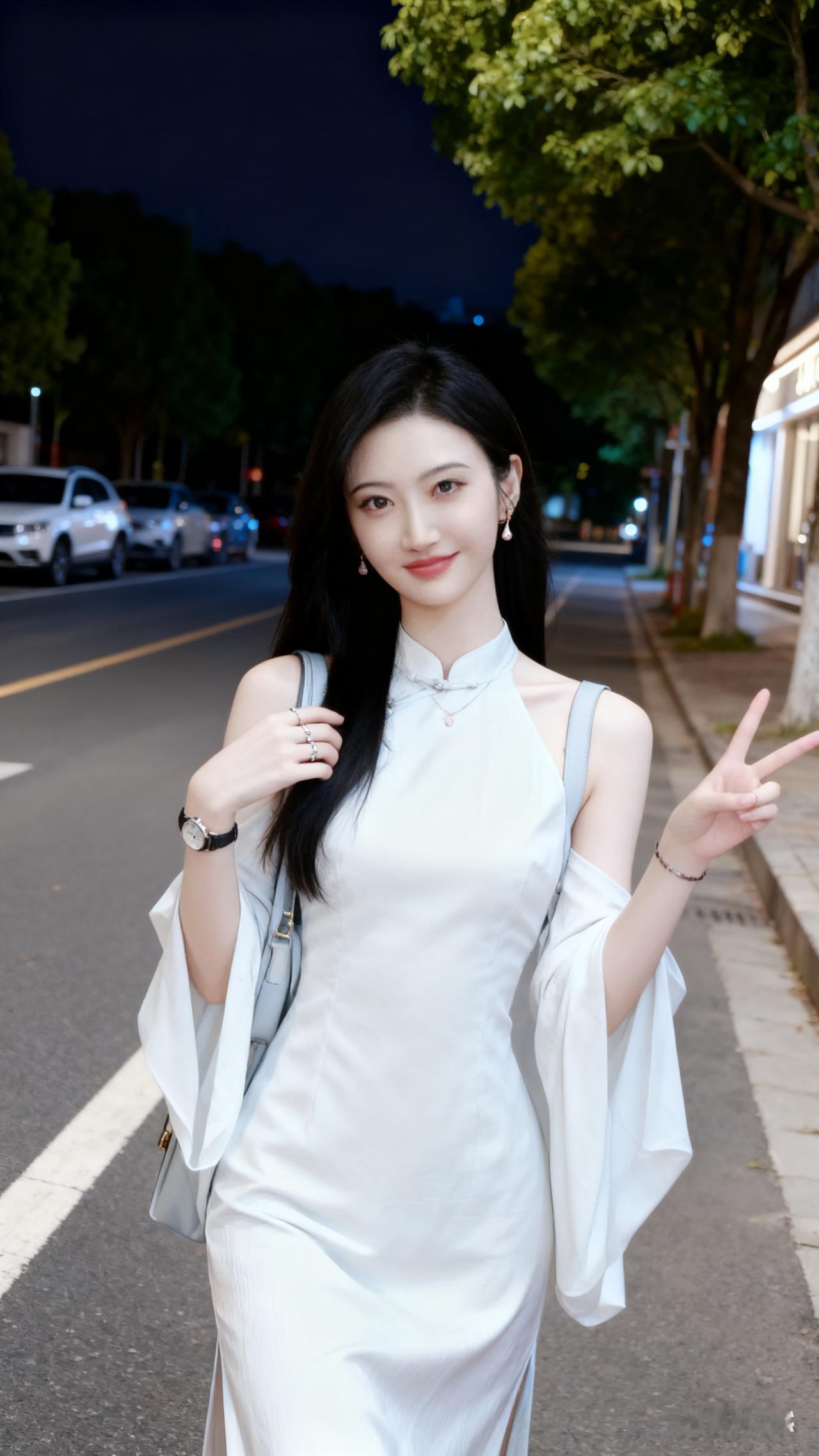 优雅白裙夜色下,自信微笑,都市女性魅力