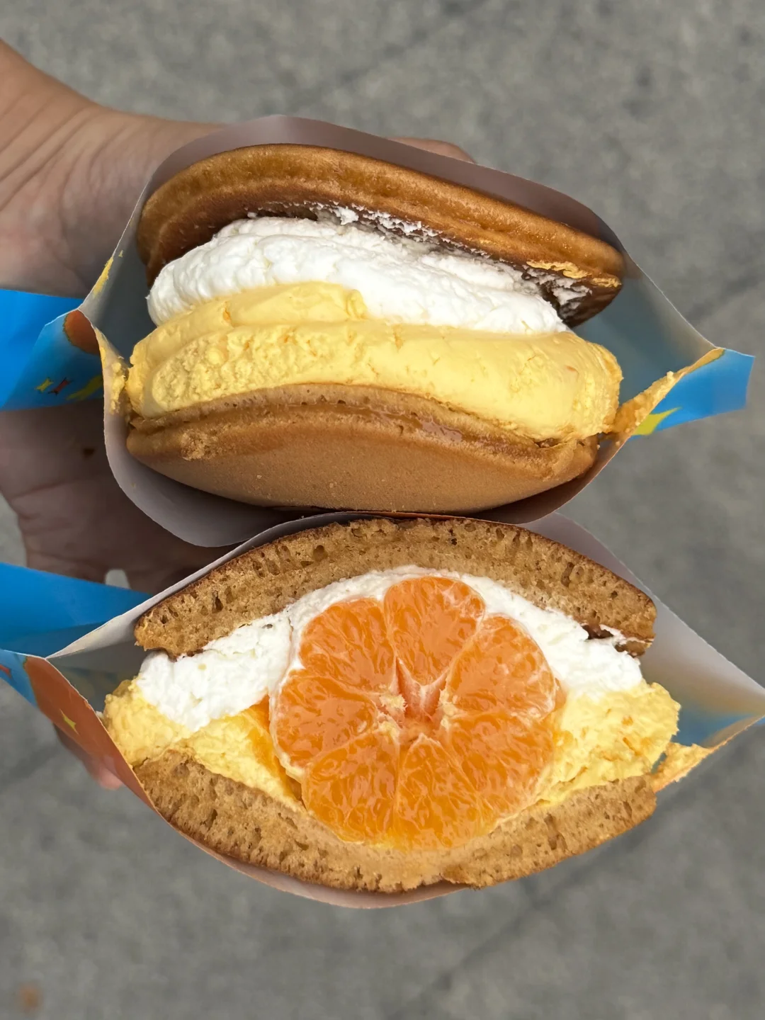一整颗的桔子在铜锣烧里面 桔子脑袋连炫了三个! 果肉非常饱满,而且很甜很多汁!!!