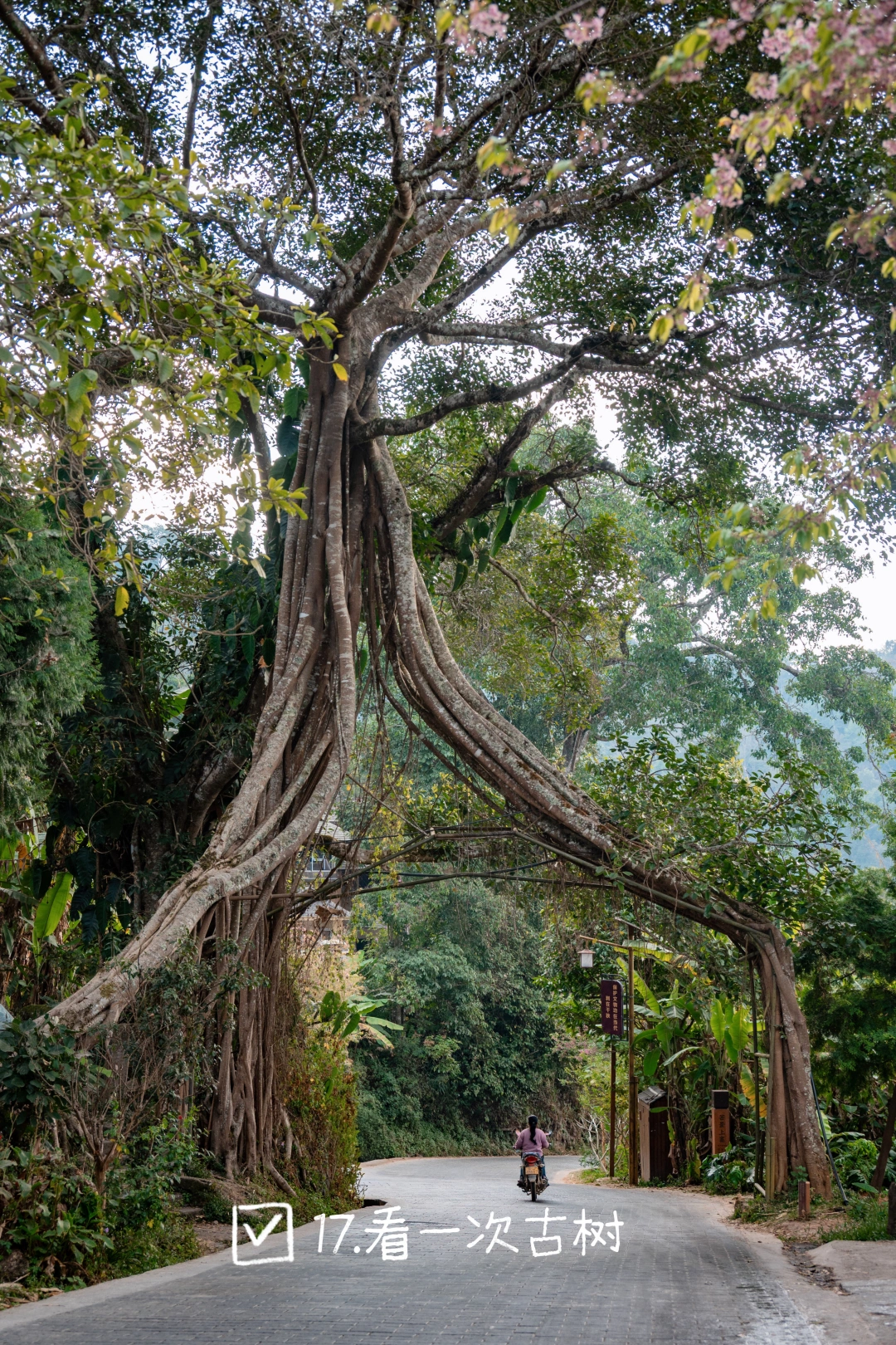 17.看一次古树:蜂王树(全树有70个蜂窝)、翁基古柏(在古佛寺里)、公主榕(芒景上下寨的寨门)、茶神树、夫妻大榕树(《一点就到家》取景地)、蜂神树、茶祖树等。