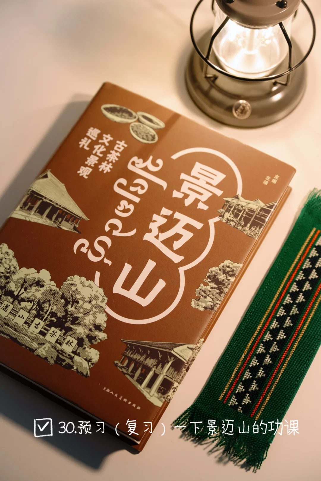 30.预习(复习)一下景迈山的功课:书籍推荐《景迈山古茶林文化景观巡礼》《景迈山建筑文化》《命运·主场·限一个茶村的生长故事》《景迈山·拾差记》《芒景布朗族与茶》《野阔澜沧》等。纪录片《开门的景迈》《天赐普洱》《偏向茶山行》《一夜茶,千夜话》《茶,一片树叶的故事》等。