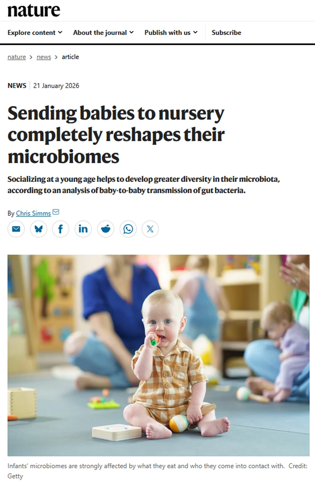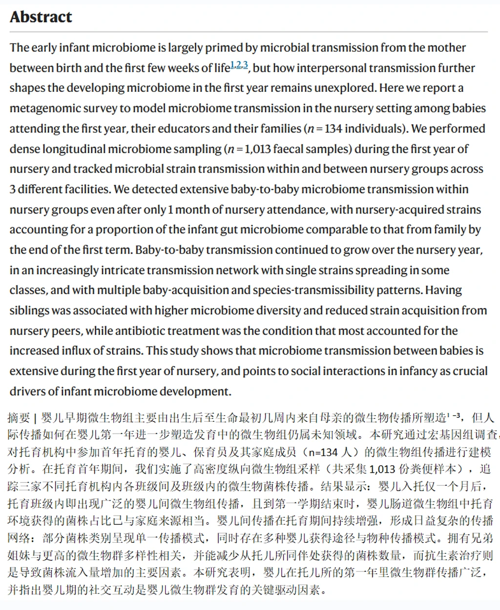 《自然》杂志刚刚发表了一项突破性研究,揭示了婴儿在托儿所的社会互动对其肠道菌群发育的重要影响。肠道菌群被称为人体的“第二大脑”,对免疫力、消化功能和整体健康至关重要。而这项研究发现,宝宝们在一起玩耍、互动的同时,也在无形中交换着宝贵的微生物资源。