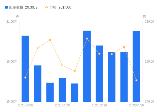 日期A股户数(户)流通A股户均持股数(股)户均持股市值(万元)2025-12-311874674561.88131.192025-12-191922024449.50128.092025-12-102032474207.70127.582025-11-281636555225.64141.462025-11-201677695097.50140.852025-11-101643255204.33157.142025-10-311772404825.11141.862025-10-201995094286.54113.262025-10-101768524835.69128.702025-09-301839424649.30132.74