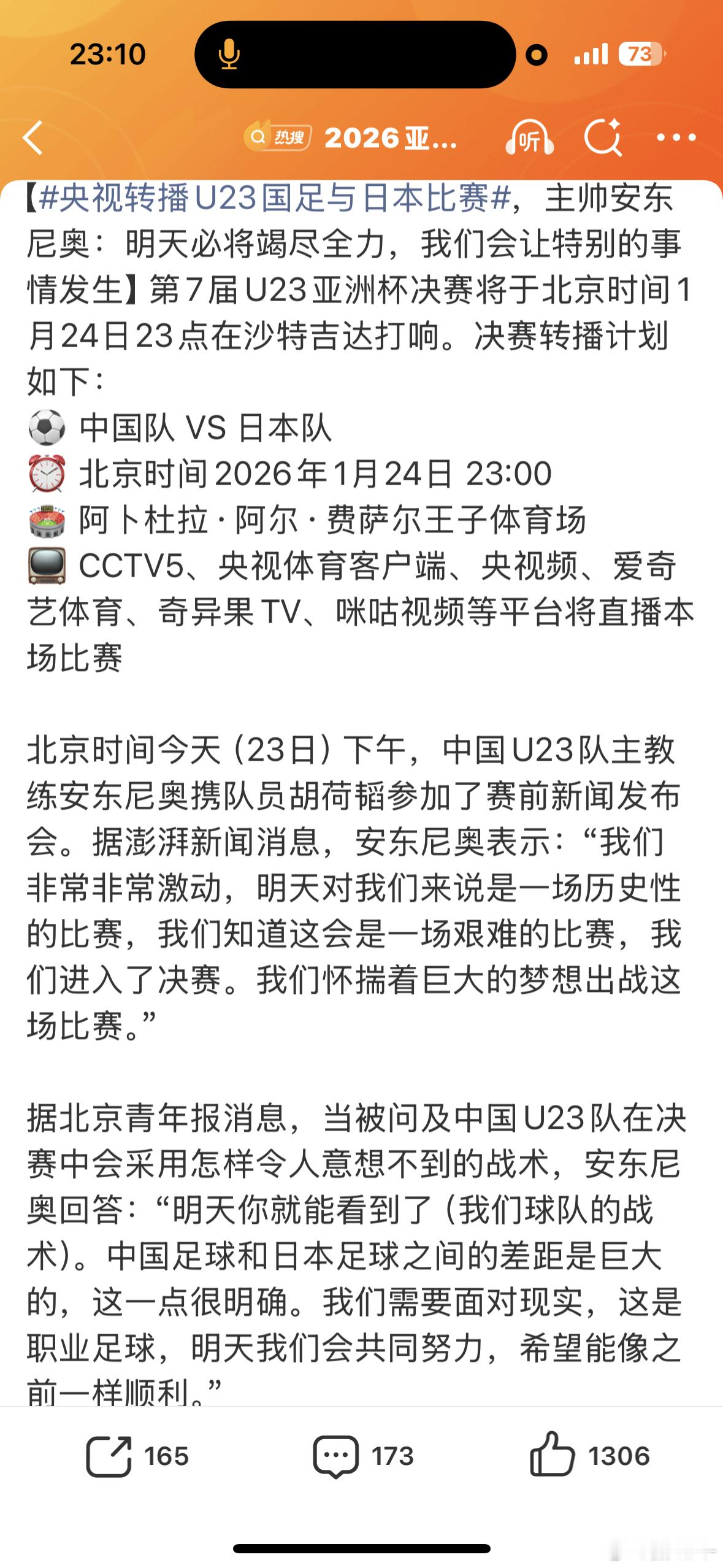 央视转播U23国足与日本比赛加油!加油!实力不详,遇日则强!