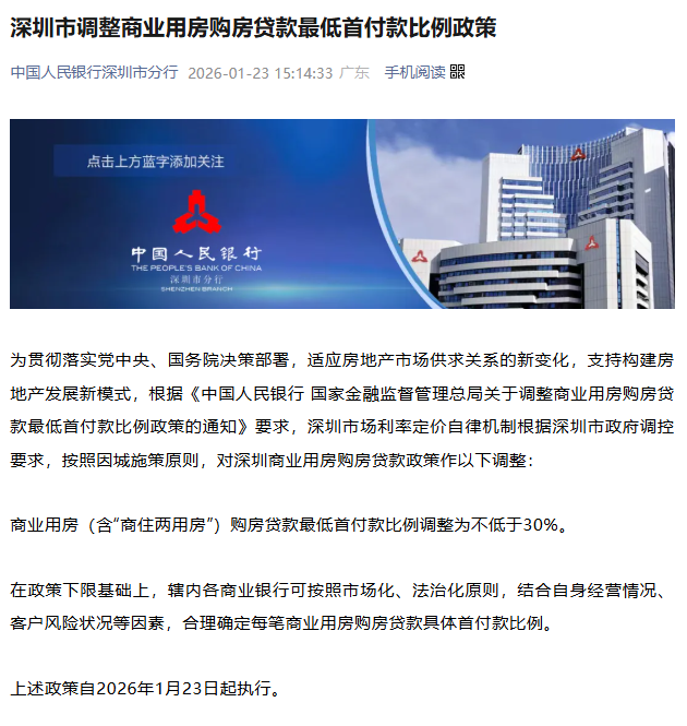 在此政策下限的基础之上,深圳辖内的各商业银行可依据市场化、法治化的原则,综合考虑自身经营状况、客户风险状况等多方面因素,合理确定每一笔商业用房购房贷款的具体首付款比例。该政策自2026年1月23日起正式施行。