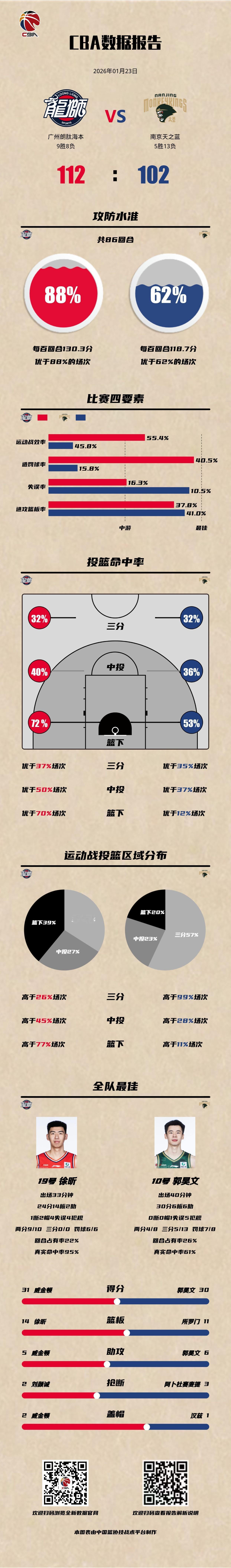 广州朗肽海本 112-102 南京天之蓝龙狮男篮vs同曦男篮 广州朗肽海本:威金顿31分4篮板5助攻2盖帽,徐昕24分14篮板2盖帽,霍勒迪17分7篮板; 南京天之蓝:郭昊文30分6篮板6助攻,马内克18分6篮板,所罗门15分11篮板2抢断。CBA数据库