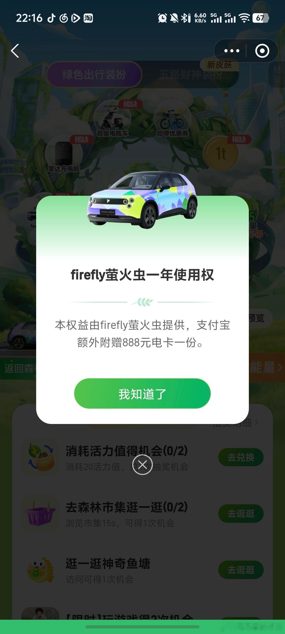 哦莫,看我发现了啥支付宝蚂蚁森林里面做任务抽奖可以抽到萤火虫一年的使用权还有888块钱的电卡蔚来萤火虫新能源汽车马斯克称中国电力增长十分惊人蔚来汽车