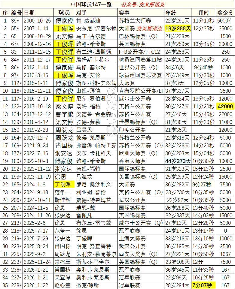赵心童职业生涯足够圆满了,拿了世锦赛、拿了英锦赛,满分147也完成了,且完成时间只比师父奥沙利文慢一丢丢。 中国共有13名球员打出147,丁俊晖7杆依然稳居榜首。