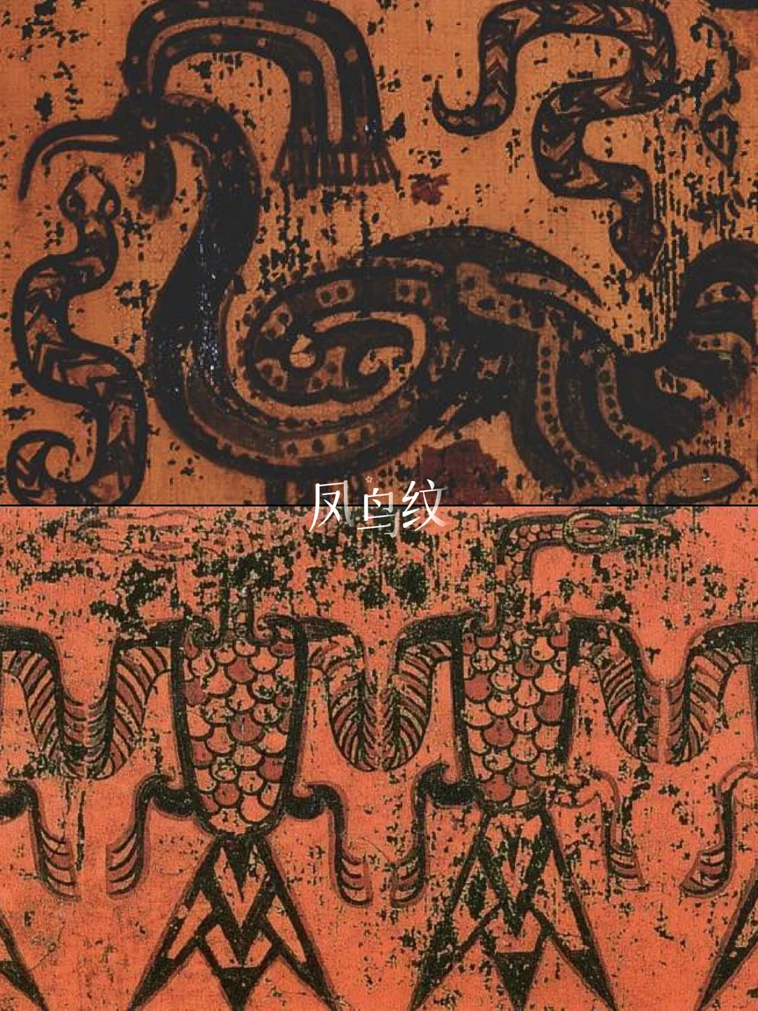 也有凤鸟周身鳞片,羽毛由条纹组成,尾部由三角形组成。