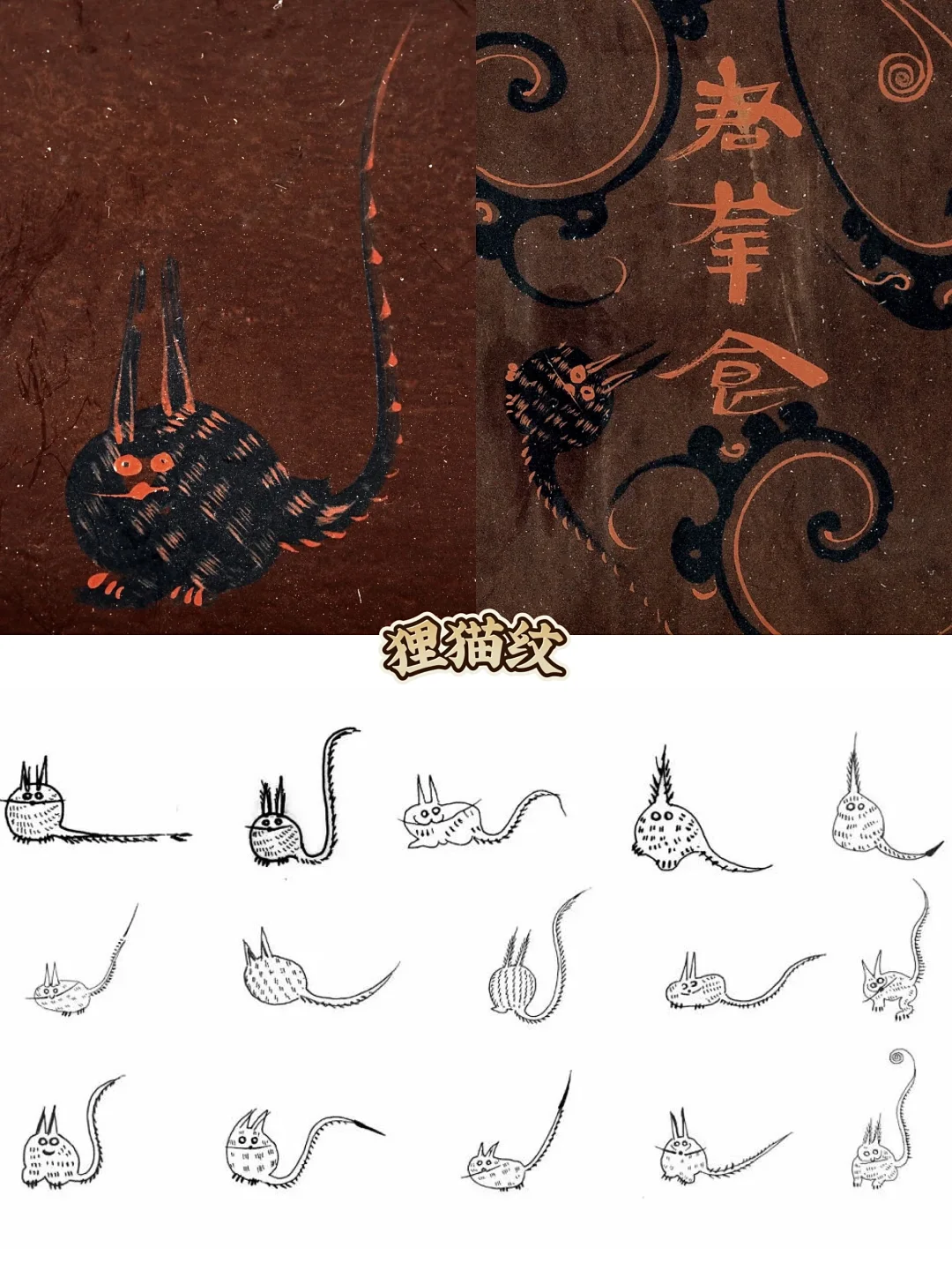 🔺还有些动物纹很有趣,比如狸猫纹,它们出现于马王堆的漆盘中,有着长长的尾巴,兔子般的耳朵,圆滚滚的身体和毛茸茸的爪子,像卡通画般呆萌可爱。