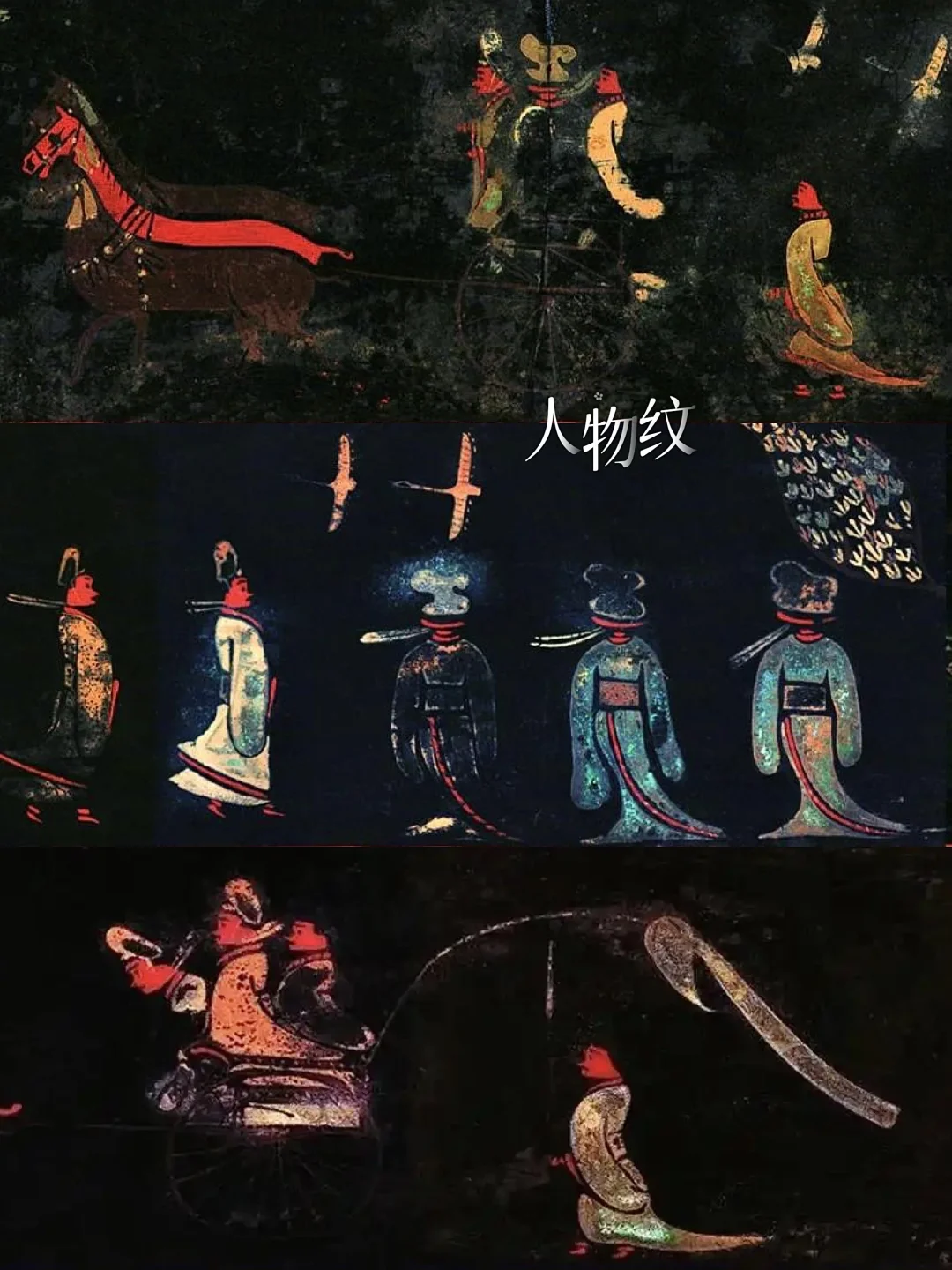 🔺此外,还有人物纹饰表现,像是在天地山水间浩浩荡荡的出行图,在自然动物中奔跑激荡的狩猎图,在莺歌燕舞中把酒言欢的宴乐图等等。
