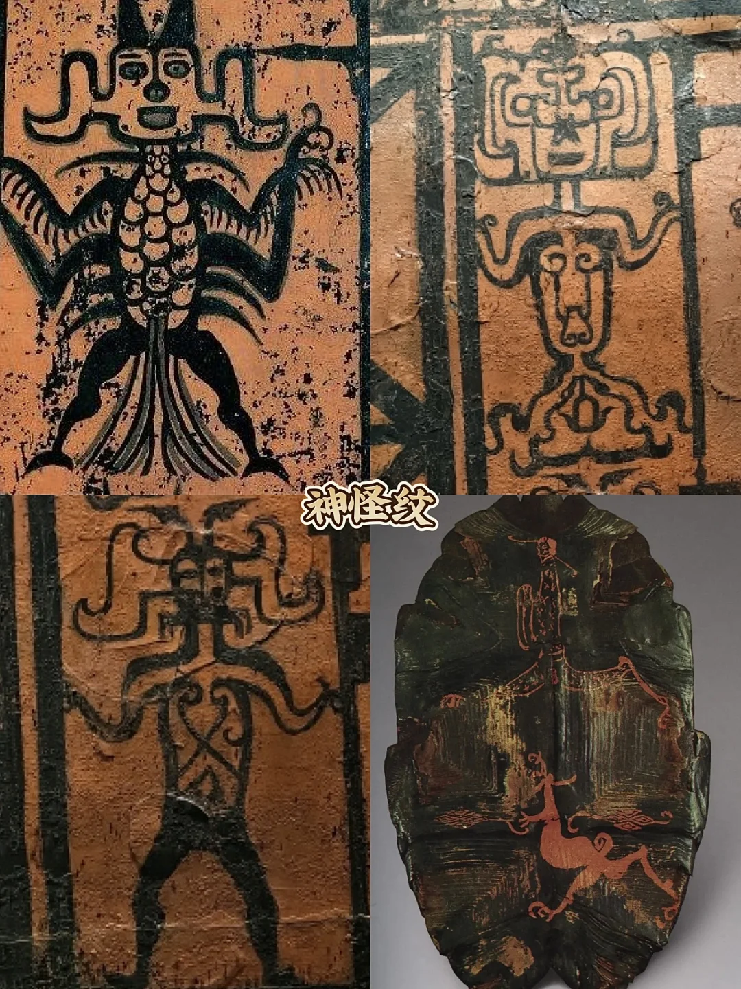 神怪纹一般出现于棺椁和兵器上,显示出震慑和保护的力量,所以看见类似人身鸟足,鸟首兽身,长角长尾的模样也见怪不怪了。