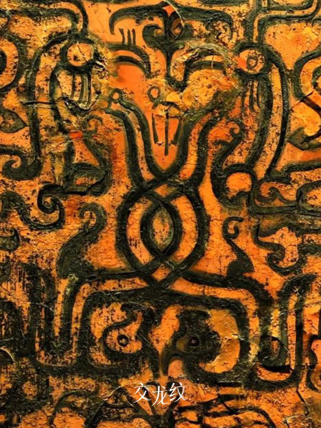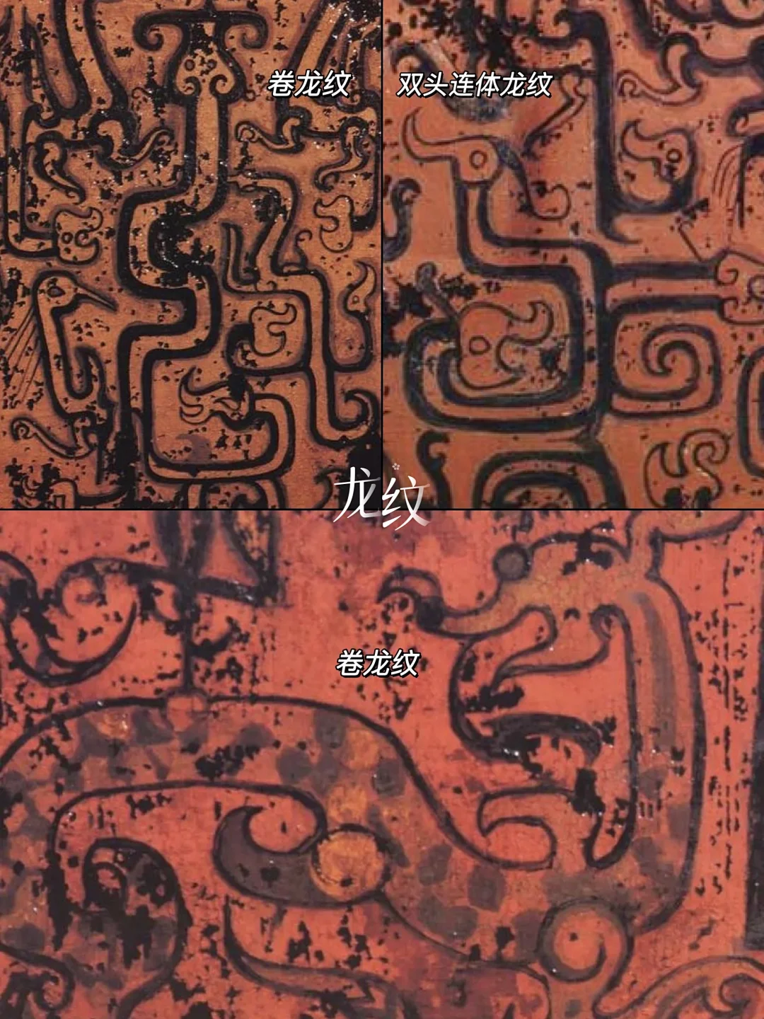 另一些龙纹则更为抽象,身体、首尾都用寥寥几笔简化,或侧视缠绕在一起,或俯视首尾相守,有的首尾均为龙头,有的如DNA般盘绕。