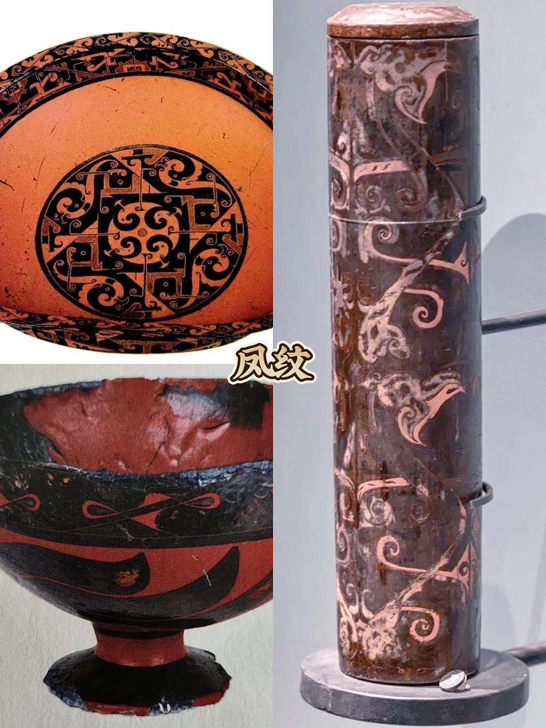 🔺同龙纹一样,凤鸟纹也为神灵化身,长尾凤英武雄健,短尾凤也叫鸡形凤,谐音“吉”,代表春天,象征五德。