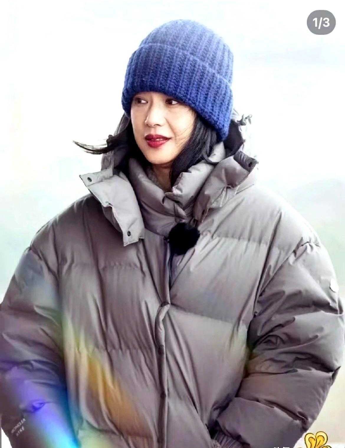 羽绒服想穿得不肿,周韵就三招。 第一,别选亮面,哑光布一上身,反光没了,人也