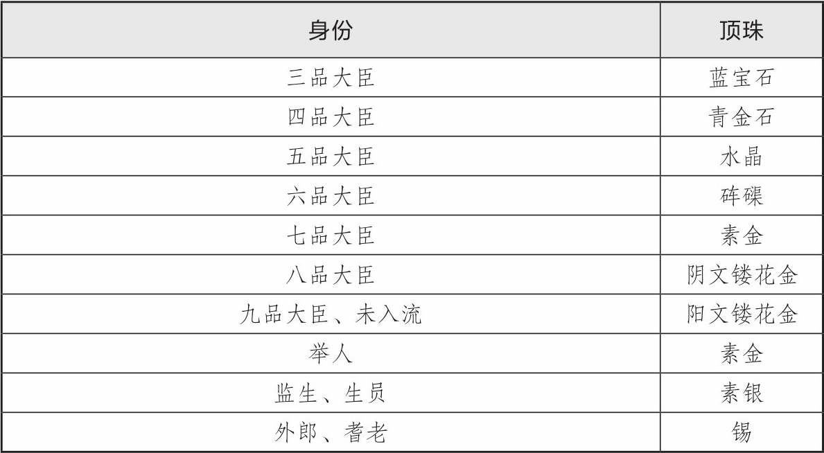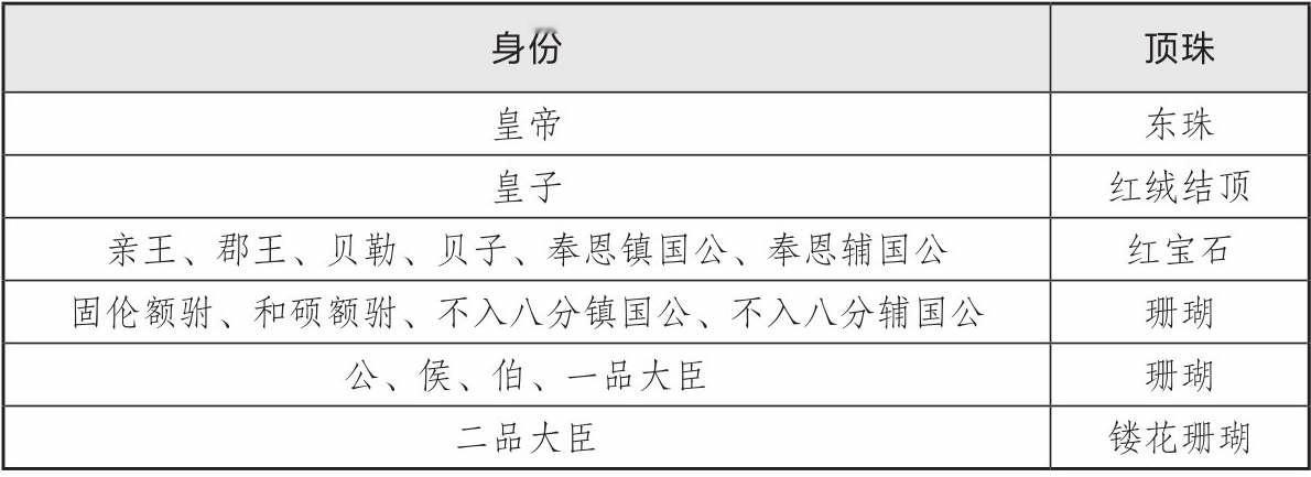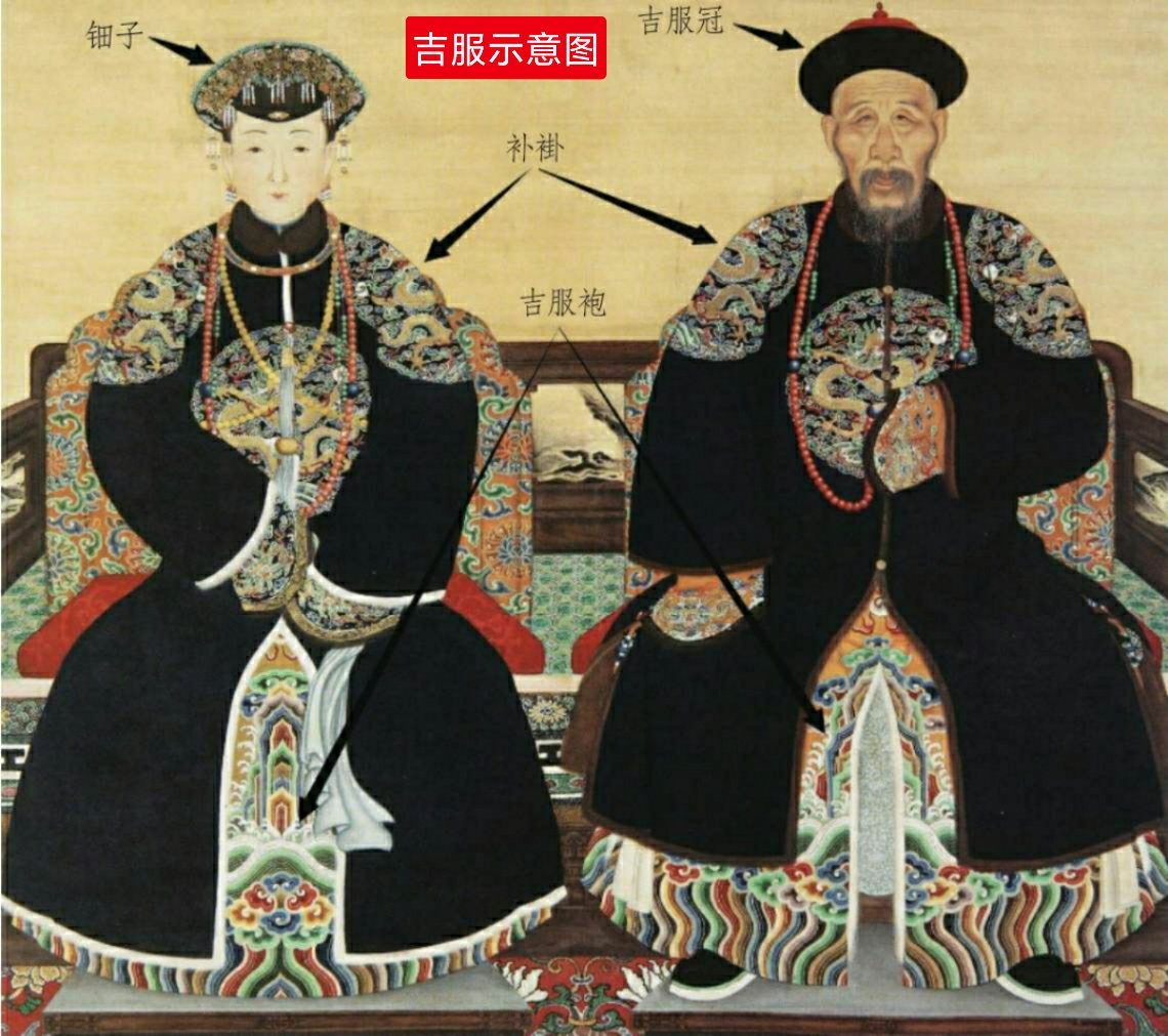 吉服是清代服制中等级仅次于朝服的服制,相比于朝服而言,吉服的使用就常见多了,不仅是在朝廷里使用,民间的官宦人家也会偶尔使用它,所以远比朝服贴近生活。源流清代崇德元年(1636)第一次确定官方服饰制度的时候,只有朝服一套服制。入关之后,冠服制度逐渐细化,便出现了“吉服”这一套服制。清代正式将吉服作为官方服制确立,是在雍正五年(1727)九月。当然,这并不表明雍正五年之前就没有吉服,正是因为当时吉服已经发展得比较成熟,它才会最终被确立在官方服制当中。定义吉服,清代文献中也称之为“嘉服”“盛服”“彩服”“花衣”。又因为其主要组成部分之一的吉服袍被称为“龙袍”“蟒袍”,故而这两个词也常作为吉服的代表。[需要注意的是,虽然朝袍和吉服袍上都有龙、蟒纹,但是清代时“龙袍”“蟒袍”是专指吉服袍的,而朝袍则用“礼服”“朝袍”来称呼]如其名“吉”字所显示的,吉服主要用于一般的喜庆仪式、典礼,以及祭祀上,其使用场合的重要程度仅次于朝服的使用场合。而对于宫外的官宦人家而言,迎接“天使”[宫中派来的使者]、诏书,以及过寿、婚庆等,都会用到吉服。另外,清代官宦人家“百年之后”,也经常是穿着吉服下葬的。[也有一些是穿着朝服入殓的]根据清代官方规定,所有等级的男性官员都有对应的吉服制度,女性中,宫廷里只有皇太后、皇后、皇贵妃、贵妃、妃、嫔六种位分的后宫才有吉服制度,宫廷外的命妇里,只有一品到七品的命妇才有吉服制度,也就是说,低于嫔位的内命妇和低于七品的外命妇,均是没有官定的吉服制度的。同时,与朝服一样的是,女性中穿着吉服的人以旗人为多,对于民人命妇而言,在应该穿着吉服的场合,她们更习惯于穿汉服传统的凤冠霞帔来代替吉服。比较有趣的是,虽然吉服和朝服一样都是比较正式的高级礼服,但是吉服因为使用场合多,所以灵活度是高于朝服的,其中以女性为甚。具体而言,清代中期以后朝袍的样式,几乎没有与官方规定不同的,而清代女吉服袍,在官方规定的几种样式搭配之外,还有很多灵活的样式和搭配,凸显了其生活性的一面。吉服的组成一套标准的男吉服,除去内衣、底袍这些基础外,主要由吉服冠、吉服袍、补褂或端罩、朝珠、吉服带、朝靴或便靴六个部分组成。具体来说,即是头戴吉服冠,内穿吉服袍,外穿补褂或端罩,颈挂一挂朝珠,袍外腰上系吉服带,下穿朝靴或便靴。一套标准的女吉服,是由五个部分组成,分别为吉服冠、吉服袍、补褂、朝珠、朝靴或便靴或高底鞋,同时搭配耳饰。具体来说就是头戴吉服冠,内穿吉服袍,外穿补褂,颈挂一挂朝珠,下穿朝靴或便靴或高底鞋。但是根据民间的使用情况而言,吉服冠可以替换为钿子[实际上,清末民初的旗人照片中也有用坤秋等便帽或者两把头等便装发式来搭配吉服袍的,此处不作细致讨论],单挂朝珠可以改用为三挂,装饰物则可以加用领约、采帨等,较为自由。吉服冠男吉服冠分为冬、夏两款。冬吉服冠一般以海龙、薰貂、紫貂为质,帽檐上仰,上缀朱纬,基本与冬朝冠相同,唯一的区别在于,朝冠上铺设的是一层厚实细密的红绒,并且“长出檐”,而冬吉服冠用的则是朱纬,而且只是“长及檐”。夏吉服冠一般以织玉草或藤竹丝为质,罗为表,红片金或红纱为里,帽檐敞开,上缀朱纬,内加圈,基本与夏朝冠相同,区别在于,夏朝冠表面有两层,呈阶梯状,且红绒较厚,夏吉服冠表面只有一层,朱纬较薄。更重要的区别在于“顶子”的不同。朝冠的“顶子”均由底座和宝石两部分构成,其底座较大,装饰复杂,宝石也多为椭圆形或菱形,而吉服冠的“顶子”虽然也是由底座和宝石两部分构成,但是吉服冠的底座虽然称为底座,其实不过是一个金质的“托”而已,小且简单,没有过多的纹饰,而宝石更是均为正圆形。所以看起来,吉服冠要比朝冠“矮小”得多,具体如表所示。一品大员的朝冠还能用红宝石顶,到了吉服冠就只能用珊瑚顶。由此可知,朝廷有的时候赏赐某些公爵或一品大员“加恩赏用宝石顶”,即吉服冠顶。顺便一提,吉服冠正式形成于雍正朝,雍正五年(1727)确定了吉服冠之后,在雍正八年(1730)又下达了一条上谕,提到冠顶过于昂贵,很多大臣佩戴不便,所以允许他们使用料器以替代之。所以后来吉服冠的冠顶多数是用玻璃代替宝石的,即用亮红料器替代红宝石,用涅(暗)红料器替代珊瑚,用雕花涅(暗)红料器替代镂花珊瑚,用亮蓝料器替代蓝宝石等。当然,还是有一些所谓的“世家旧族”或豪富人家在坚持用宝石质的顶子。红绒结顶,俗称“算盘疙瘩顶”,满语称为“ijasha mahala”,是用红绒结成的一团球状物作为帽顶。别看它看上去特别朴实,但是只有皇帝和皇子可以在冠上用这种大红绒的顶子。曾经有某位皇子指着某亲王的红宝石吉服冠顶,开玩笑说:“您这顶子,动辄几百两银子,我这红绒只需要几百铜钱,但是我这比您的厉害多啦。”清代女吉服冠则只有冬季一款,其样式和男冬吉服冠基本一致,顶子部分也和男吉服冠一样,只有金质的小底座,上衔一颗正圆的顶珠,具体如表所示。目前认为,女性没有夏吉服冠,是因为当时已经形成了在夏季佩戴钿子的习惯,所以默认为夏季戴钿子。