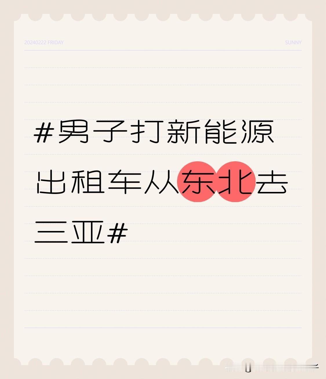 男子打新能源出租车从东北去三亚 1月23日新闻真是让我开了眼,李先生打新能源出租车从沈阳去三亚,全程3500多公里,已跑2000多公里了。他承担过路费等,预计总费用约2万。 他俩每天开600多公里,每200公里左右在服务区给车充电。而且一路玩着走,到岳阳就去岳阳楼和洞庭湖逛了逛,这小日子挺美。司机也觉得这是次美好旅行,他从没开过这么远。 要是我,才舍不得花这2万打车,坐飞机多快,剩下钱还能住好酒店、吃美食。不过李先生这种体验也挺特别,边走边玩,像谈细水长流的恋爱。