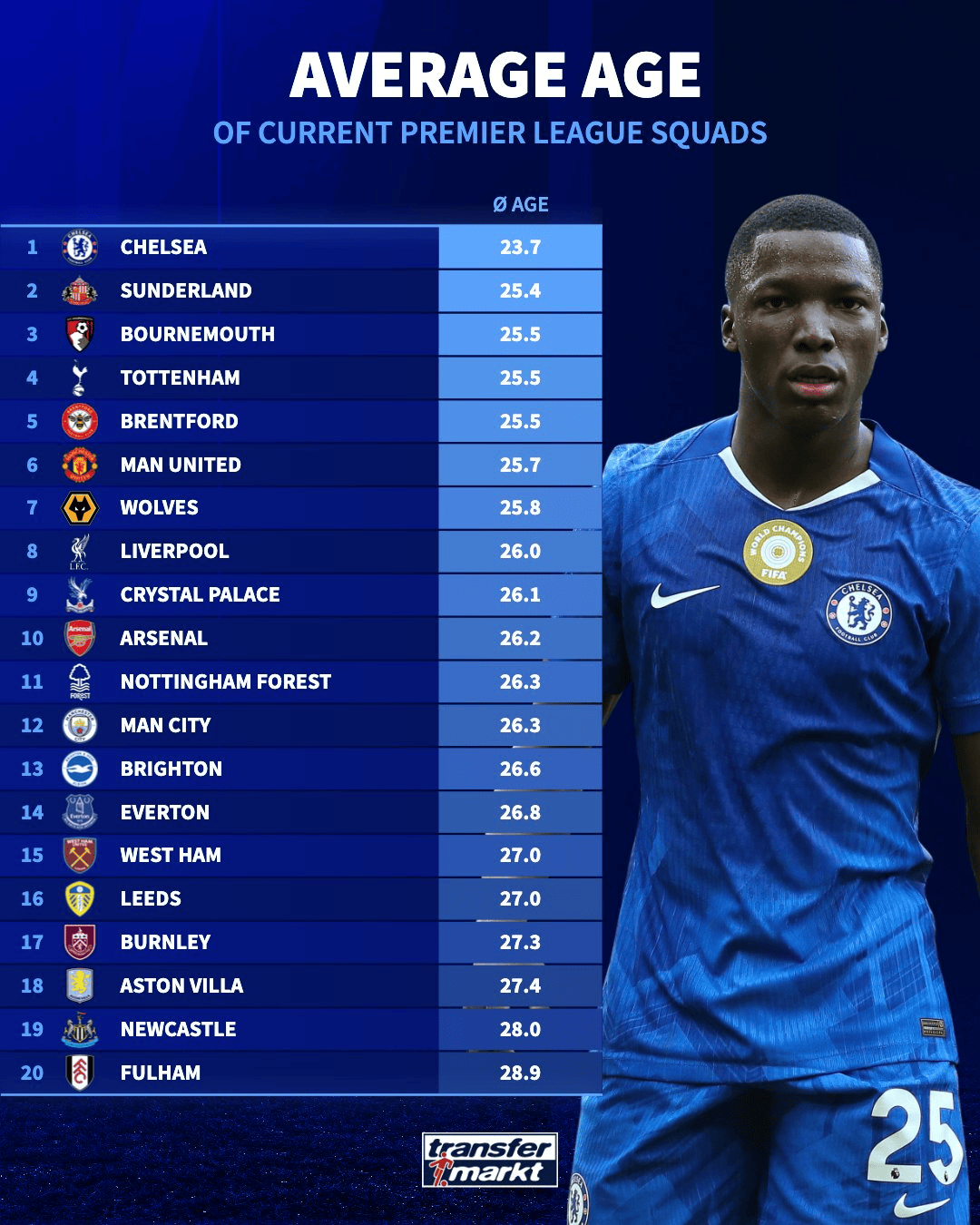 虎扑01月24日讯冬窗正在进行中,德转发布榜单,统计英超各队阵容的平均年龄。