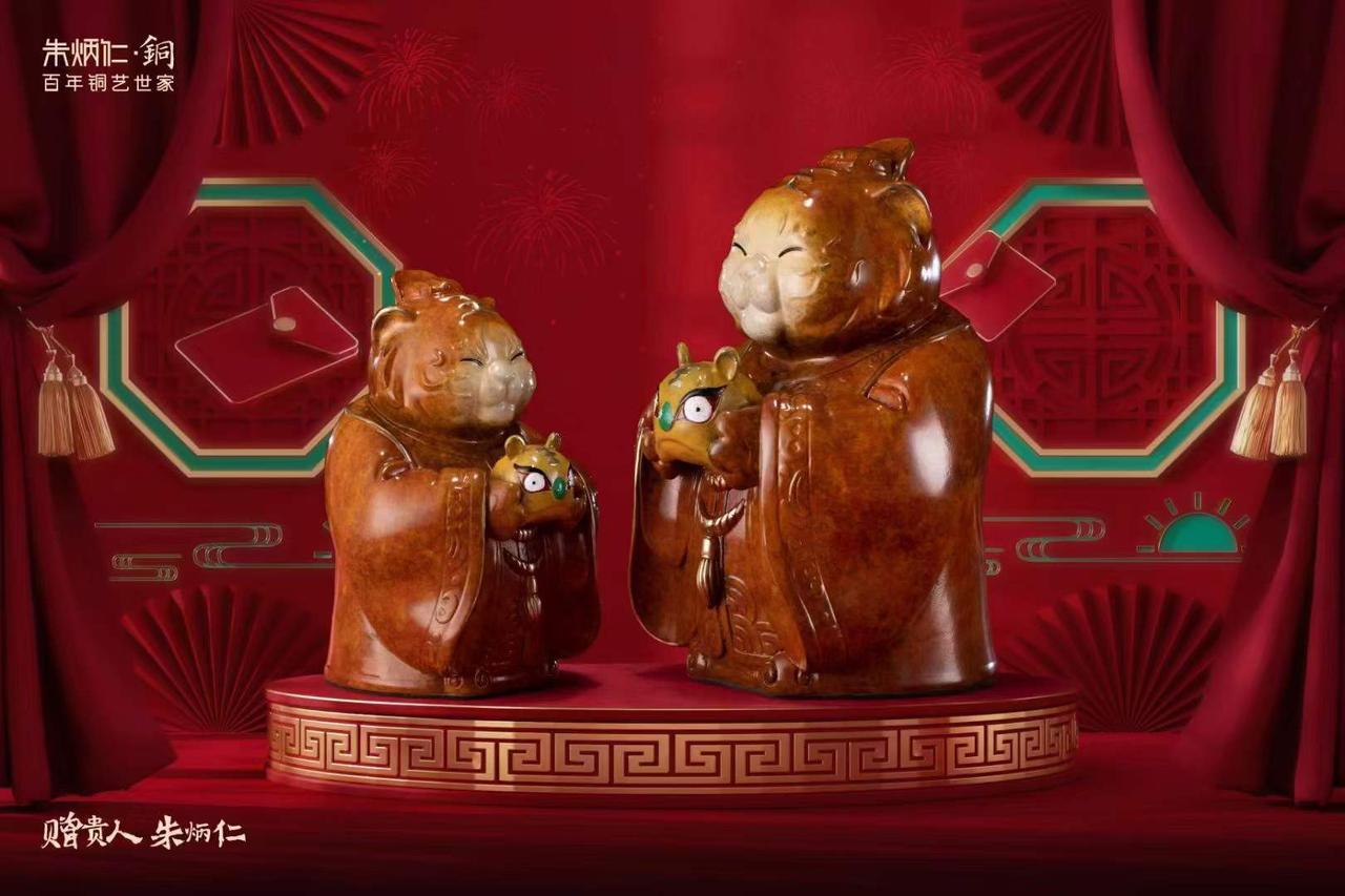 春晚特别节目上,朱炳仁大师又给我们带来了惊喜,他的《五福天虎》也太霸气了吧,前足挺立,后足端坐,颠覆我们传统的思维。 算起来,这已经是他第七次上春晚特别节目了,记得猴年的春晚特别节目上,看到一个铜质的生肖艺术品,就被吸引住了。 后来我才得知,这个艺术品有个名字叫《侯来居上》,是朱炳仁大师的作品,朱炳仁出生在铜艺世家,作为第四代传人,他对炼铜技艺有一种发自内心的热忱。 2006年,一场大火让他受到很大损失,伤心之余,朱炳仁也发现铜被融化后的美,形体千姿百态,凭着敏锐直觉,一个全新的熔铜艺术诞生。铜液在模具里流淌,朱炳仁控制着流淌的方向,这样出来的作品,每个都是独一无二的,有浑然天成的美感。 朱炳仁的家训是“以铜立人,以书立世”,在他的作品中,可以看到铜、木、石、玉以及书法等艺术相融合, 他也被评为中国工艺美术大师。 他敢创新,还提出把故宫文化带回家的理念,研发了200多个故宫文创作品,也让熔铜艺术走向世界,搭建了传统与现代沟通的桥梁。 再后来,他的作品登上春晚舞台,《鸿运当头》《雪爪卢》《天柱赐福》《小小飞鼠》《五牛积福》等作品跟我们见面,个个妙趣横生。 虎年,他也给我们带来虎年生肖作品,有猛虎回头,也有虎娃萌态,很有创意,能够把铜艺和生肖结合,真的是了不起的创作。 中国的传统文化博大精深,每一次接触,都会让思维得到洗礼。 @朱炳仁再掀虎年热潮,各种形态的虎生肖作品栩栩如生,带给我们美的体验,也愿朱炳仁·铜艺术品能够走向世界,让更多人看到中国文化的魅力。