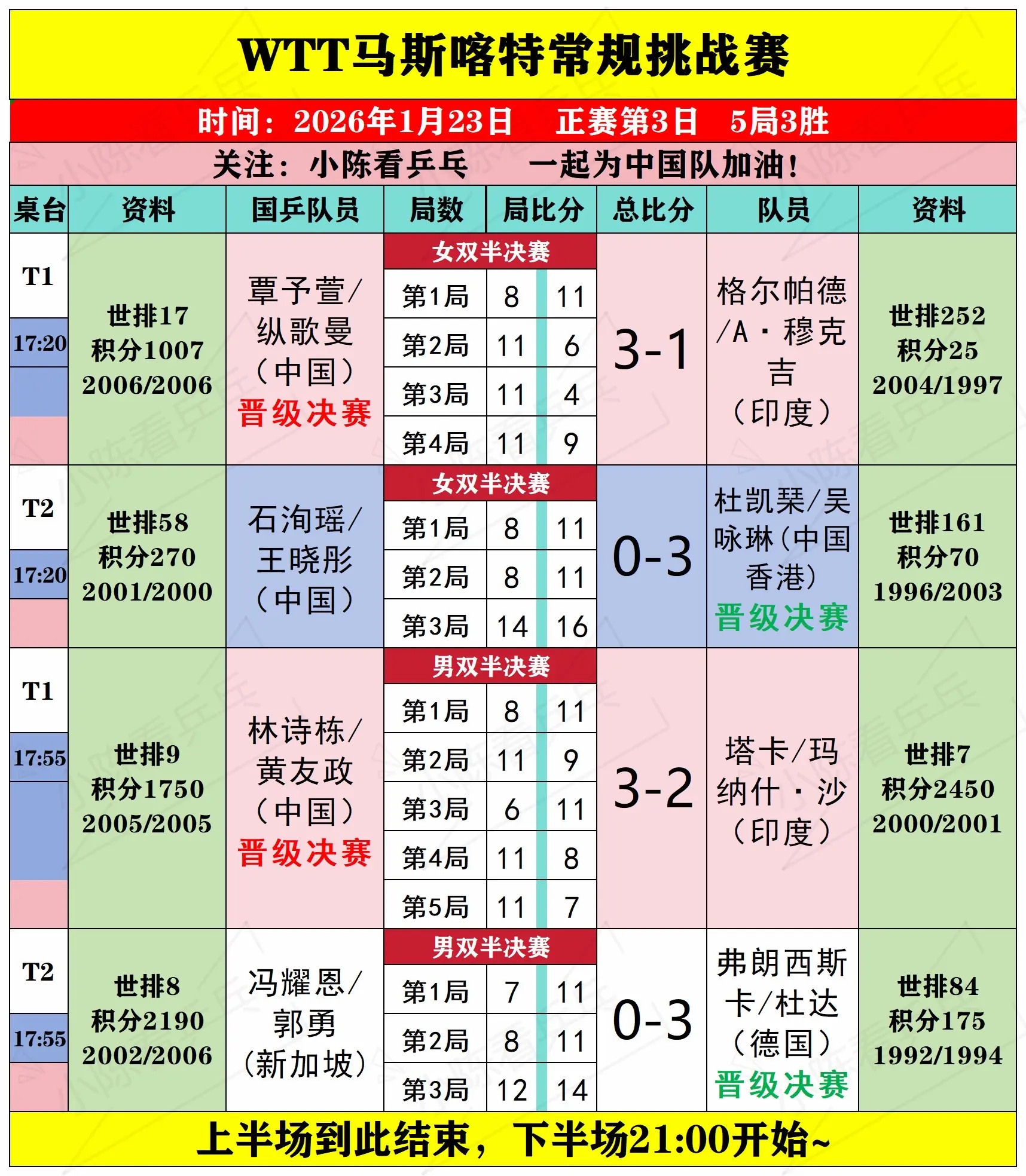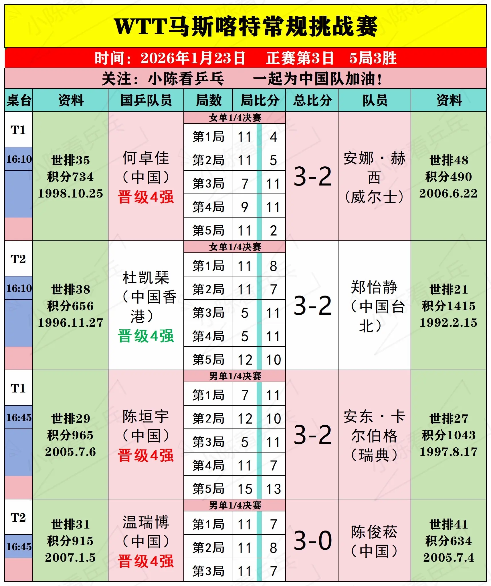 WTT马斯喀特常规挑战赛23日上半场赛况。WTT马斯喀特常规挑战赛1月23日上半场赛况,男女单打1/4决赛,男女双打半决赛,中国队继续加油。