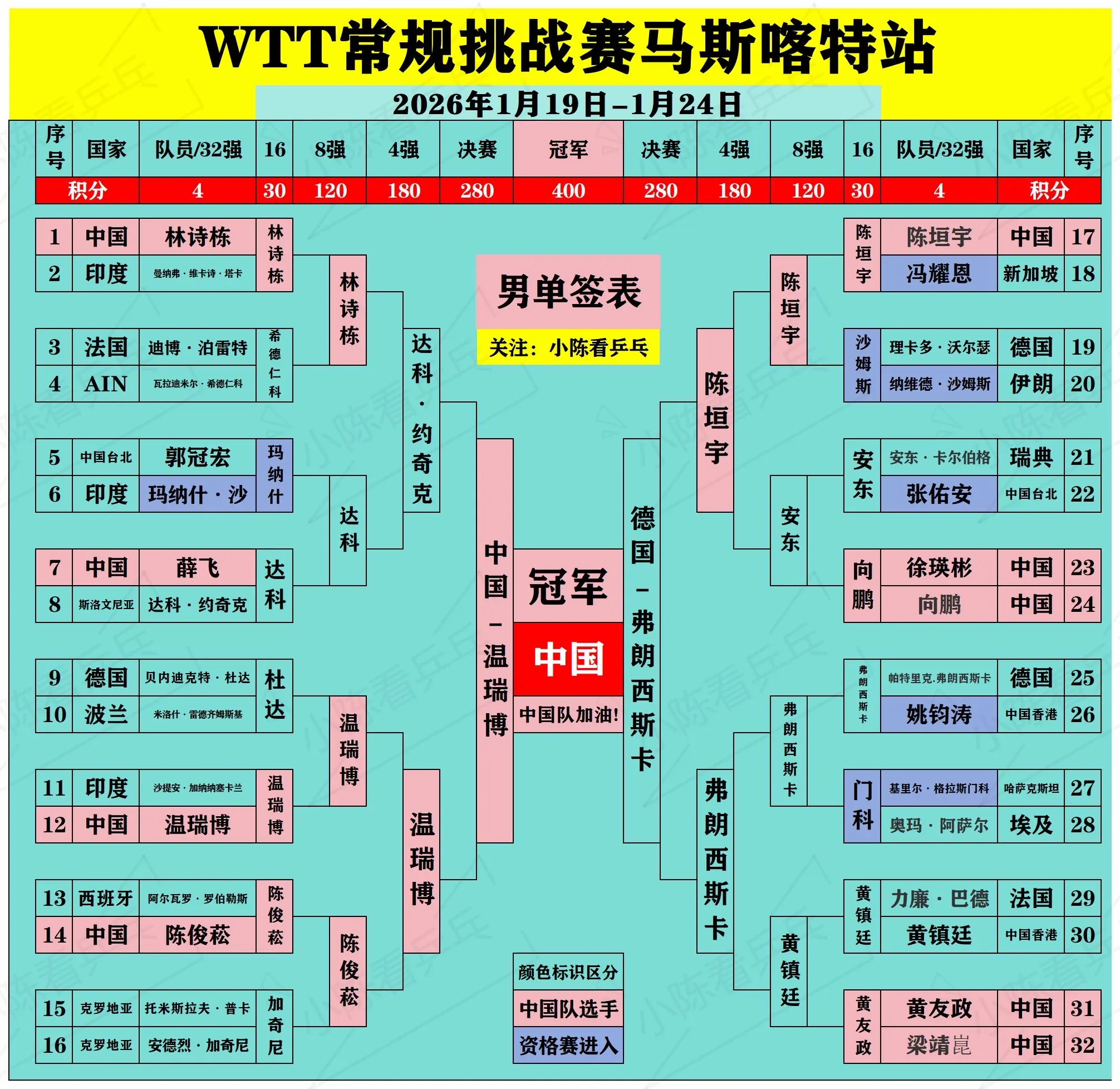 WTT马斯喀特常规挑战赛签位图更新。WTT马斯喀特常规挑战赛签位图更新...