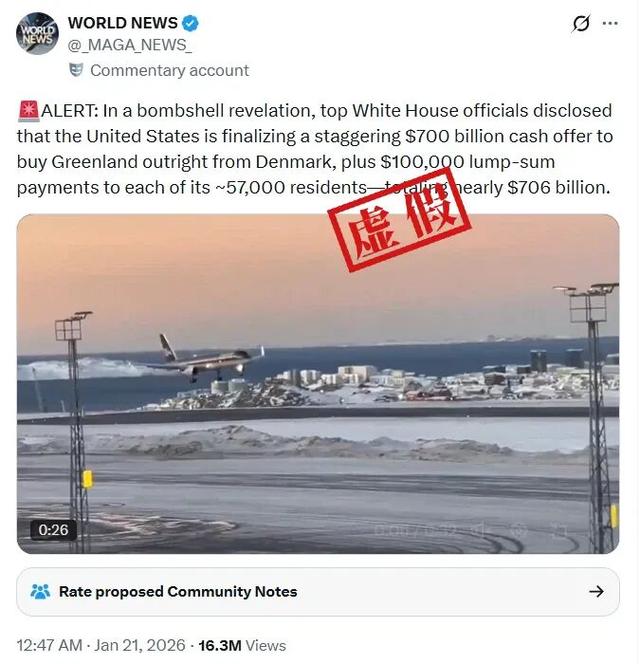 报道中没有提及“每人一次性支付10万美元”的细节。关键词溯源发现,这一说法最早来自名为@MAGA_NEWS_的X平台账号。这是一个被标记的“评论账号”(用于区分与当事人相关的实体账号),也正是这一账号最早在1月21日发布了所谓“敲定购买格陵兰岛方案”的说法,但没有提供任何信源。