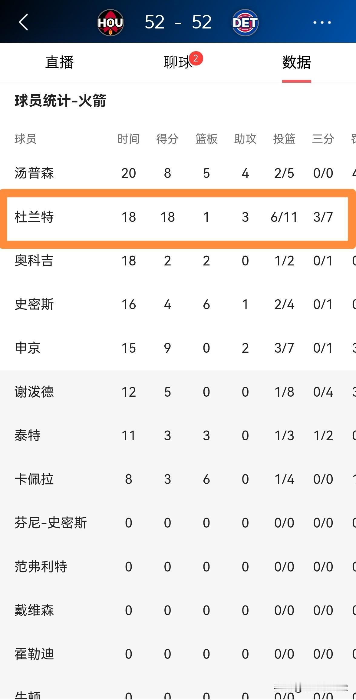 火箭超级巨星杜兰特不愧是球队的大腿!在今天进行的火箭和活塞的比赛中,目前双方的上半场比赛已经结束,火箭和活塞战成了52平。值得一提的是,杜兰特是火箭阵中唯一得分上双的球员,他在首发出战的18分钟里,投篮11中6,其中三分球7中3、罚球4中3砍下18分,还有1篮板3助攻,他的场上正负值为+1。 杜兰特不愧是火箭的大腿,假如没有杜兰特的出色表现,火箭早就被活塞打懵了。