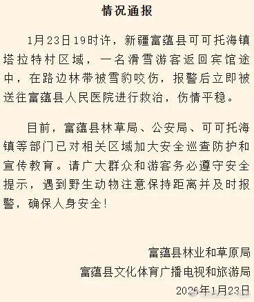 【新疆可可托海发生雪豹伤人事件,官方通报——】“富蕴零距离”微信公众号23日发布情况通报:1月23日19时许,新疆富蕴县可可托海镇塔拉特村区域,一名滑雪游客返回宾馆途中,在路边林带被雪豹咬伤,报警后立即被送往富蕴县人民医院进行救治,伤情平稳。目前,富蕴县林草局、公安局、可可托海镇等部门已对相关区域加大安全巡查防护和宣传教育。请广大群众和游客务必遵守安全提示,遇到野生动物注意保持距离并及时报警,确保人身安全!此前报道据扬子晚报报道,1月23日新疆可可托海景区外宝石沟附近发生雪豹伤人事件,伤者已送医救治。网传视频显示,一名紫色滑雪服游客躺在雪地,身旁有雪豹警惕观望,另有视频显示,伤者被搀扶救助,面部带血。当地民宿主证实此事,称疑似同一只雪豹1月22日傍晚曾现身民宿对面草场,推测因觅食困难靠近居民区。民宿主表示,雪豹非主动攻击,系游客靠近引发。宝石沟是塔拉特村到雪场的途经点,距民宿仅几公里。据潇湘晨报报道,受伤游客已于23日20时许被120送入富蕴县人民医院急救科。新京报记者从当地政府部门获悉,该名游客无生命危险,正接受治疗。记者注意到,当日阿尔泰旅游发展集团官方账号发布了宝石沟一带有雪豹出没的消息:1月17日、21日,可可托海景区宝石沟一带红外相机连续拍摄到神秘“雪山之王”雪豹出没的画面,该区域正是前往可可托海国际滑雪度假区的必经之路,请途经游客切勿下车或靠近拍照,不要在此逗留,更不要单独在周边行走。(来源:“富蕴零距离”微信公众号、扬子晚报、潇湘晨报、新京报)