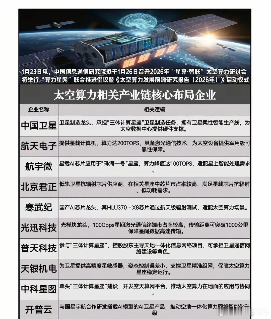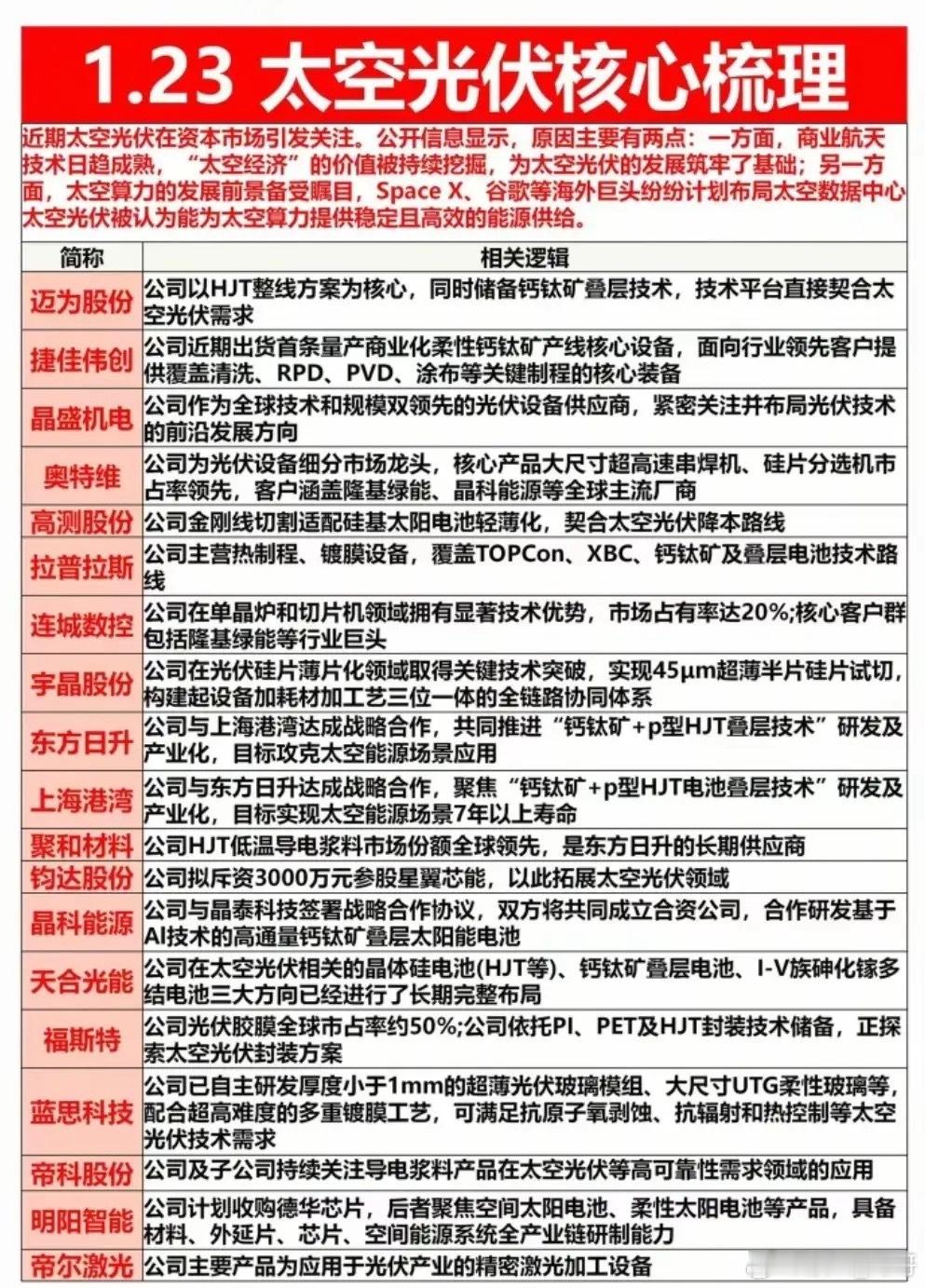 新题材:太空光伏+太空算力概念1月23日最新消息,马斯克在达沃斯称SpaceX与特斯拉计划3年内达成每年100GW太阳能产能,发力太空AI算力卫星与光伏结合。太空光伏核心是在太空环境利用光伏技术发电,为卫星、空间站等航天器提供电力,技术成熟,太阳翼是主流形态,占卫星电源系统60%+价值量。机构预测2035-2040年卫星太阳翼市场空间约3288亿元,较当前放大30倍。太空算力是把高性能计算与AI部署在卫星/空间站等天基平台,实现“天感天算”。1月23 日中信研究院召开“星算、智联”研讨会,启动《太空算力发展前瞻研究报告(2026)》,推“算力星网”倡议。太空光伏概念龙头代表:东方日升、乾照光电、明阳智能等等。太空算力概念龙头代表:中科星图、天银机电、航天电子……