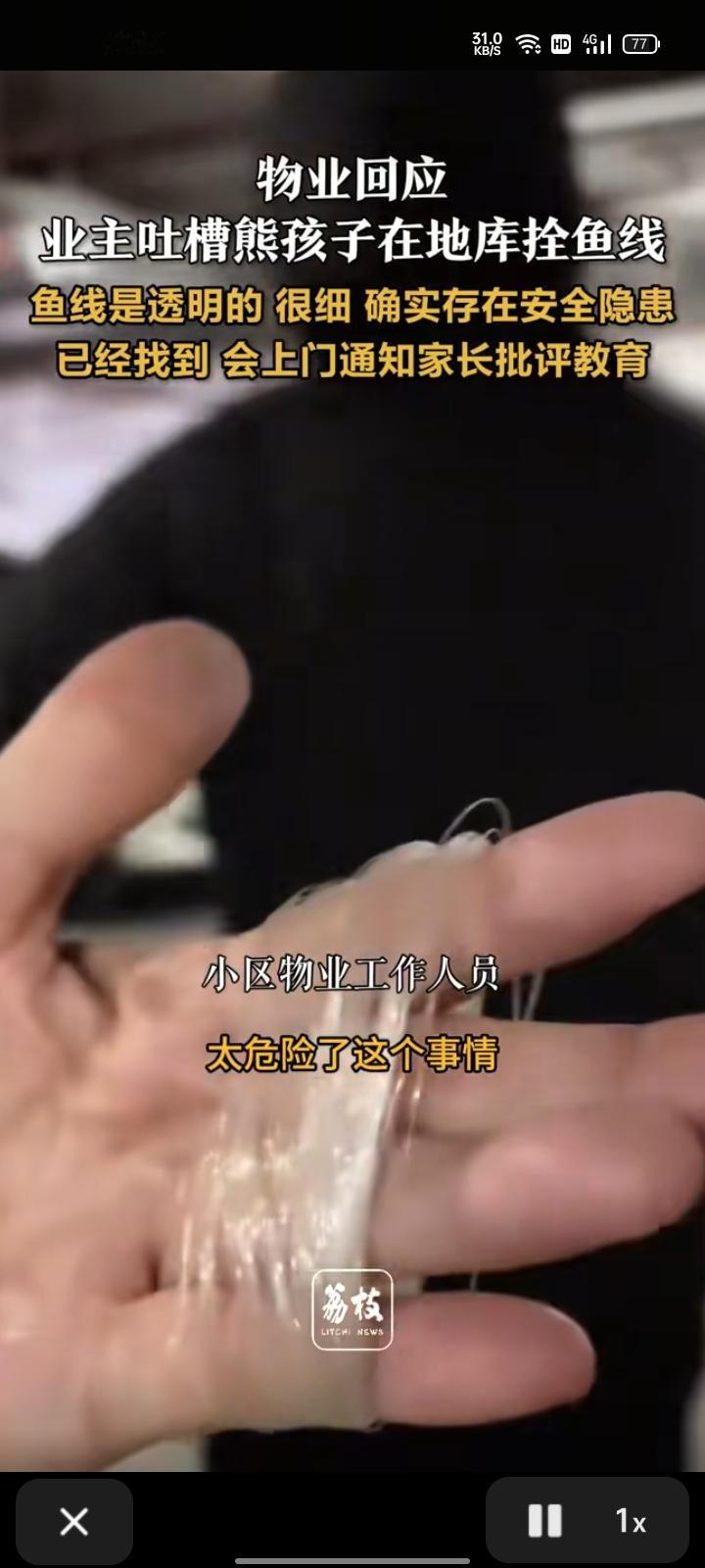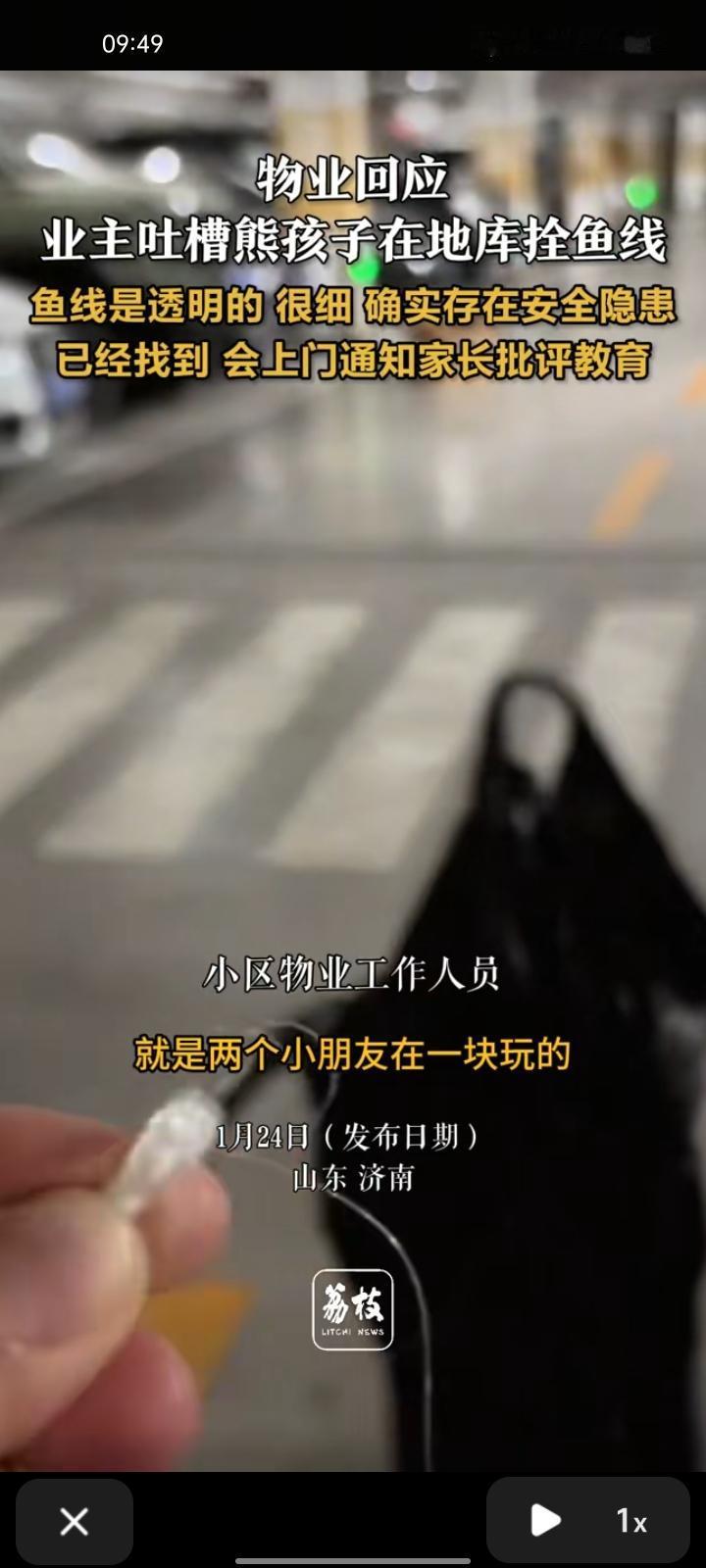 1月23日,山东济南。网友晒视频吐槽称,在锦悦府小区的地下室发现一根透明鱼线,不知道是谁家小孩弄的。套上了黑袋子看看鱼线有多长,都连成一个线管了。 物业回应称,鱼线是透明的,很细,确实存在安全隐患,会联系家长批评教育。