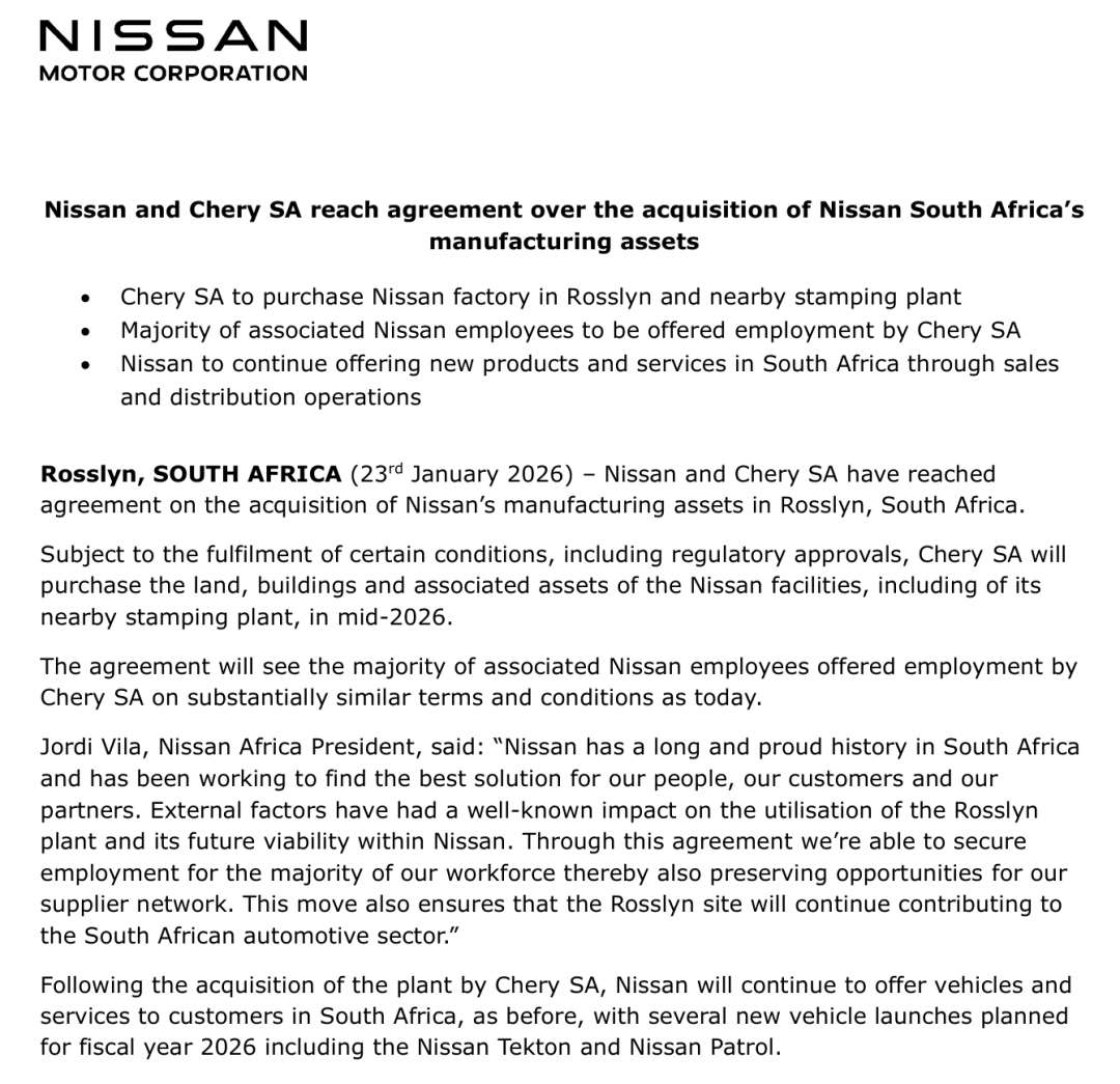 1月23日,日产汽车在官网宣布,日产和奇瑞就收购日产南非公司达成协议。日产汽车称,在满足包括监管批准在内的某些条件后,奇瑞南非公司将于2026年年中收购日产罗斯林工厂的土地、建筑物及相关资产,包括其附近的冲压厂。