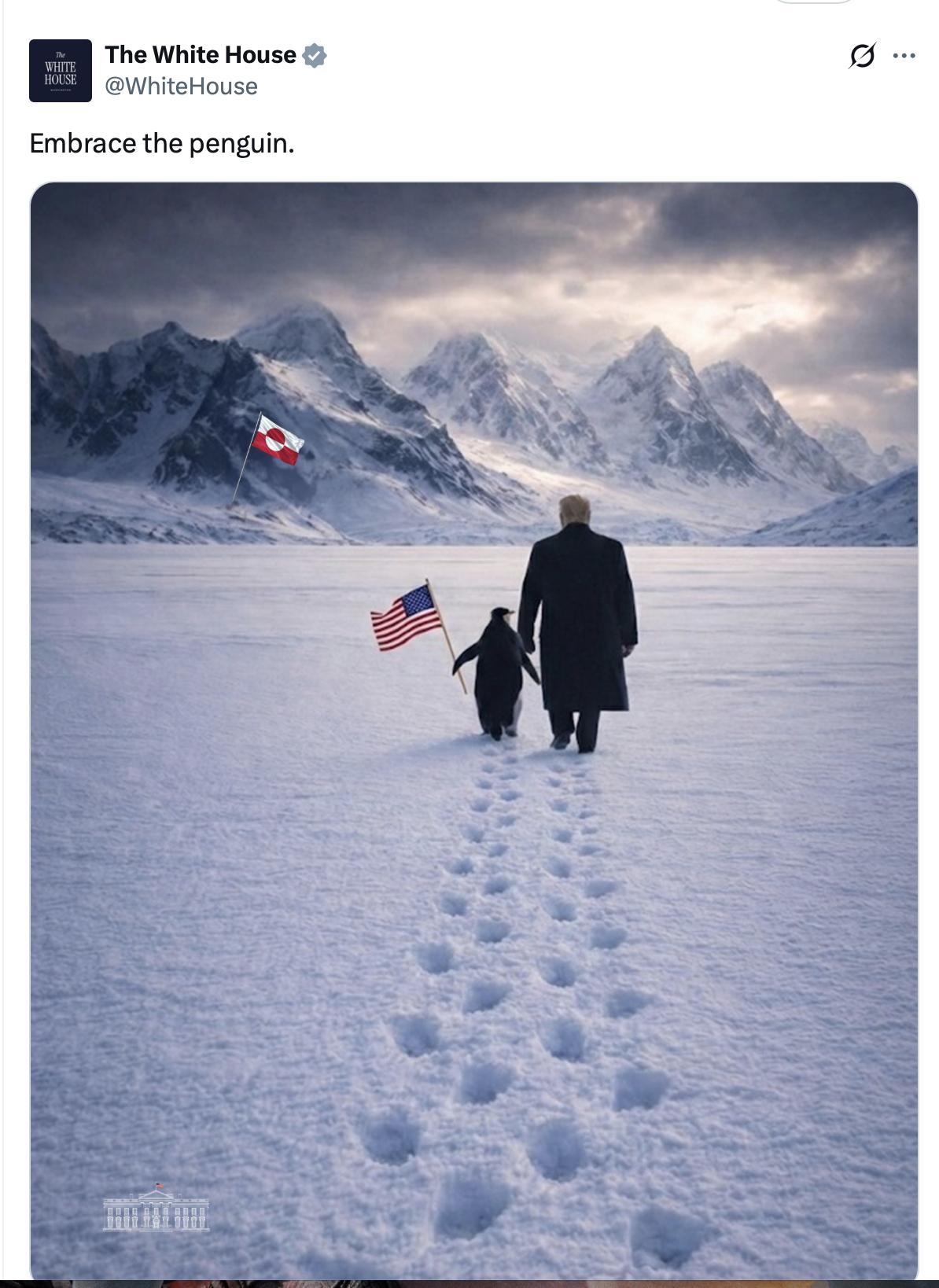 不是吧,这是白宫哪个大哥大姐发的帖子,格陵兰岛在北极,企鹅在南极,北极有的是北极