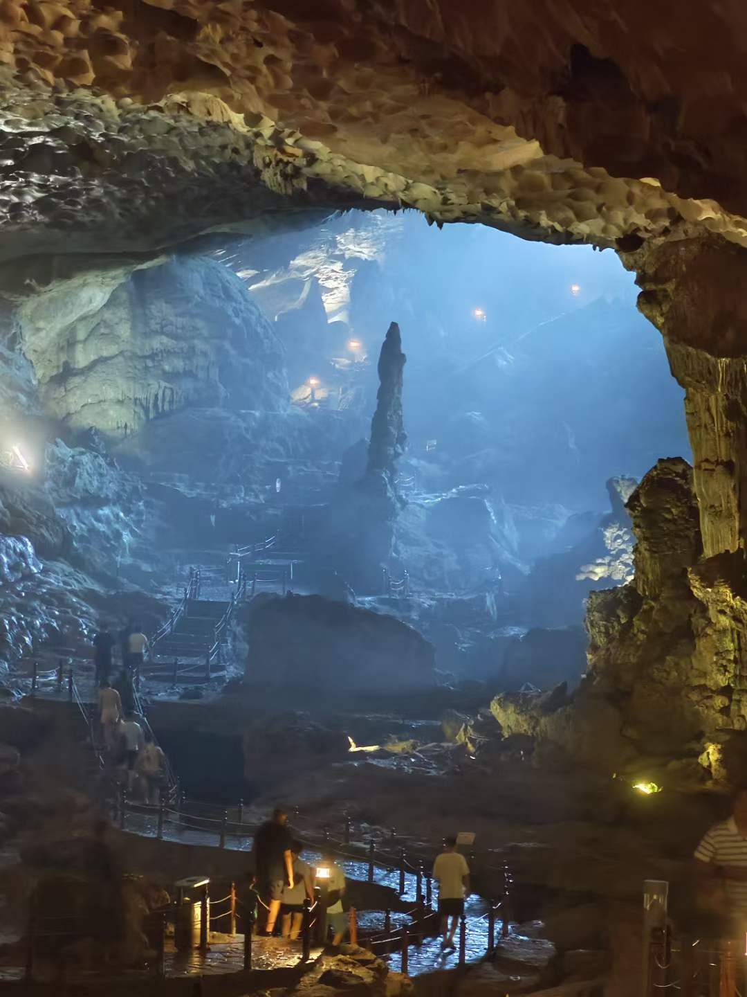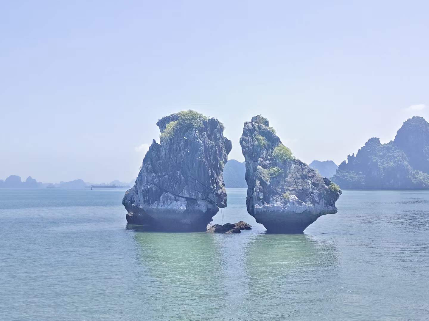 下龙湾海中的山体,为我们熟悉的喀斯特地貌,由于山体高大,在码头便能远远望见形态各异的山石,仿若漂浮在海面上,搭配海面升腾的水汽和远眺的模糊,犹如一副山水画卷,让人心旷神怡,迫不及待踏入人间仙境。