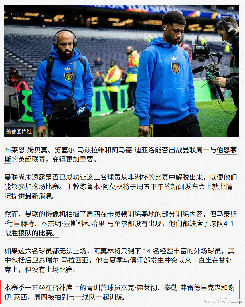 现在也是时候兑现阿莫林此前提到的让青训球员参与一线队比赛的诺言了,本赛季一直在替补席的青训球员弗莱彻、弗雷德里克以及莱西在上周被拍到跟一线队球员一起训练。