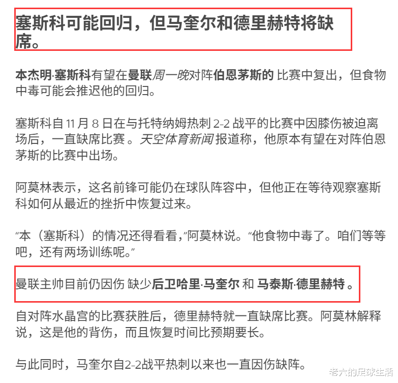 但本场比赛可以确定的是马奎尔以及德里赫特都是无法上场的,以及塞斯科本来已经伤愈回归球队了,但上周却因为食物中毒本场比赛可能会推迟回归。